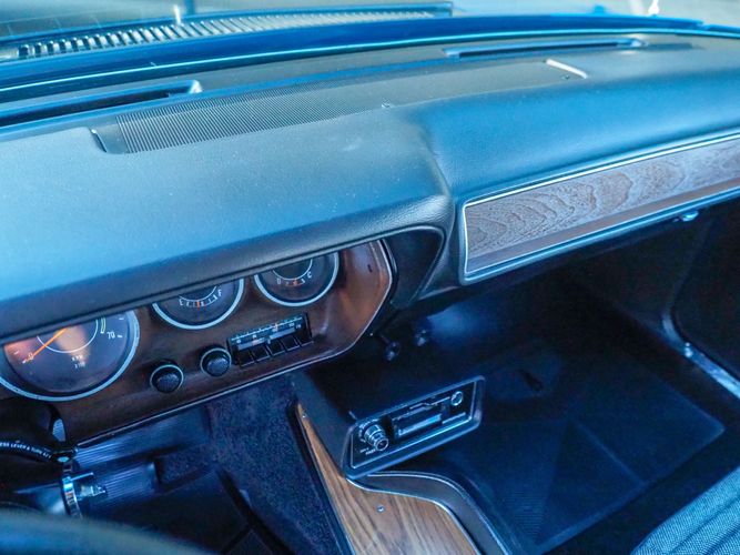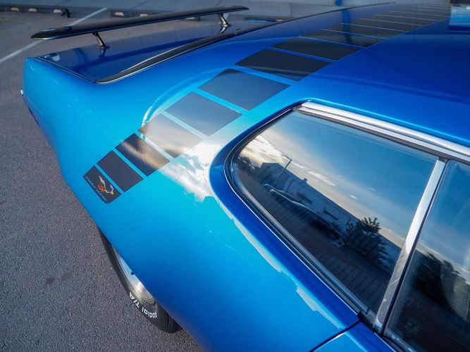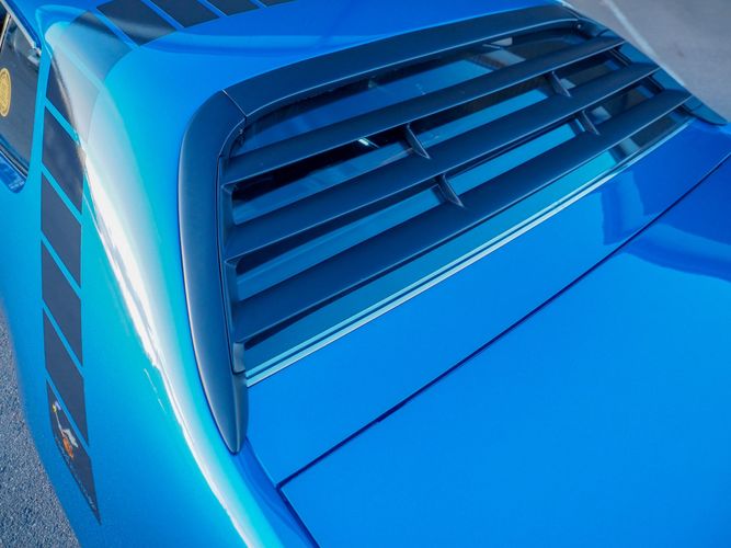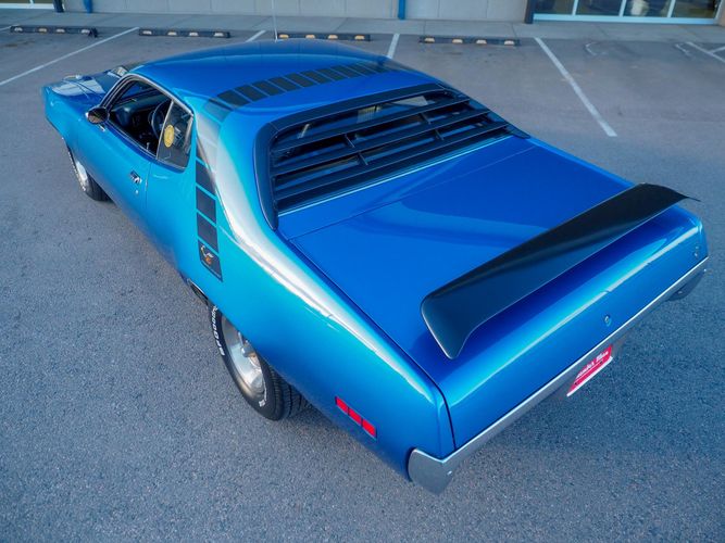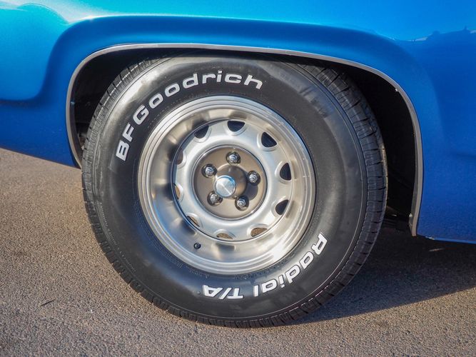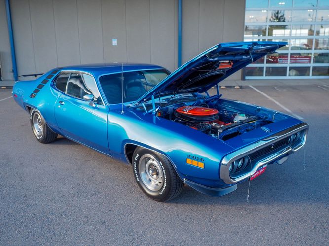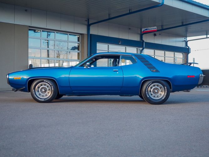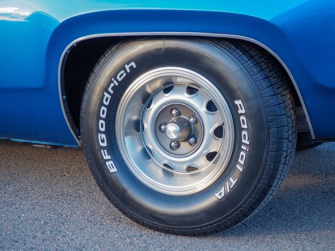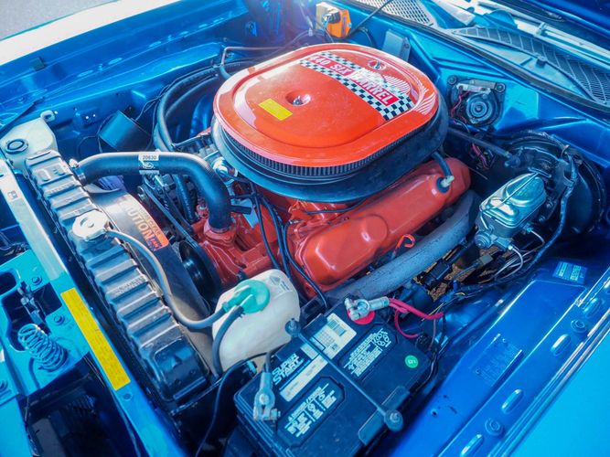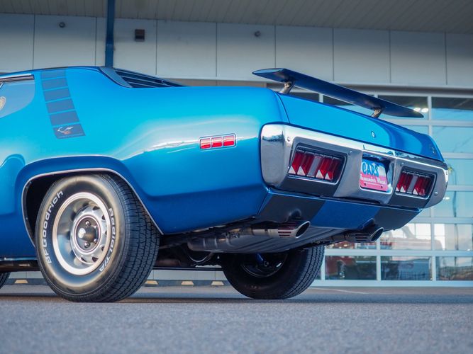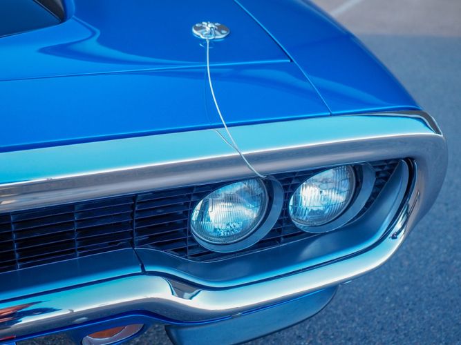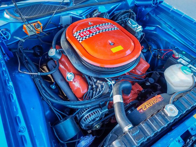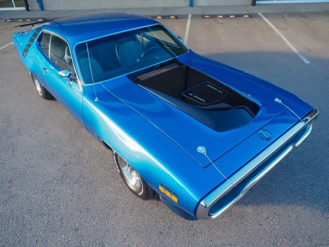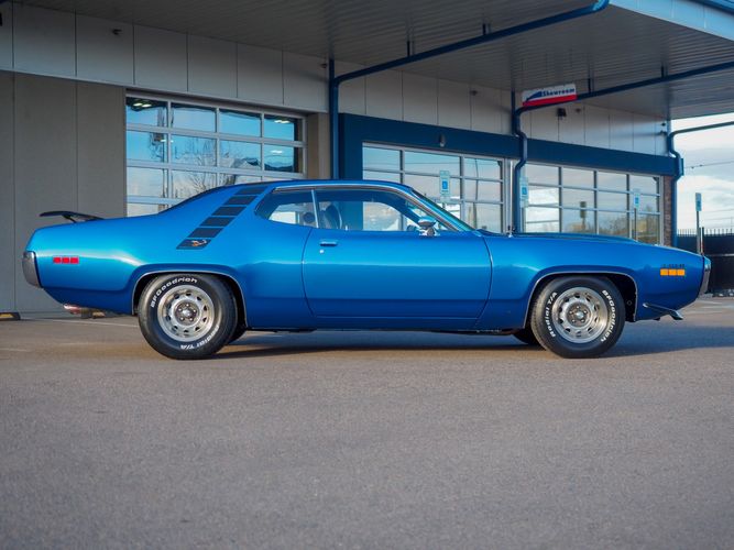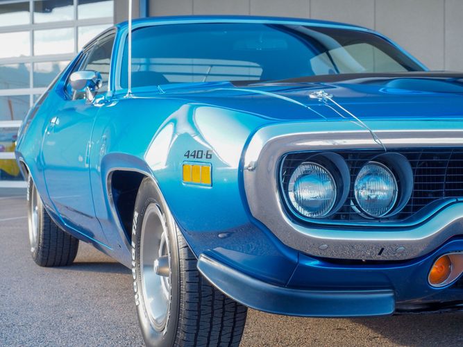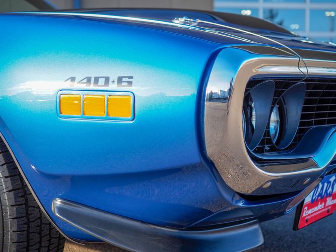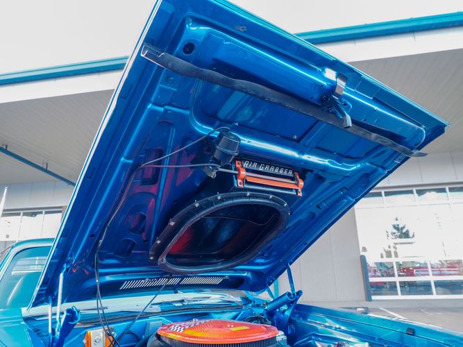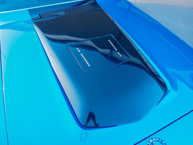This car is painted in the stunning B7 Evening Blue Metallic, which perfectly complements its classic lines and Road Runner graphics. And don't forget about the air grabber hood, which not only looks great but also provides extra airflow to the engine for even better performance.