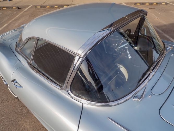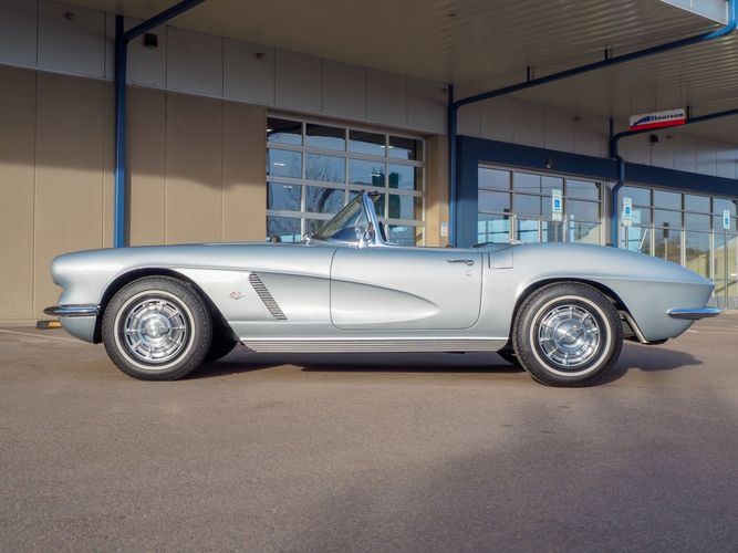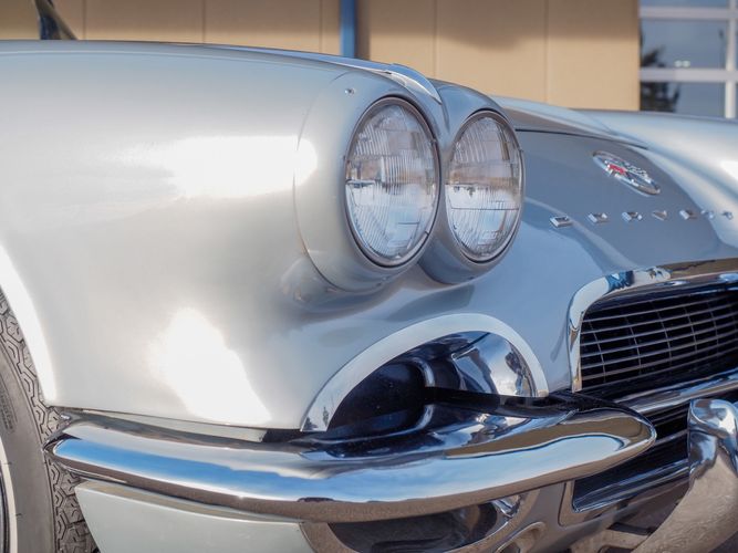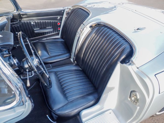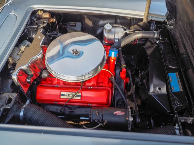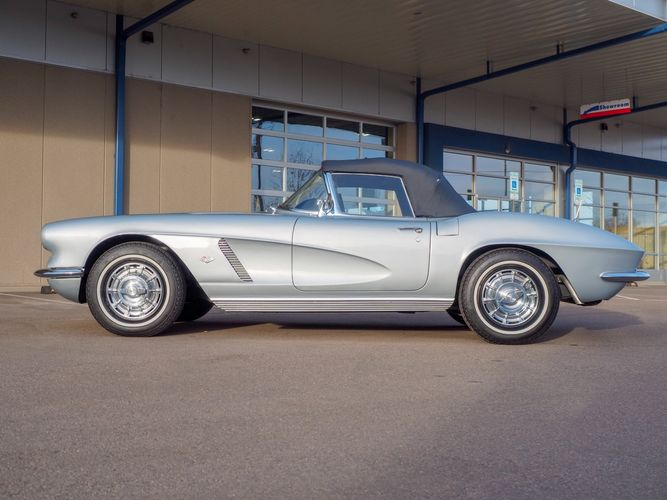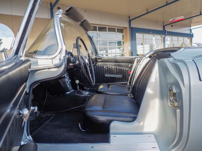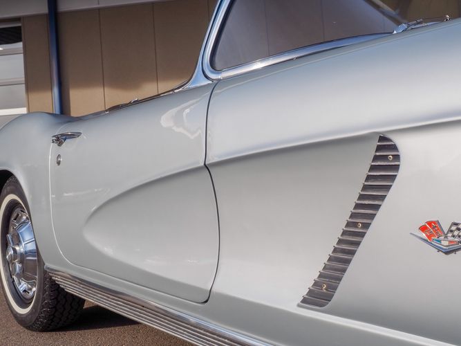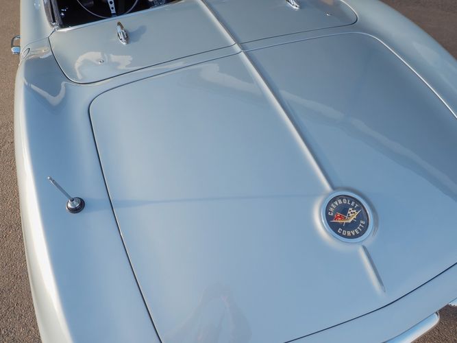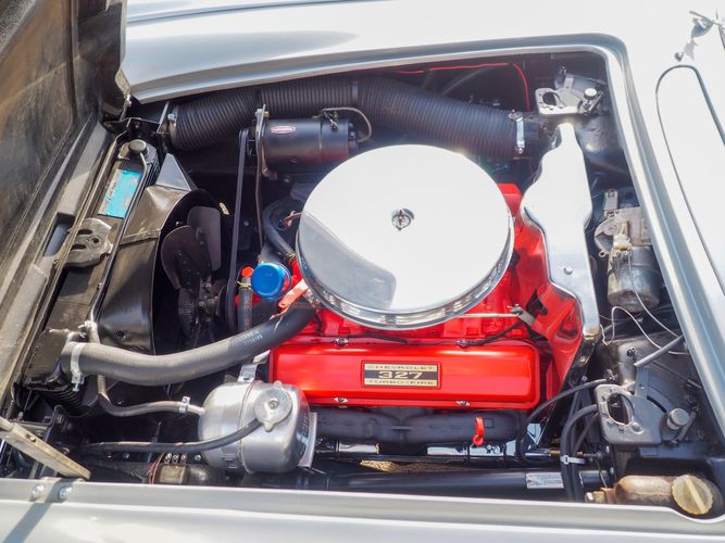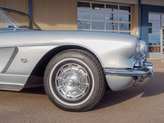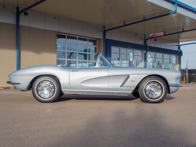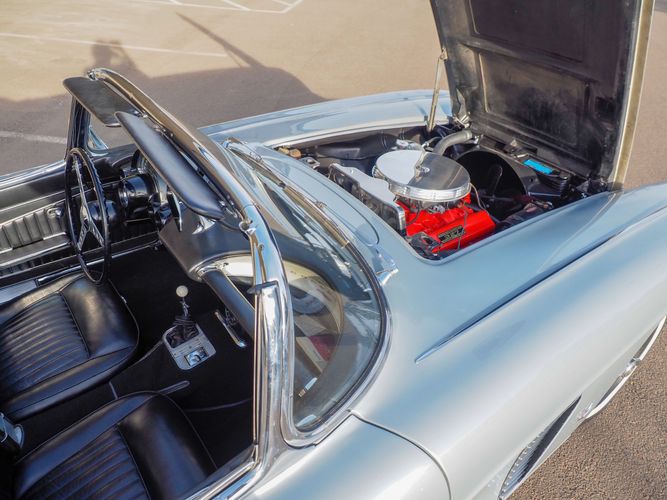 The 1962 Corvette is the last year for the C1 generation of cars. It features a sleek fiberglass body with dual headlights and stylish hub caps with whitewall tires. The paint is finished in a beautiful Sateen Silver. Under the hood, you will find a period-correct 327 cubic-inch V8 engine. It was recently taken out of the car and received new exterior seals and was painted. It runs very strong and makes for an exhilarating driving experience paired with the 4-speed transmission. The suspension consists of a front independent system and a solid rear axle. Drum brakes are on all 4 wheels. The interior has a driver-focused layout with a simple and functional design. It featured bucket seats, a dashboard with a speedometer, and a 5,500 redline tachometer.
