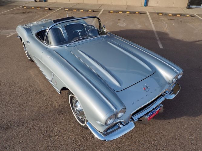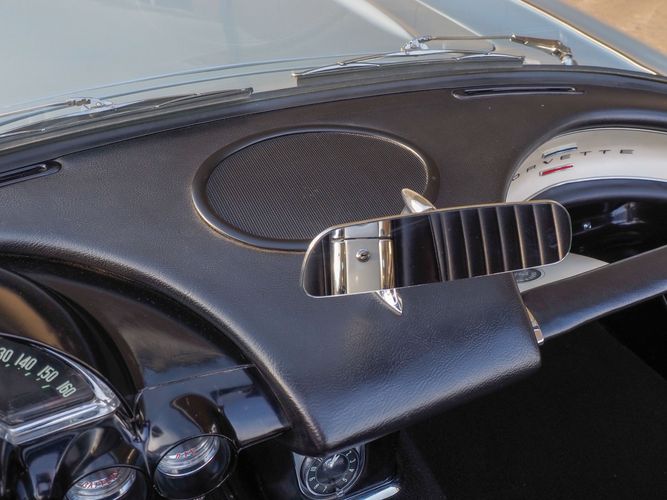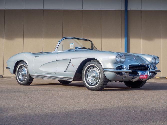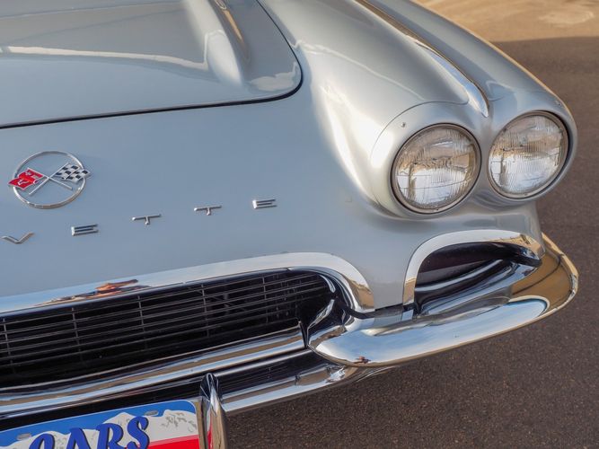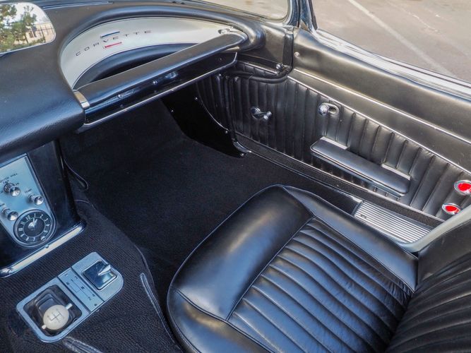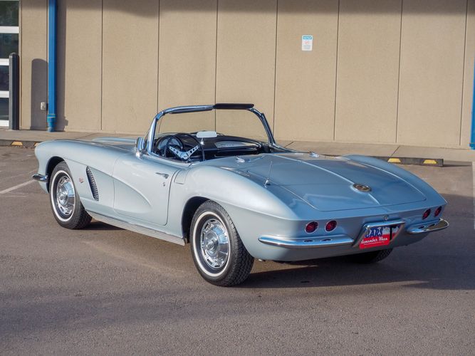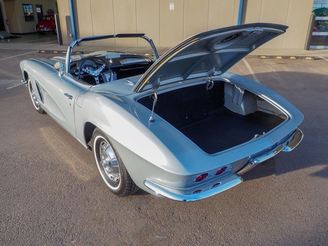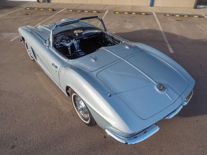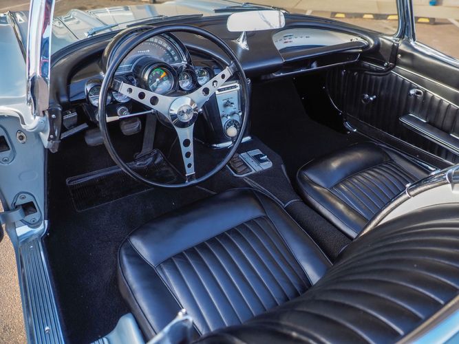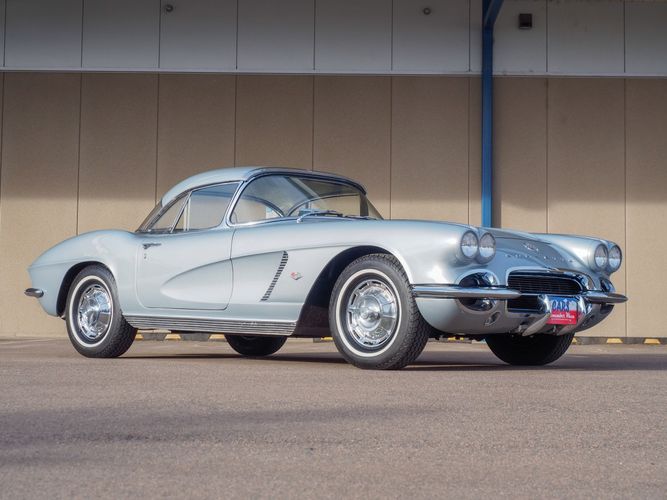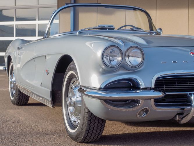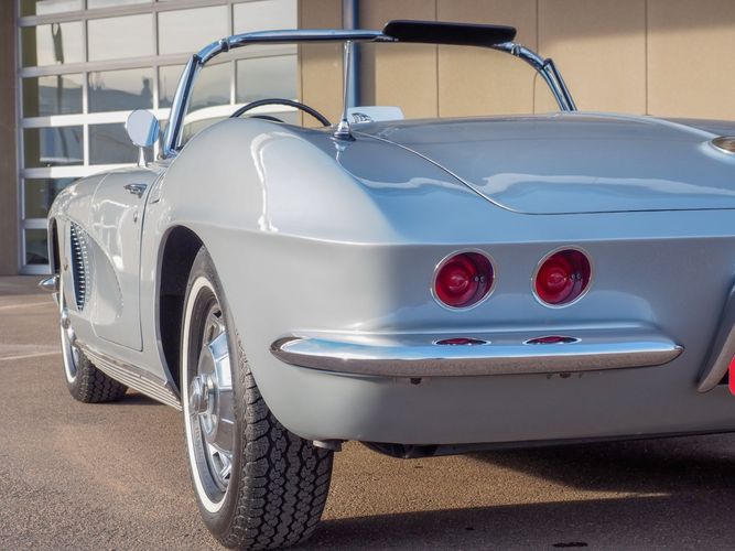 The 1962 Corvette is the last year for the C1 generation of cars. It features a sleek fiberglass body with dual headlights and stylish hub caps with whitewall tires. The paint is finished in a beautiful Sateen Silver. Under the hood, you will find a period-correct 327 cubic-inch V8 engine. It was recently taken out of the car and received new exterior seals and was painted. It runs very strong and makes for an exhilarating driving experience paired with the 4-speed transmission. The suspension consists of a front independent system and a solid rear axle. Drum brakes are on all 4 wheels. The interior has a driver-focused layout with a simple and functional design. It featured bucket seats, a dashboard with a speedometer, and a 5,500 redline tachometer.