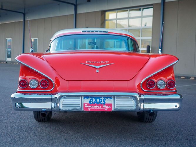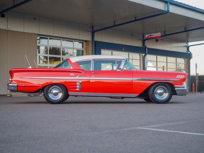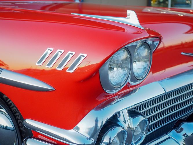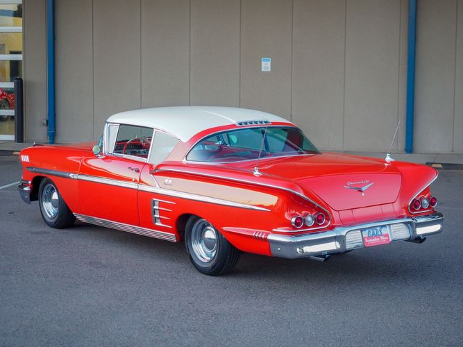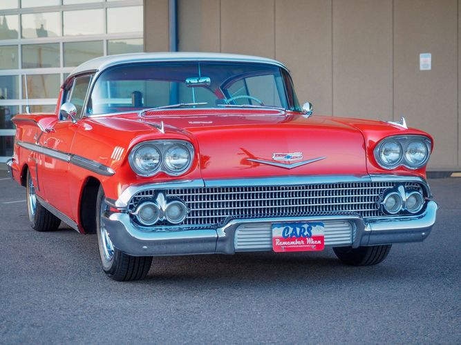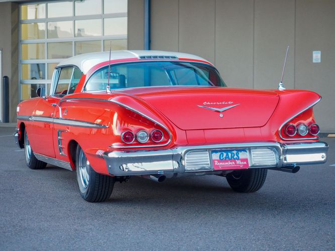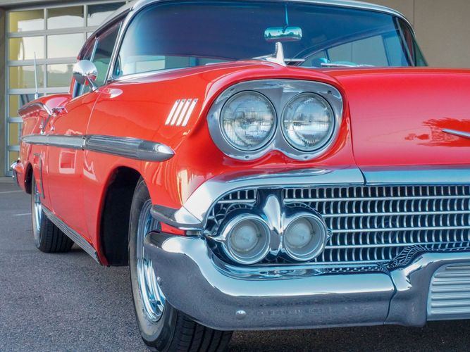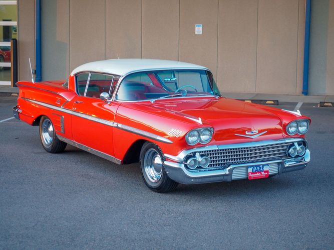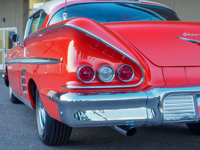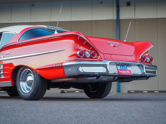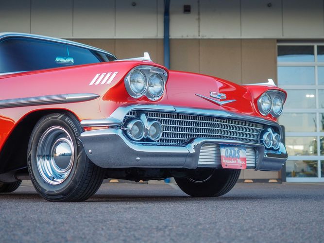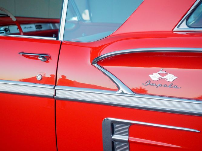 The 1958 Impala featured a distinctive and flamboyant design characterized by its large, curvaceous body and prominent tail fins. It was part of the "X" frame generation of the Impala series, which was produced from 1958 to 1964. The '58 Impala showcased the bold styling of the late 1950s with its broad front grille, dual headlamps, and chrome accents.
