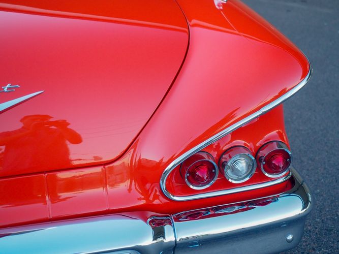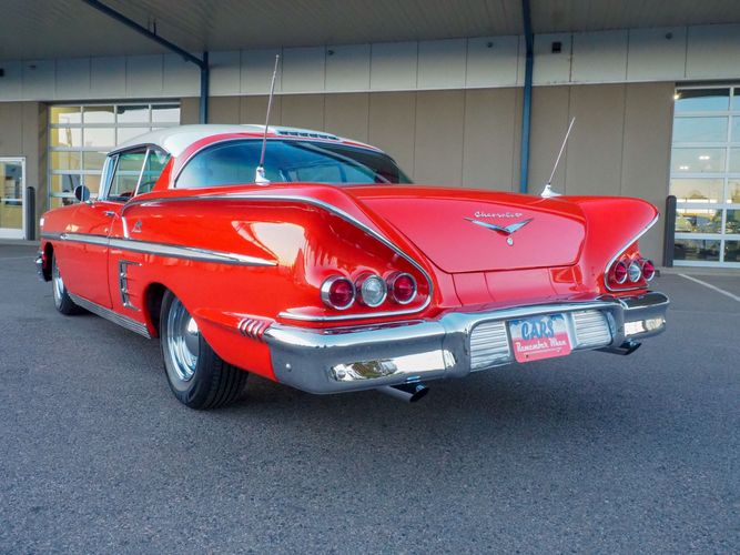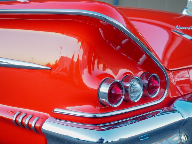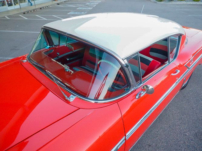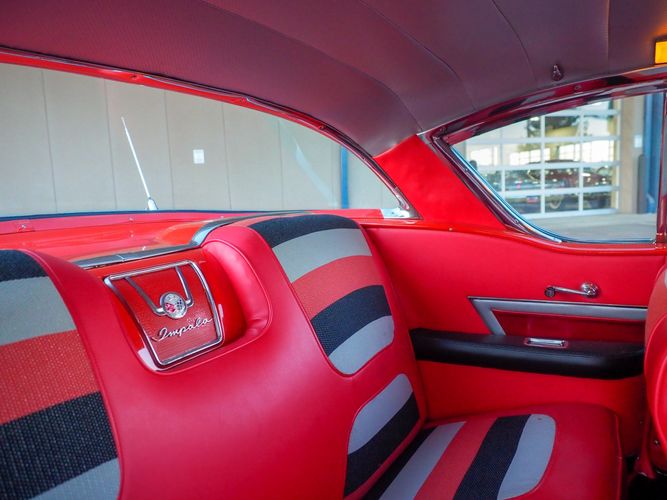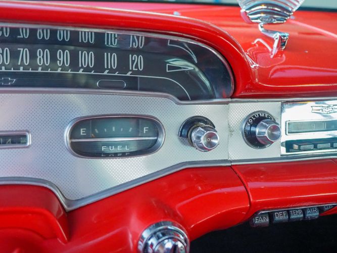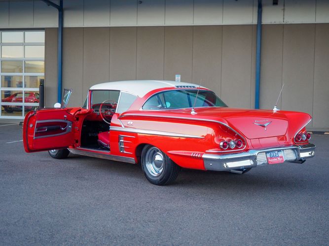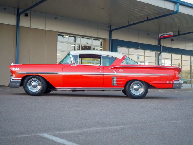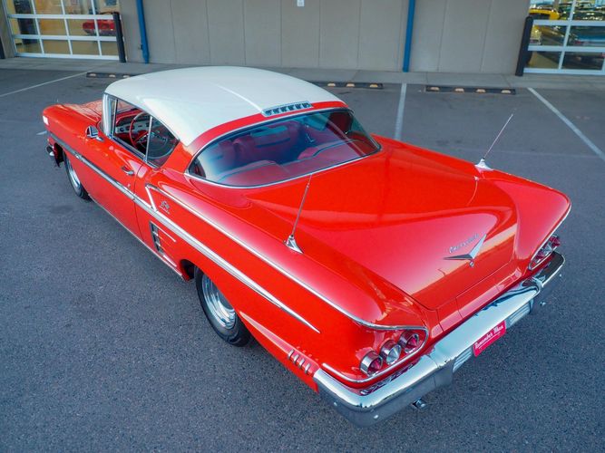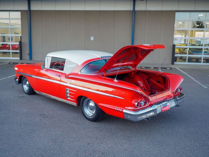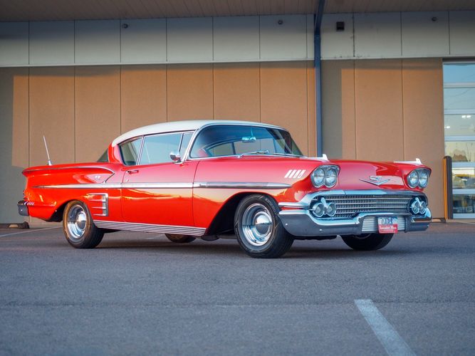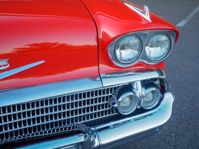 The 1958 Impala featured a distinctive and flamboyant design characterized by its large, curvaceous body and prominent tail fins. It was part of the "X" frame generation of the Impala series, which was produced from 1958 to 1964. The '58 Impala showcased the bold styling of the late 1950s with its broad front grille, dual headlamps, and chrome accents.