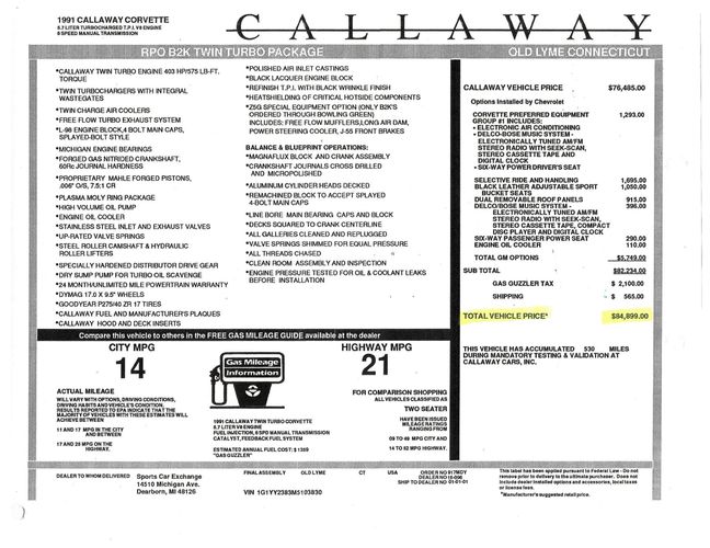 This 1991 Chevrolet Corvette Callaway Coupe is now proudly offered for sale by Cars Remember When Auto Sales. This vehicle was modified by Callaway Engineering in Connecticut with the B2K Callaway Twin Turbo package and AeroBody equipment. The plaque on the dash shows this is car number 002 out of total production of 62 for 1991 and currently showing 7,989 original miles. It is powered by a Callaway twin-turbocharged 5.7-liter L98 V8 mated to a 6-speed manual transmission making 403 horsepower and 575 lb-ft of torque. Chevrolet options include dual removable roof panels, air conditioning, a Delco/Bose stereo, selective ride and handling, dual adjustable sport seats, and an engine oil cooler.