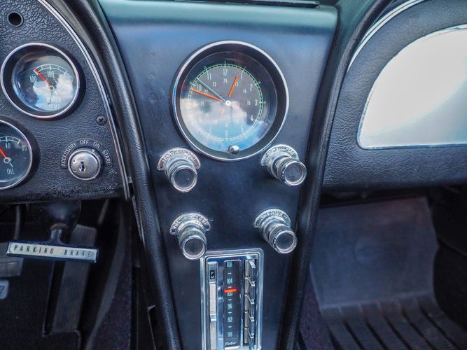 The interior features black bucket seats with a console. This Corvette is optioned with the seldom seen power windows for easy window operation (no more cranking). As well as an original-style radio and a 6500 RPM redline tachometer.