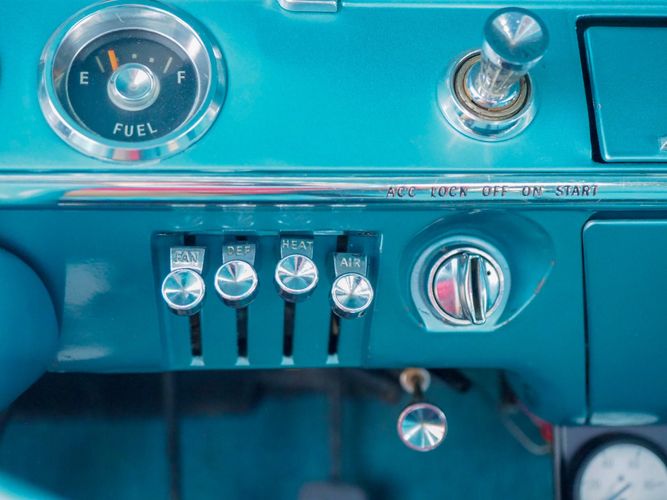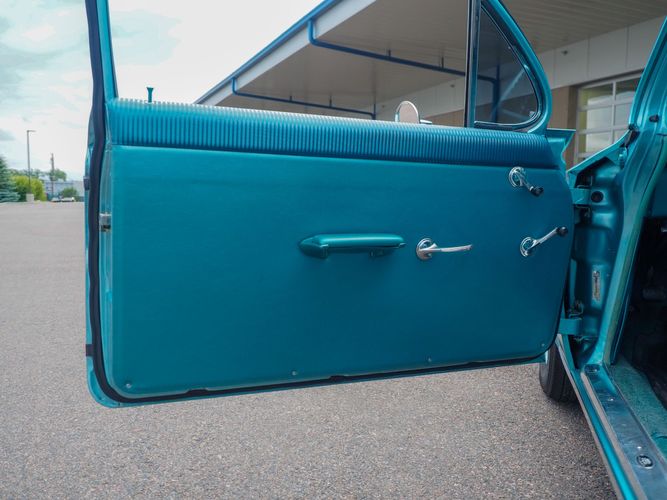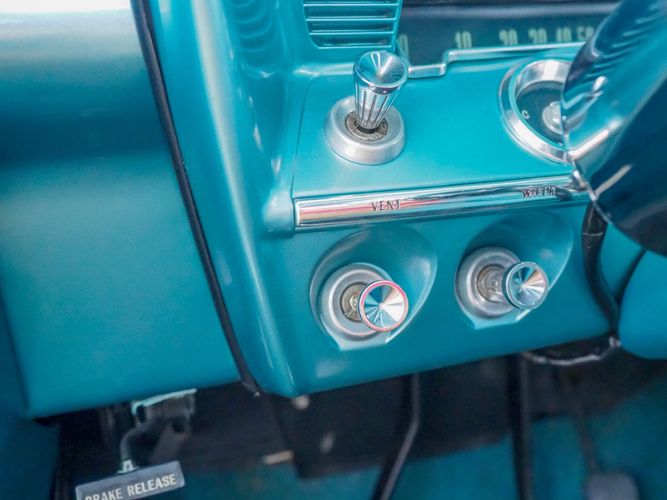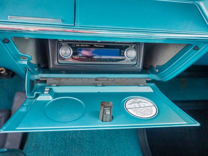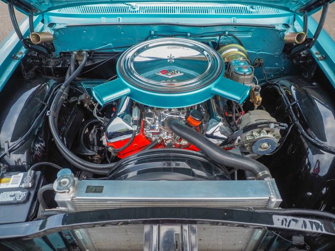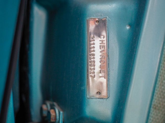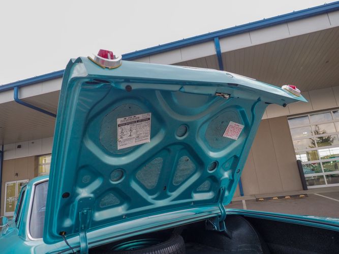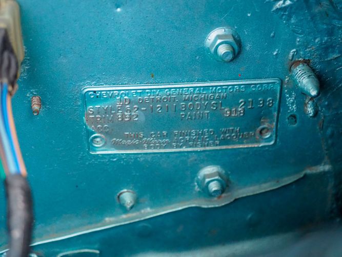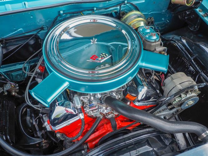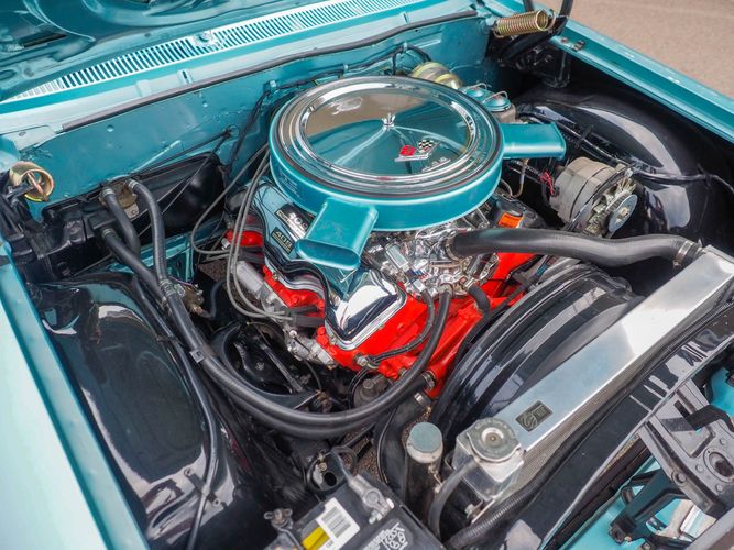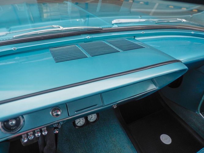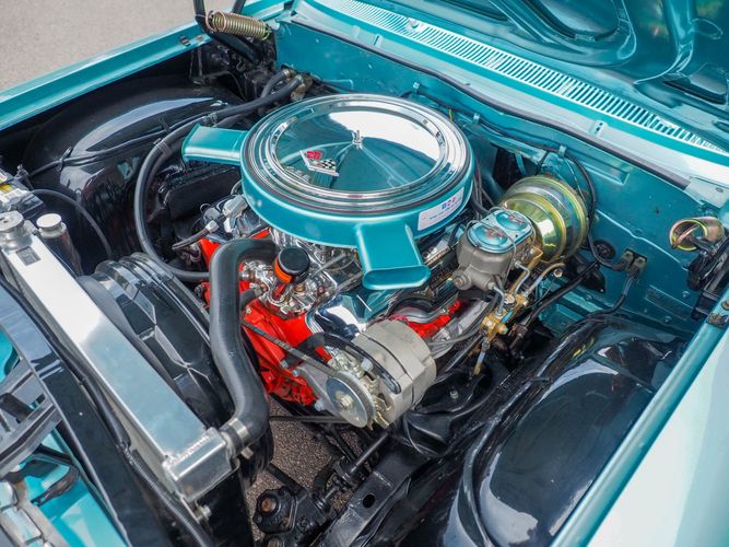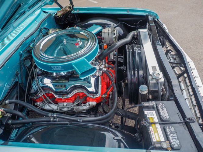 Under the hood, you will find an engine made to look like a 409 dual-quad engine with the dipstick on the right-hand side. The casting number for the engine decodes to a 348 engine. It runs very strong and has a period-correct sound coming from the dual exhaust. A recently rebuilt Muncie transmission and new clutch are installed and work perfectly. The heater is hooked up and does operate. Also equipped with power brakes.
