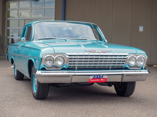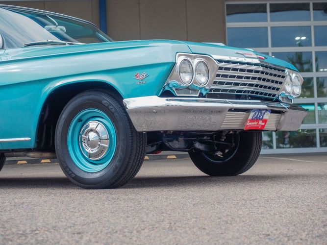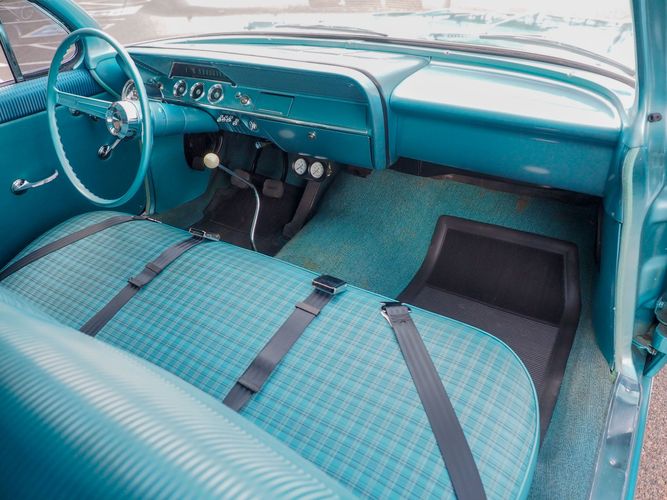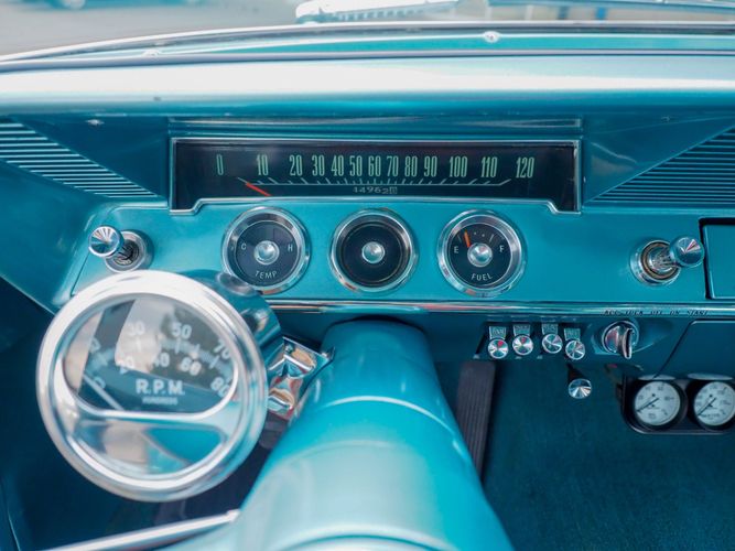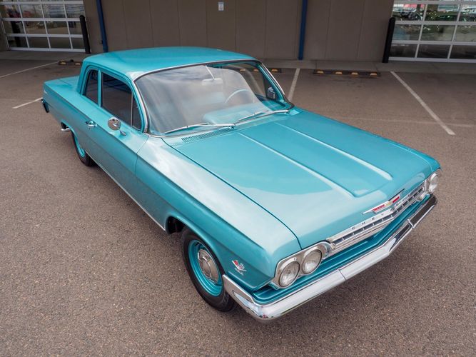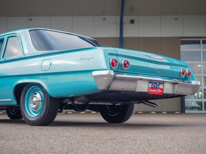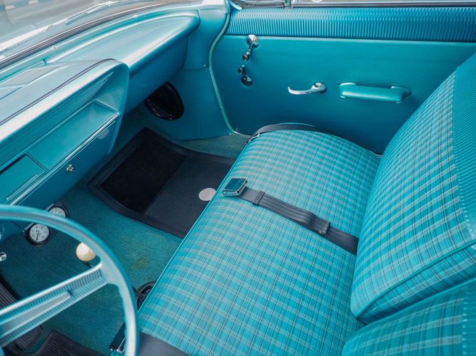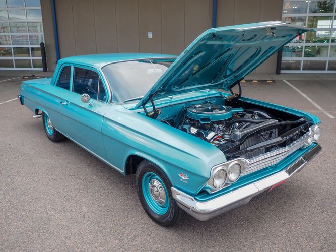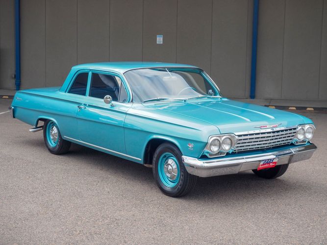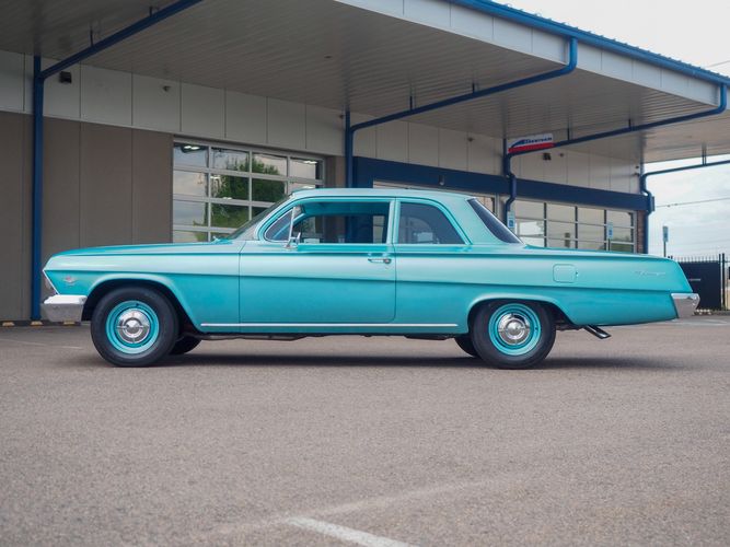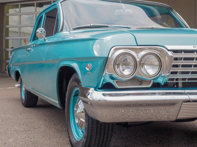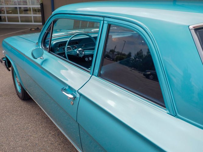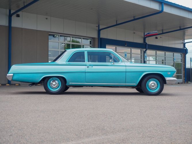 Check out this restored 1962 Chevrolet Biscayne made into a 409 clone. It is finished in a repaint of its original color Twilight Blue with an original style Aqua bench seat interior. The paint, body, and bright work are in excellent condition and have an amazing shine.