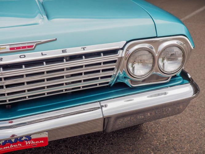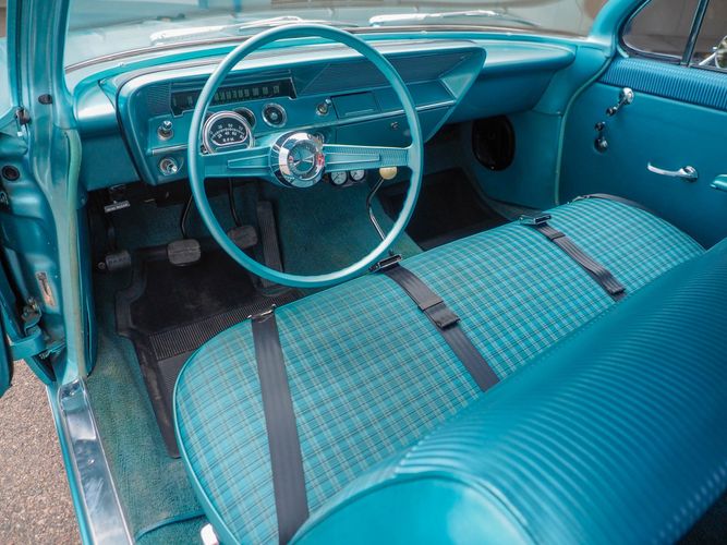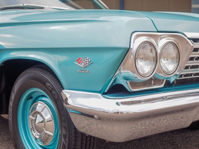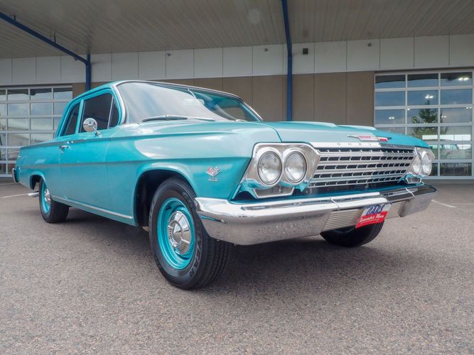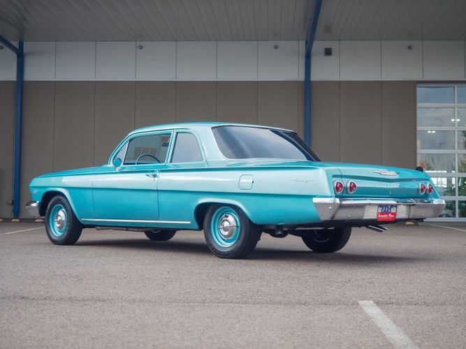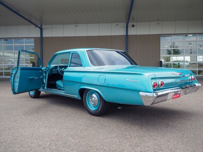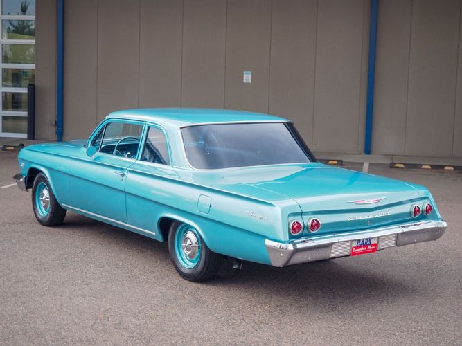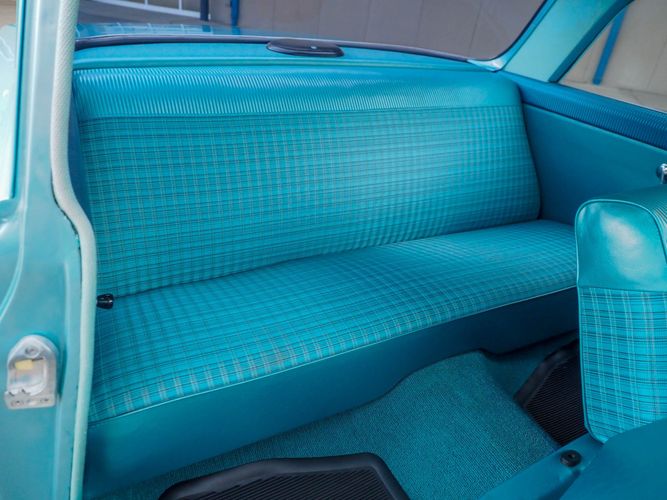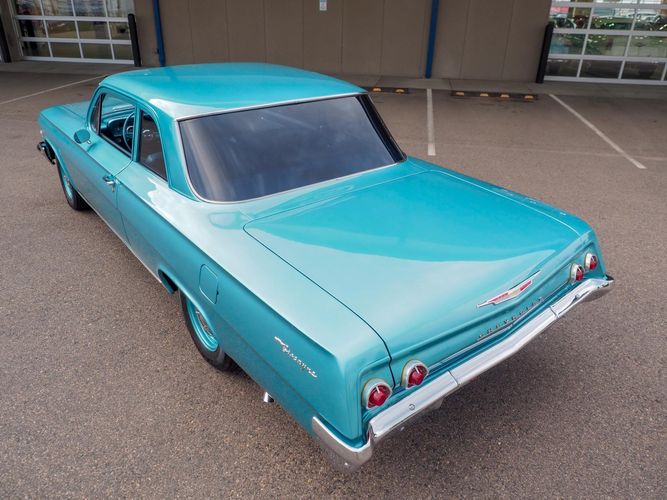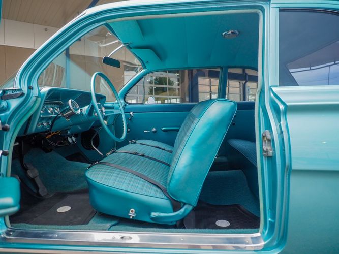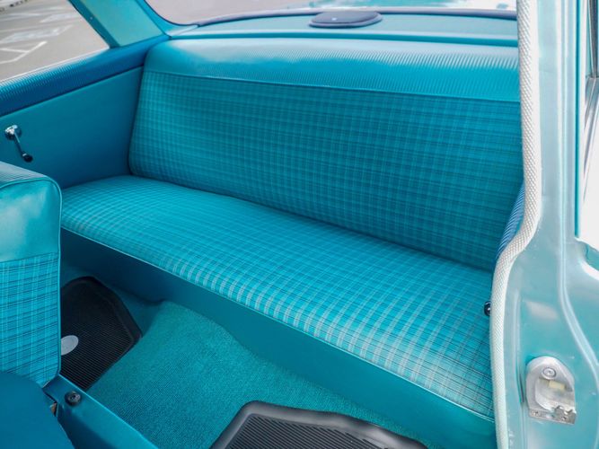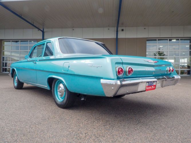 Check out this restored 1962 Chevrolet Biscayne made into a 409 clone. It is finished in a repaint of its original color Twilight Blue with an original style Aqua bench seat interior. The paint, body, and bright work are in excellent condition and have an amazing shine.