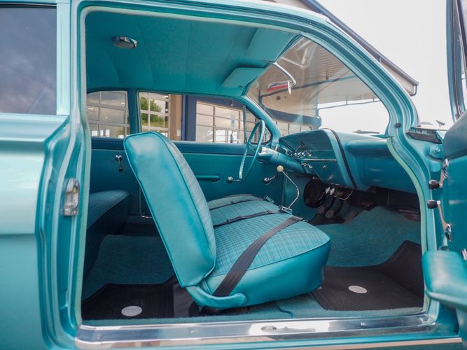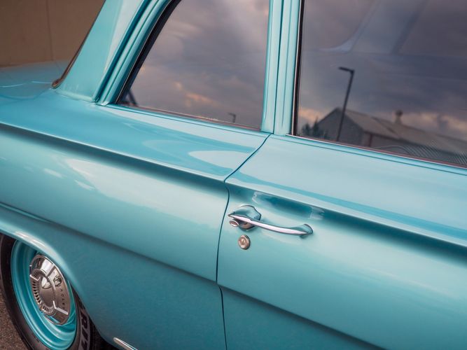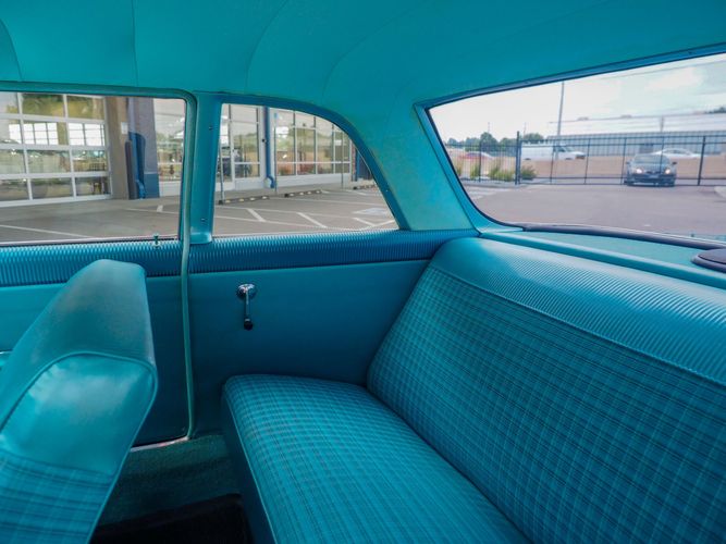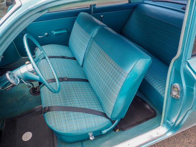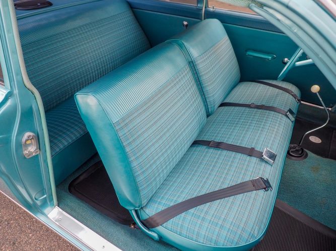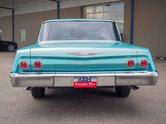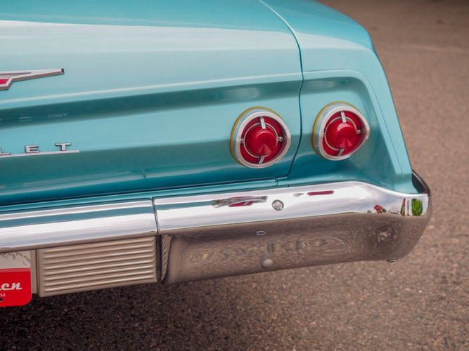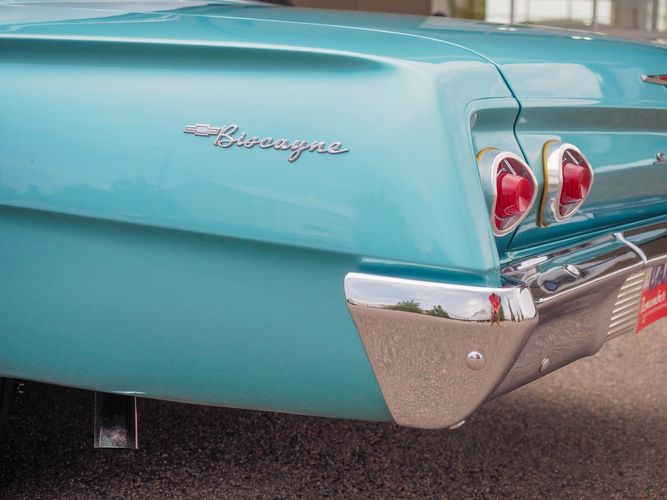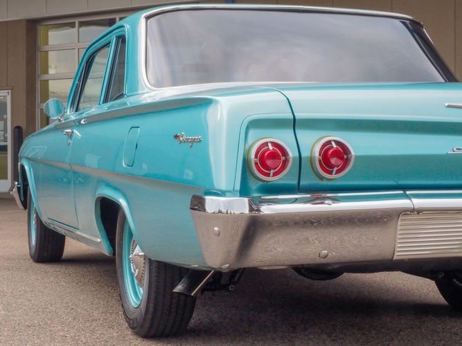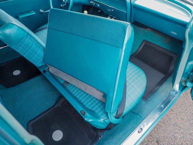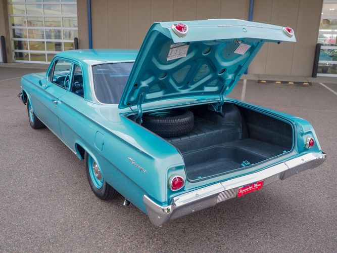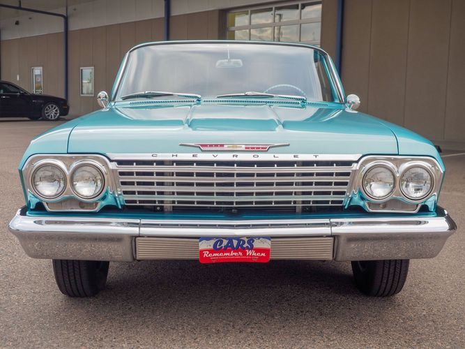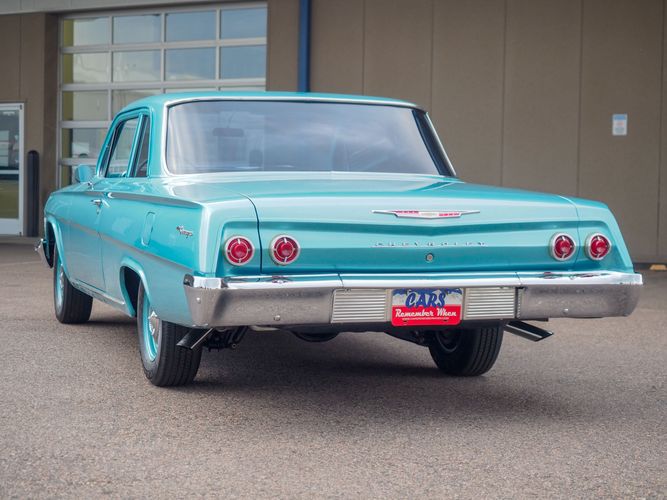 Check out this restored 1962 Chevrolet Biscayne made into a 409 clone. It is finished in a repaint of its original color Twilight Blue with an original style Aqua bench seat interior. The paint, body, and bright work are in excellent condition and have an amazing shine.