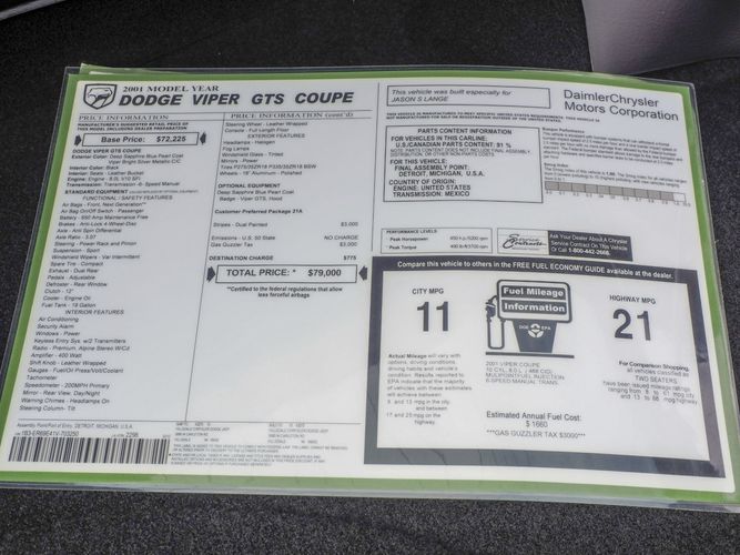 Excellent 2001 Dodge Viper GTS Coupe with 3,001 Original Miles