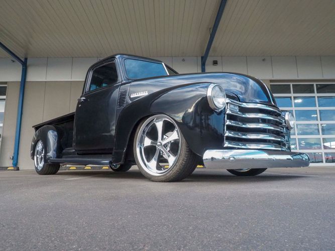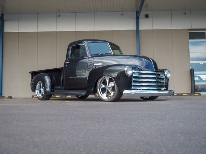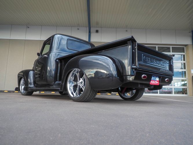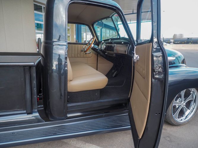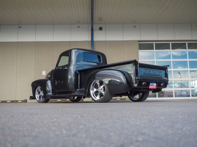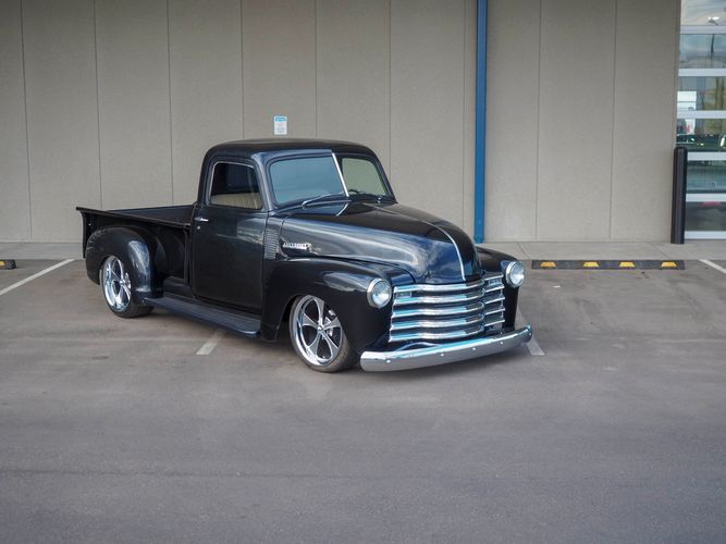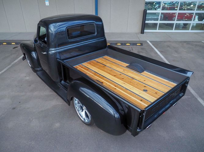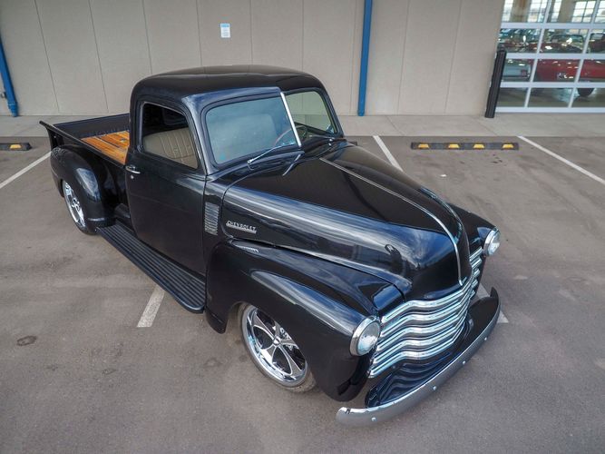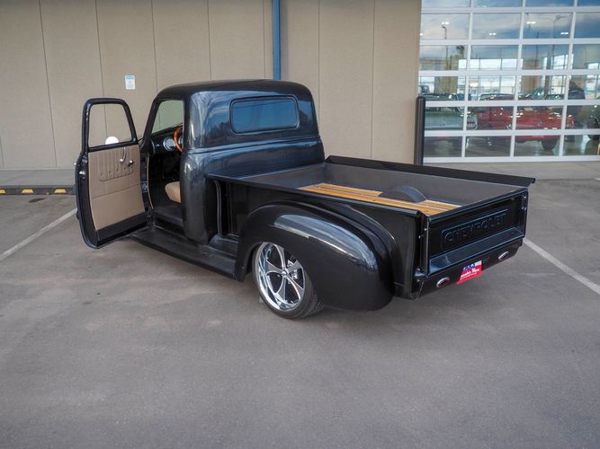 This 1947 Chevrolet 3100 pickup is drop-dead gorgeous and a head turner anywhere it goes! Finished in a beautiful Cadillac Black Pearl paint and lowered on 20'' chrome wheels this car has a sinister stance with nice curb appeal and features to back it up. Equipped with a 350 cubic inch V8, power brakes, front disc, and power steering make this truck fun and easy to drive. The brake master cylinder has been relocated to the firewall for better reliability and service. The wood bed is nicely done up above the fender wells for a clean finish. Both doors fit nice and close with ease. The custom interior is nicely done with custom gauges, a vinyl bench seat, new carpet, and door panels. The 350 engine has a nice size cam in it to give it a decent rumble at idle and good performance. This pickup sounds MEAN. Please see the video on our website to hear it for yourself! CALL TODAY 720-465-5104