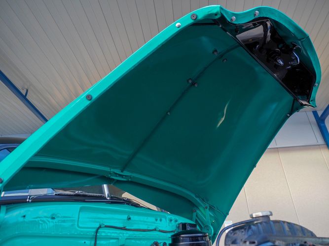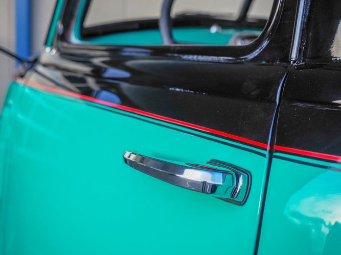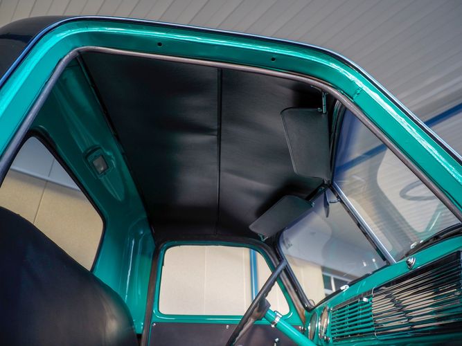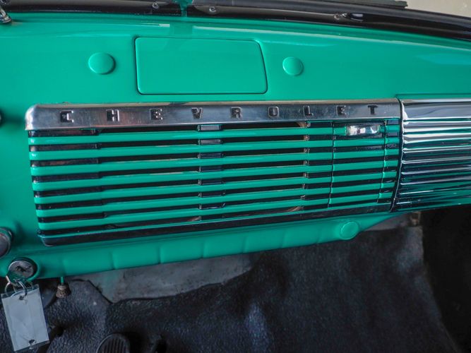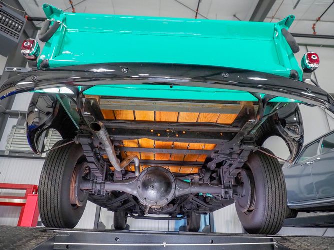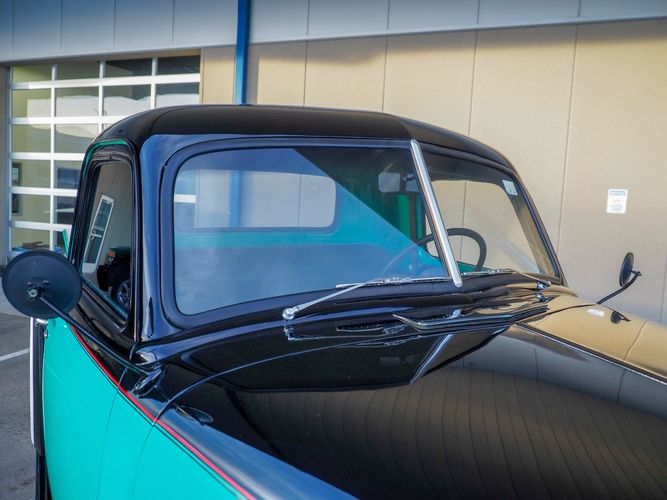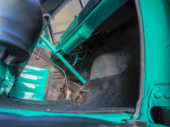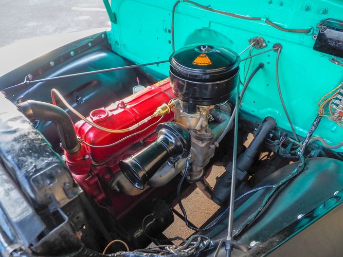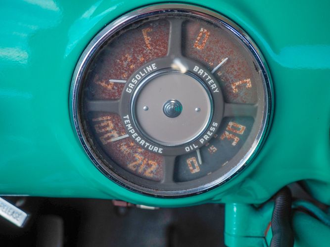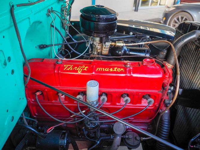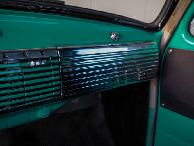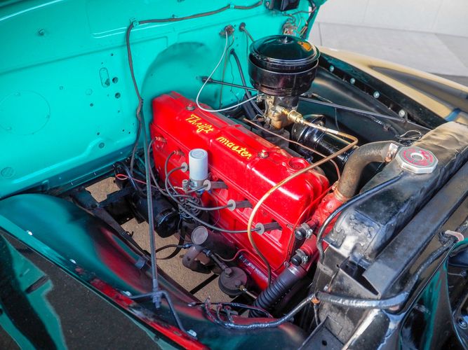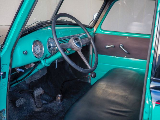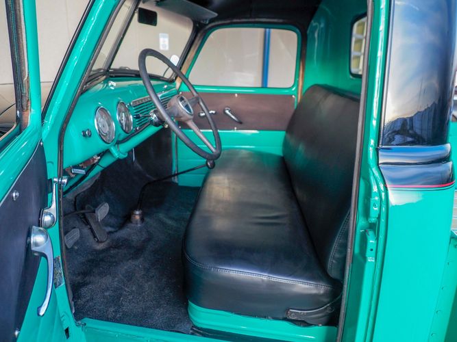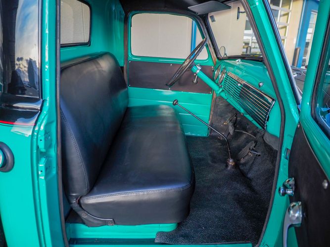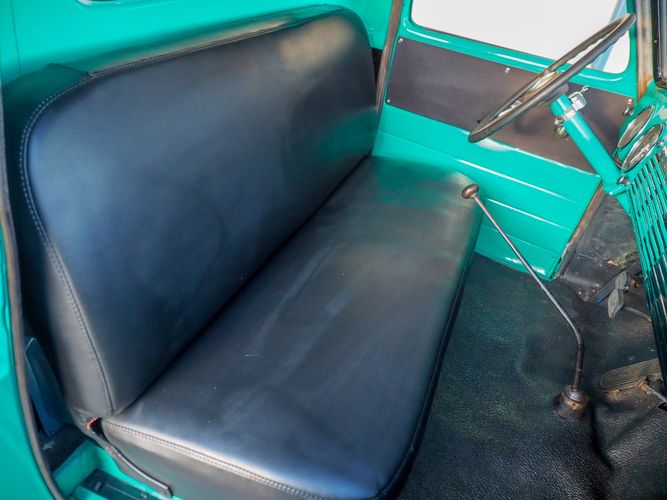 The interior is nicely restored with a new black vinyl bench seat, small door panels and a vinyl floor covering. The dash and inside of the doors were painted the same green color as the body and really pops. Sitting inside brings you back to a time when interiors were very minimal and did not have all the modern thrills were used to today. Gauges include a speedometer, coolant temperature, oil pressure and amperage gauge.