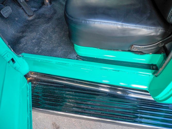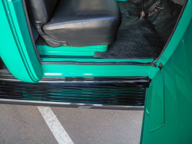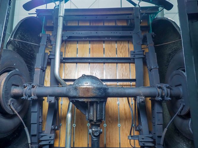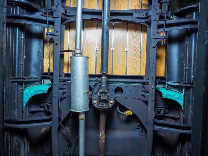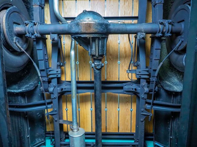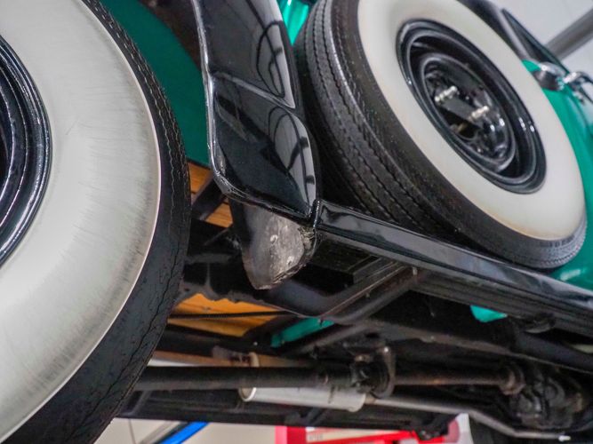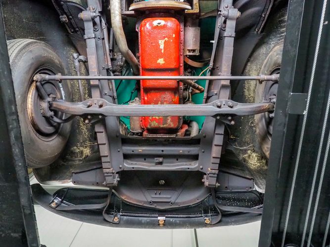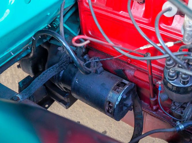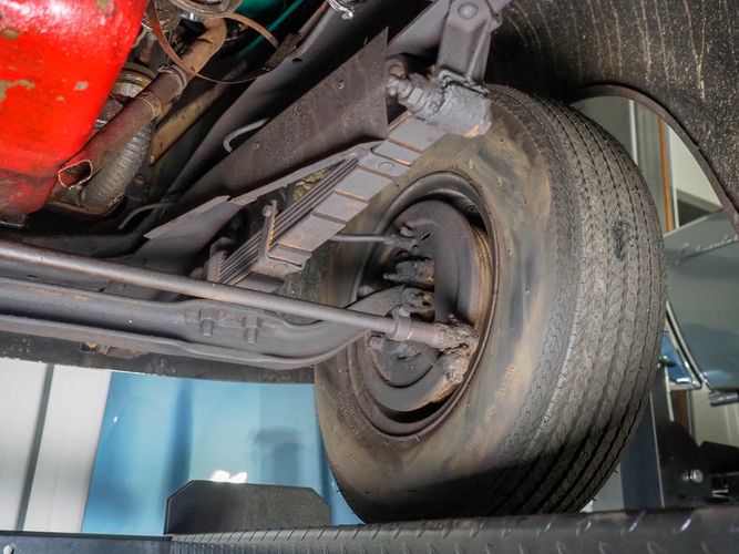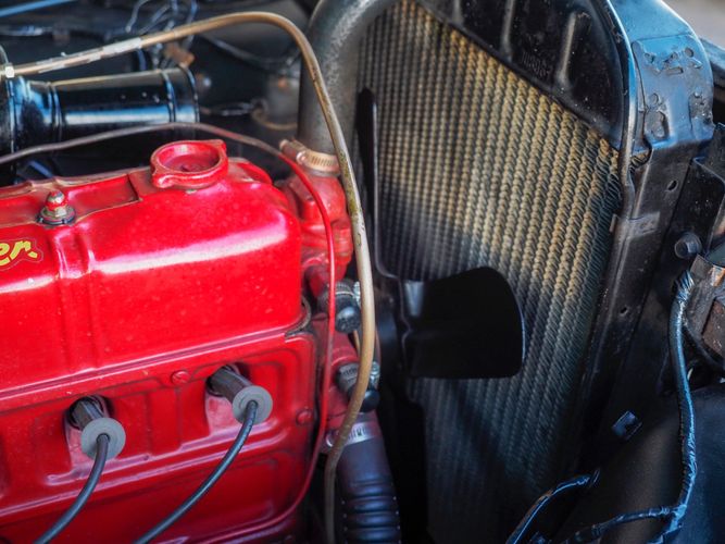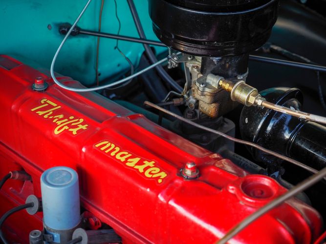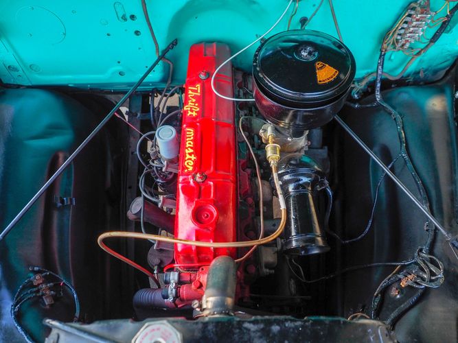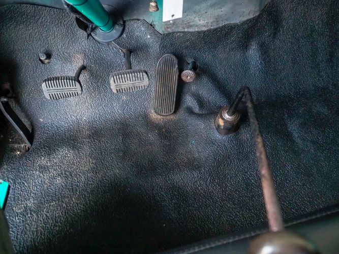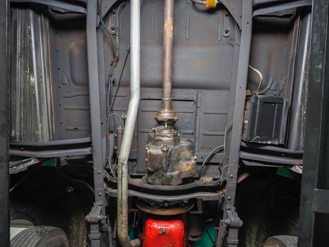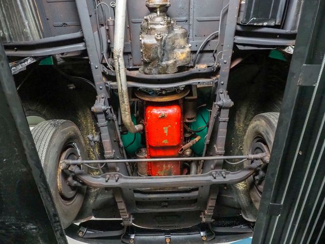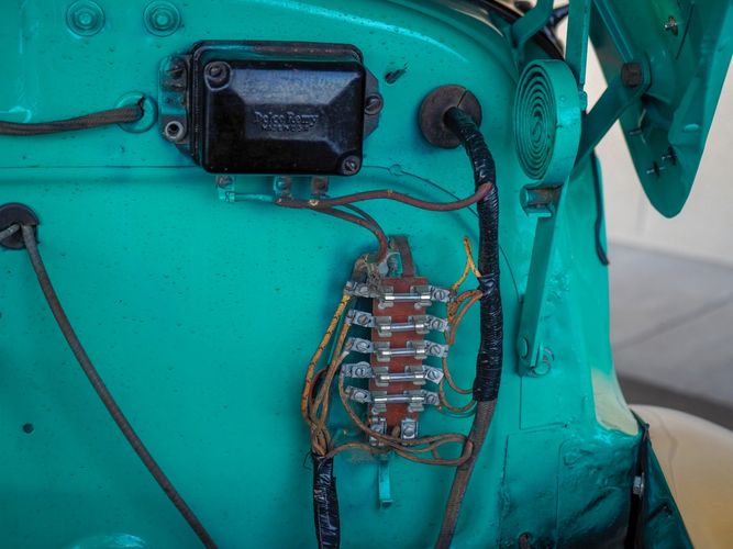 The interior is nicely restored with a new black vinyl bench seat, small door panels and a vinyl floor covering. The dash and inside of the doors were painted the same green color as the body and really pops. Sitting inside brings you back to a time when interiors were very minimal and did not have all the modern thrills were used to today. Gauges include a speedometer, coolant temperature, oil pressure and amperage gauge.