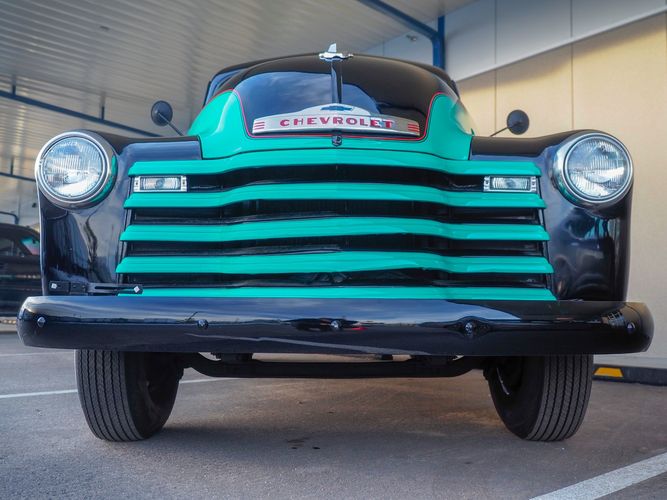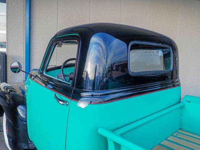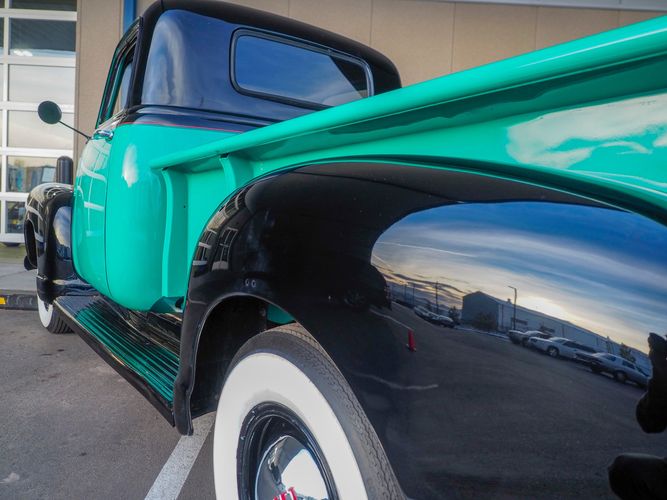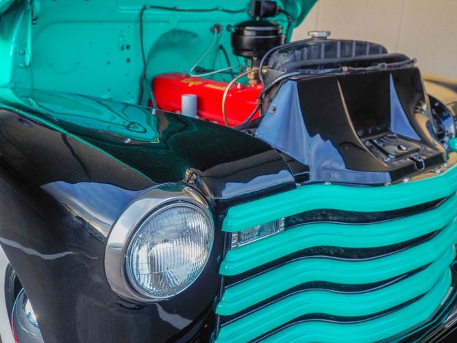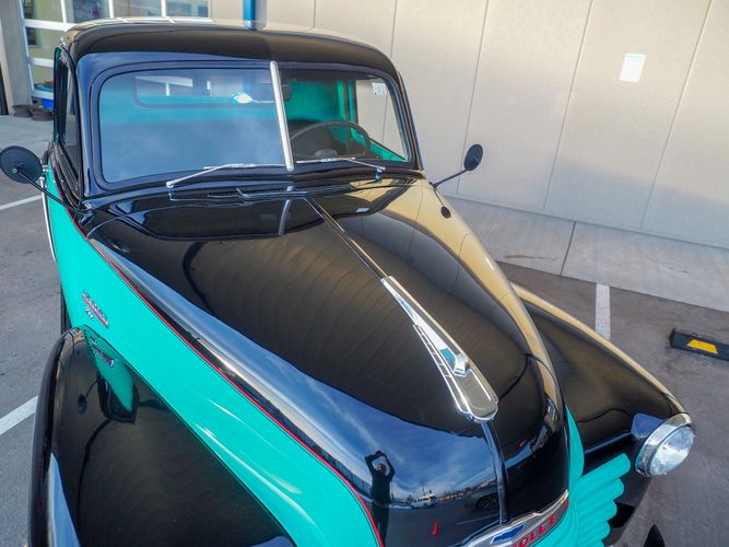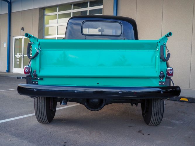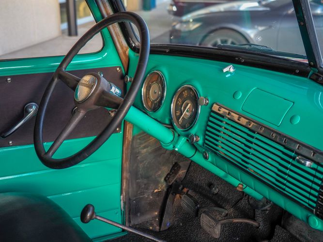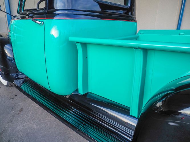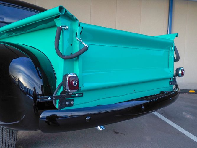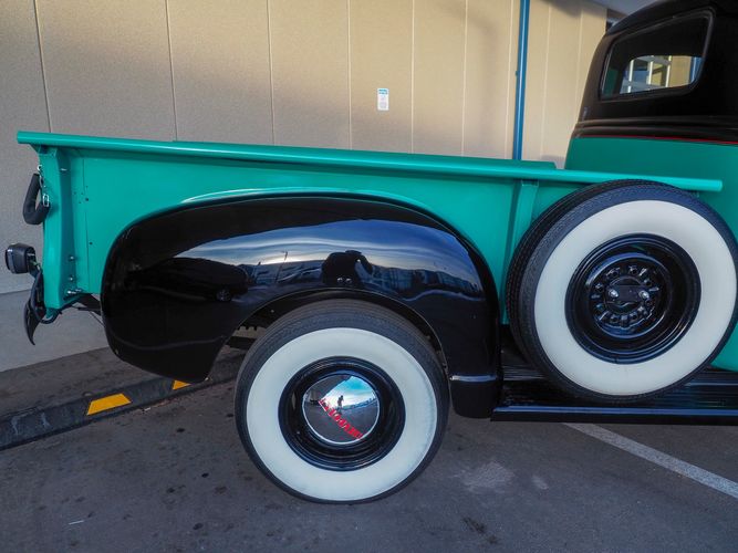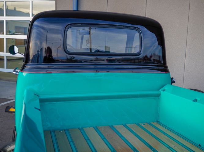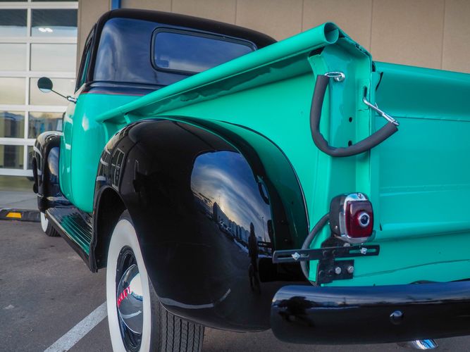 The two-tone green and black paint is a great color scheme for this 49' featuring nice pin stripping, newly chromed hub caps, nice wood bed and very straight original 1949 sheet metal. Upfront, the grille and bumper have been repainted to match the body nicely and give the truck a great look. The 5 window 3600s are highly desirable and hard to find in this great of shape. The undercarriage appears to be lightly restored with all new rubber and is very original. Overall, the body is in excellent shape and the pickup has smoked windows.