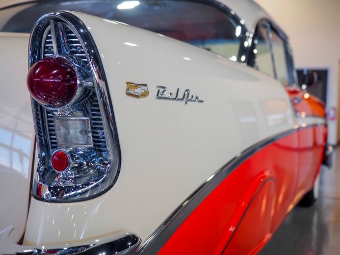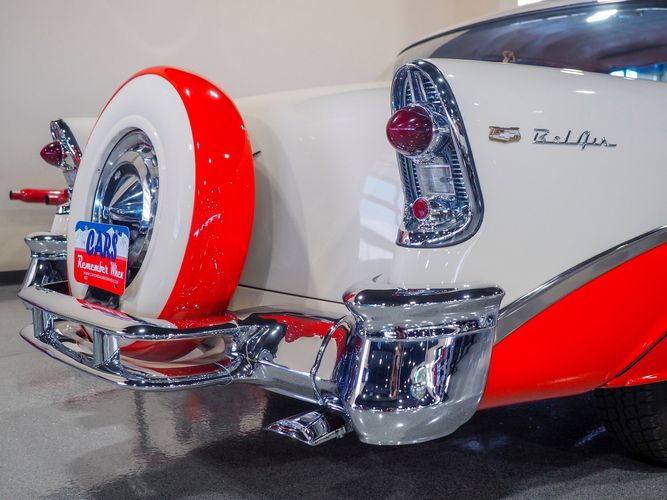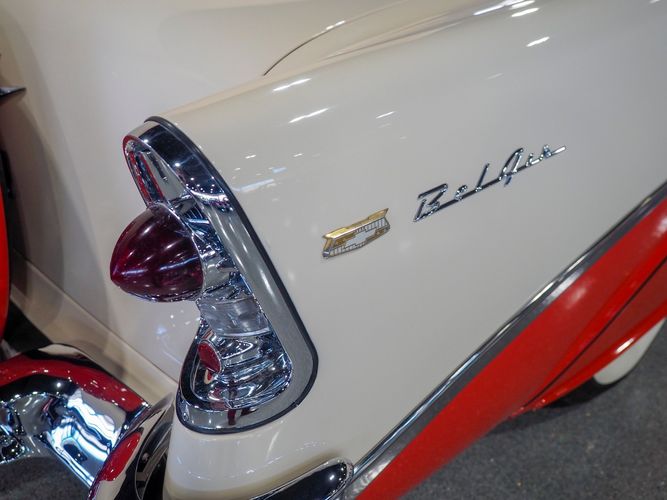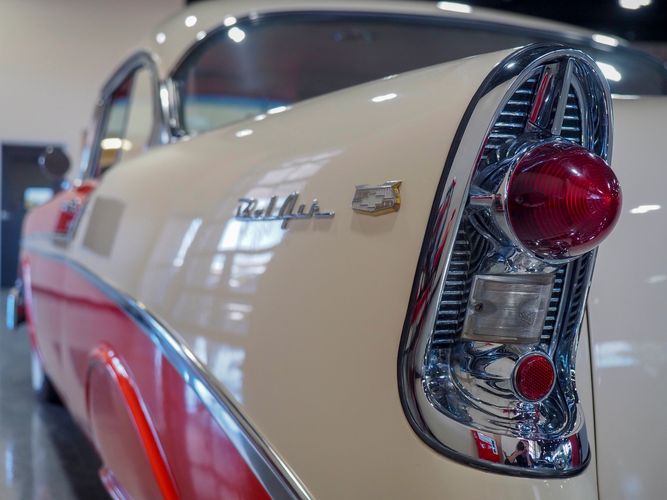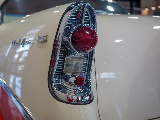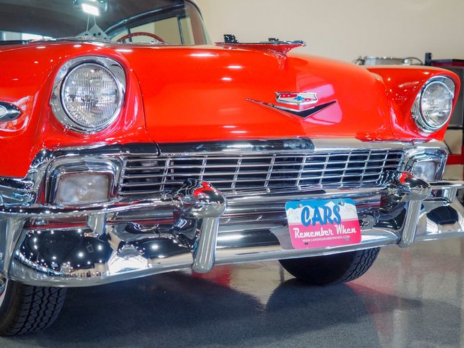 The 1956 Bel Air received a face-lift with a more conventional full-width grille, pleasing those customers who didn't favor the Ferrari-inspired '55 front end. Distinctive two-tone bodyside treatments and graceful front and rear wheel openings completed the "speedline" restyling. Single housings incorporated the taillight, stoplight, and backup light, and the left one held the gas filler - an idea popularized on Cadillacs. Among the seven Bel Air models was a new Sport Sedan, a pillarless four-door hardtop that looked handsome with all the windows rolled down and allowed easy entry into the back seat. Production exceeded 103,000, compared to 128,000 two-door hardtops. Shapely two-door Nomad wagons topped the price chart at $2,608, but now carried the same interior and rear-wheel sheetmetal as other Bel Airs, lacking the original's unique trim. Only 7,886 were built. The least costly Bel Air, at $2,025, was the two-door sedan. Seatbelts, shoulder harnesses, and a padded dashboard were available, and full-size cars could even get the hot Corvette 225-horsepower engine. In 1956 sales material there was an optional rain-sensing automatic top. Popular Mechanics reported only 7.4% of owners in their survey ordered seat belts.