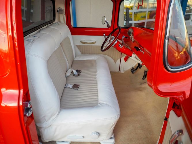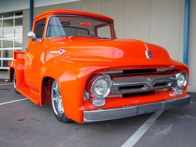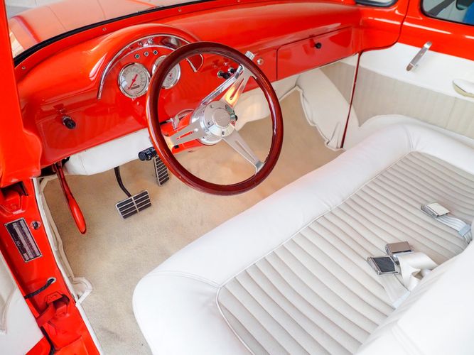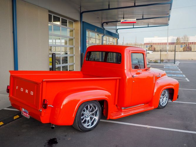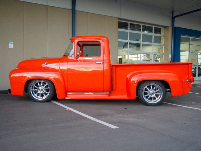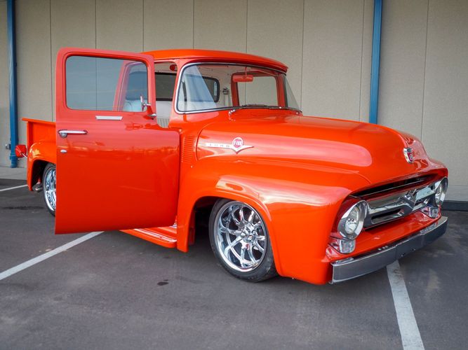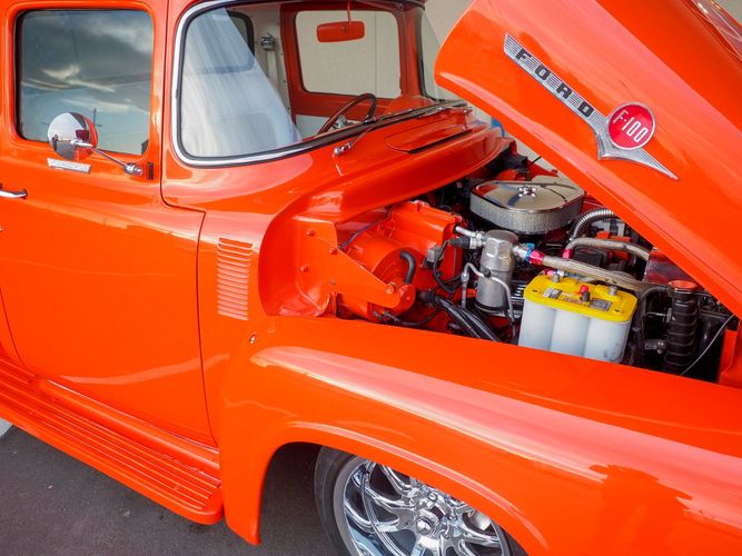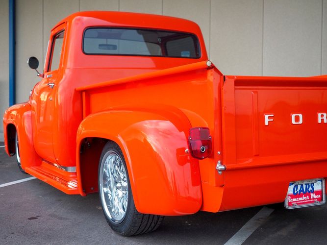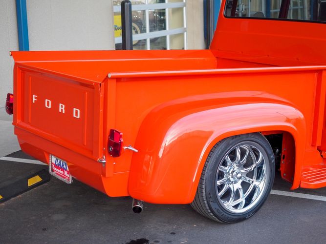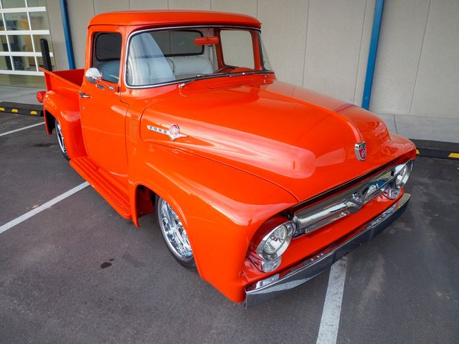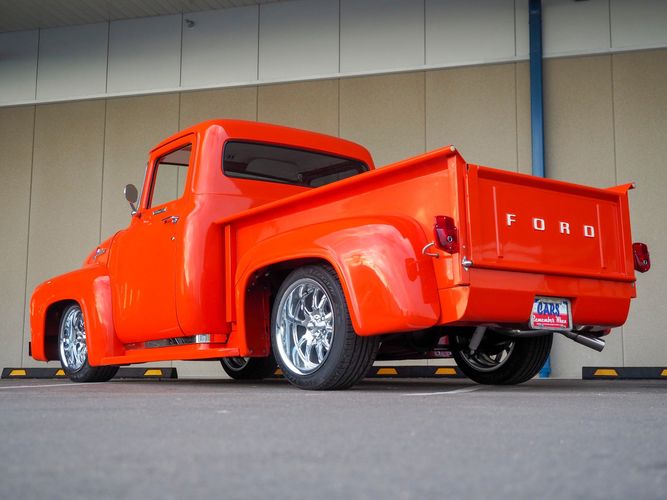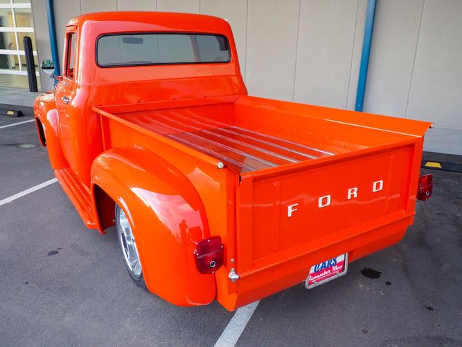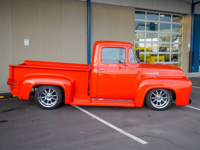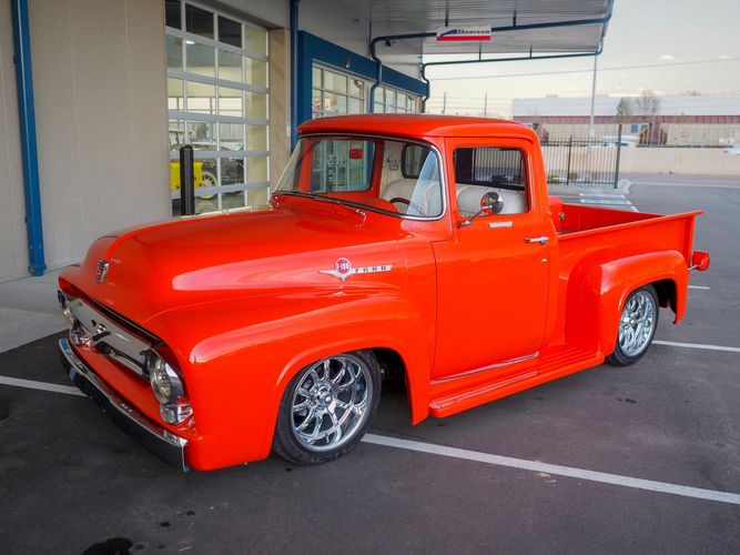 Packed below the 1956 Ford sheet metal is an extensive amount of modern technology including; air conditioning, alarm, remote start, cruise control, ABS power brakes, power windows, automatic door locks when the car is taken in and out of drive, and a modern fuel injected 4.3L V6 paired to a 700R4 overdrive automatic transmission. This Ford F100 is out to get all the right attention everywhere you take it. The PPG burnt orange exterior finish brings out all the body lines and can’t pass by without being noticed. Chrome 18” Ridler wheels compliment the body and stance nicely. This truck features a keyless entry system that makes entering and exiting a breeze. The alarm is a nice addition to keep auto thieves away. The bulletproof fuel injected 4.3L V6 engine runs smooth, is quiet, has plenty of low-end torque and gets 18-20MPG. The extensive creature comforts packed into this truck make it close to a modern car but you still get the feel and style of a 1956 Ford F100! The white interior is nicely done and very comfortable. Featuring: white leather bench seat, wool carpet, fold-down console, tilt wheel, A/C, TPI-TECH gauges, and a custom stereo system. Overall this 1956 Ford F100’s build quality is second to none with many modern features and outstanding looks.