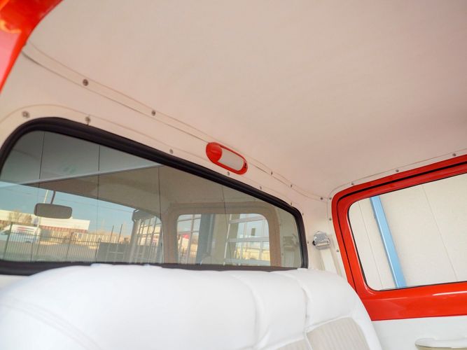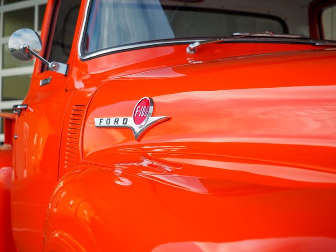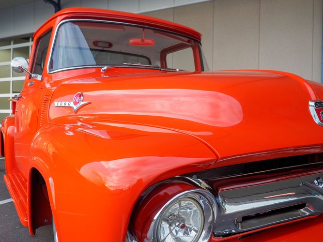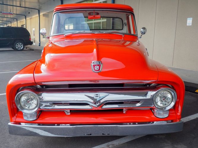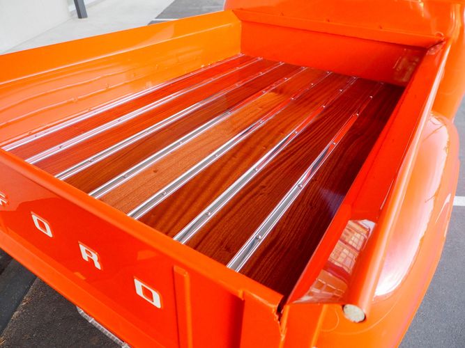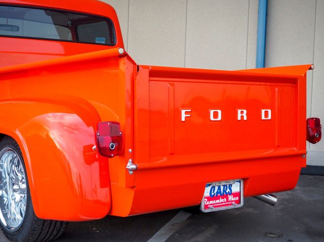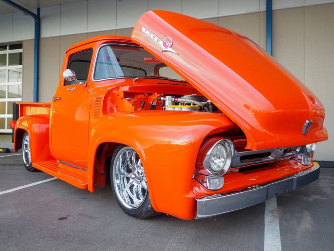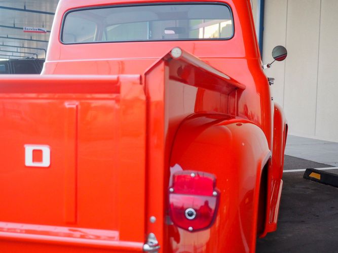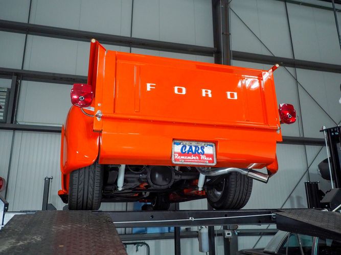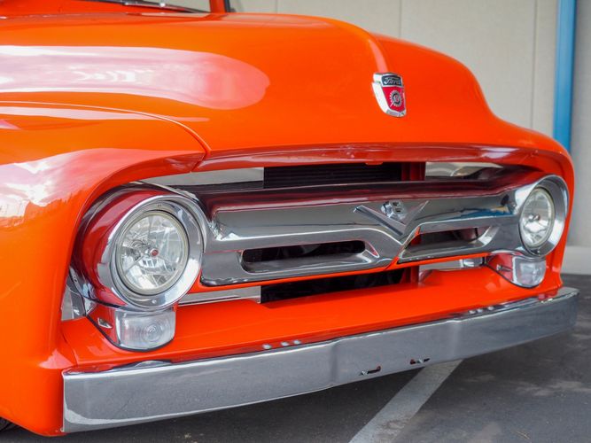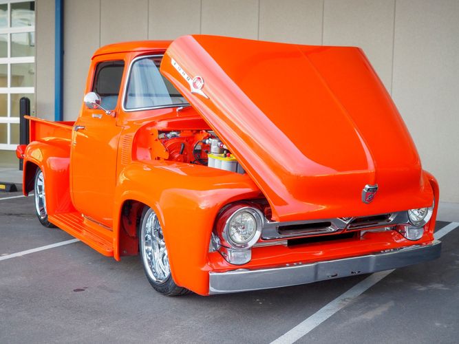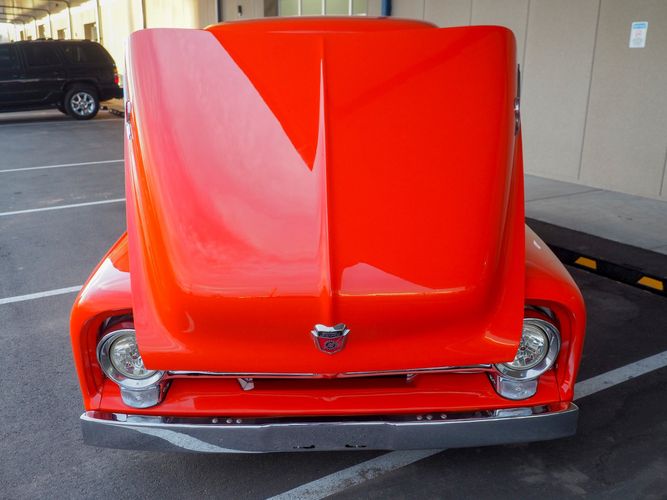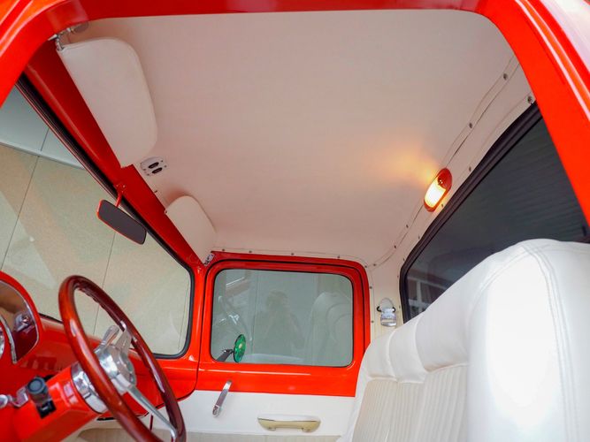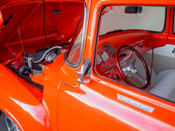 Packed below the 1956 Ford sheet metal is an extensive amount of modern technology including; air conditioning, alarm, remote start, cruise control, ABS power brakes, power windows, automatic door locks when the car is taken in and out of drive, and a modern fuel injected 4.3L V6 paired to a 700R4 overdrive automatic transmission. This Ford F100 is out to get all the right attention everywhere you take it. The PPG burnt orange exterior finish brings out all the body lines and can’t pass by without being noticed. Chrome 18” Ridler wheels compliment the body and stance nicely. This truck features a keyless entry system that makes entering and exiting a breeze. The alarm is a nice addition to keep auto thieves away. The bulletproof fuel injected 4.3L V6 engine runs smooth, is quiet, has plenty of low-end torque and gets 18-20MPG. The extensive creature comforts packed into this truck make it close to a modern car but you still get the feel and style of a 1956 Ford F100! The white interior is nicely done and very comfortable. Featuring: white leather bench seat, wool carpet, fold-down console, tilt wheel, A/C, TPI-TECH gauges, and a custom stereo system. Overall this 1956 Ford F100’s build quality is second to none with many modern features and outstanding looks.