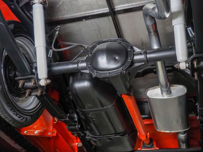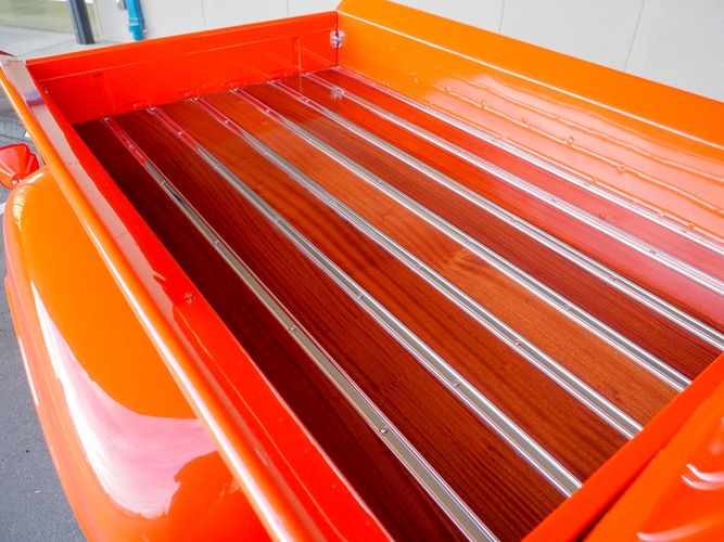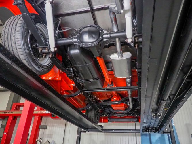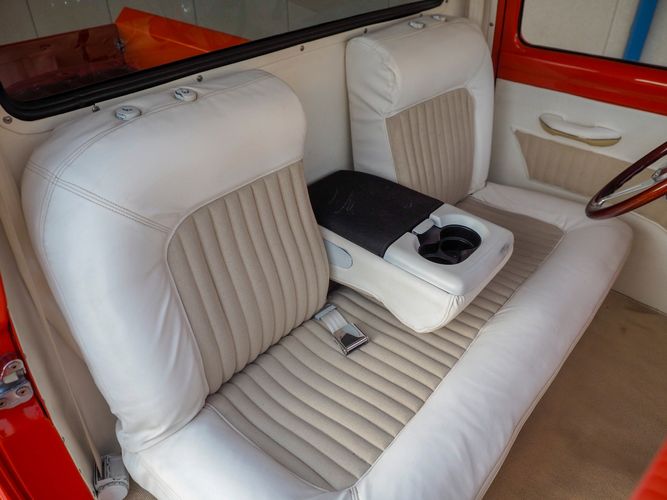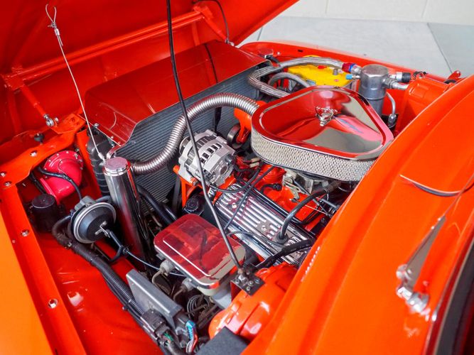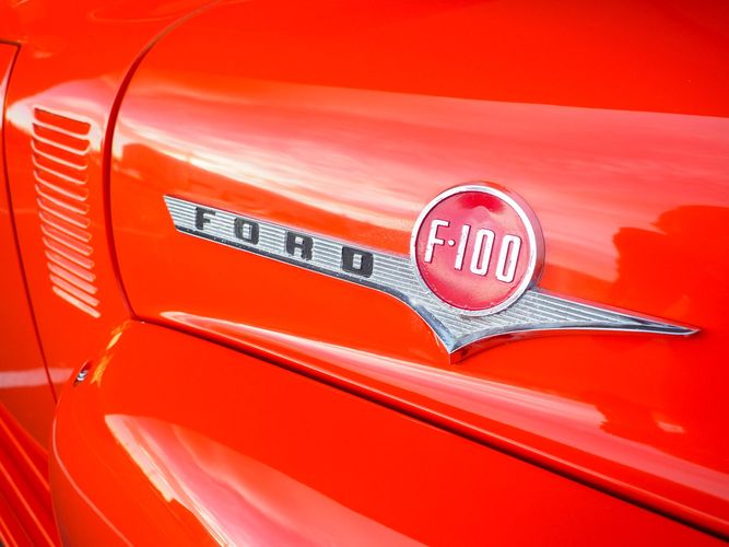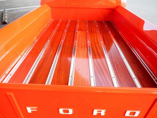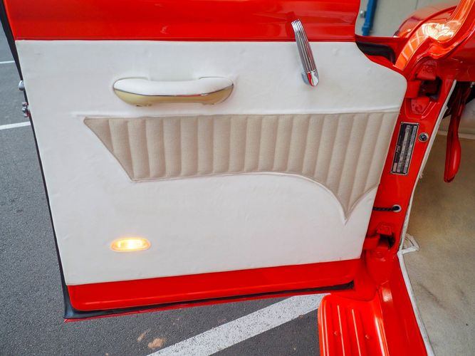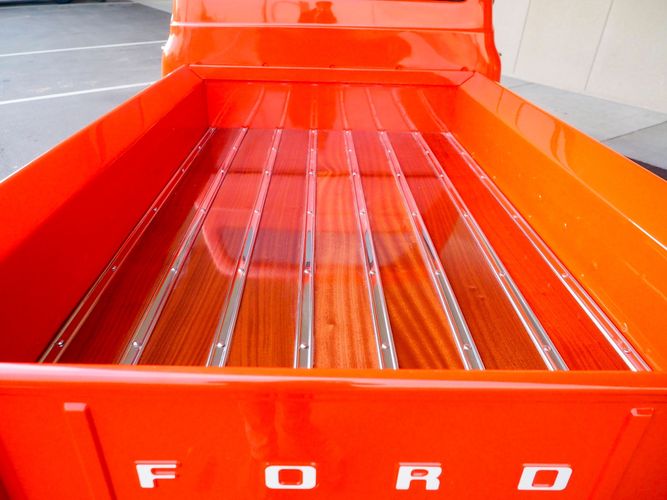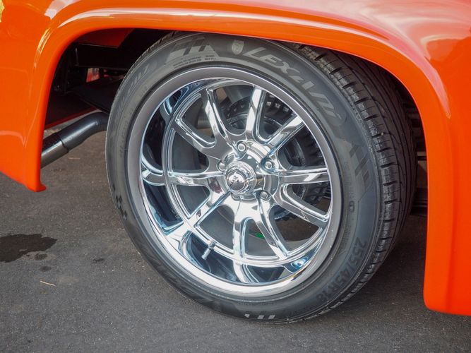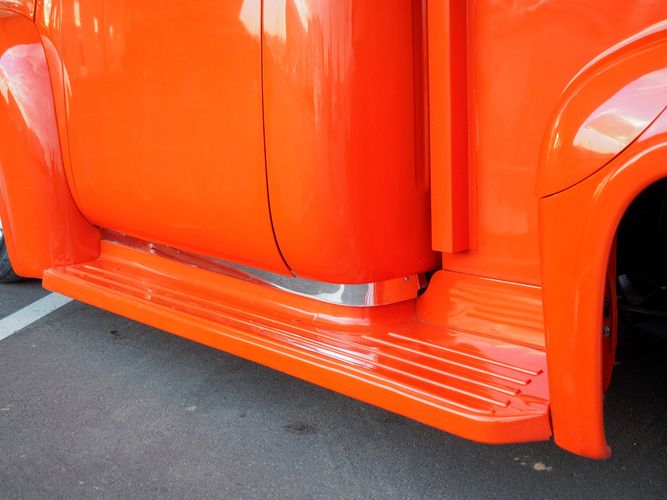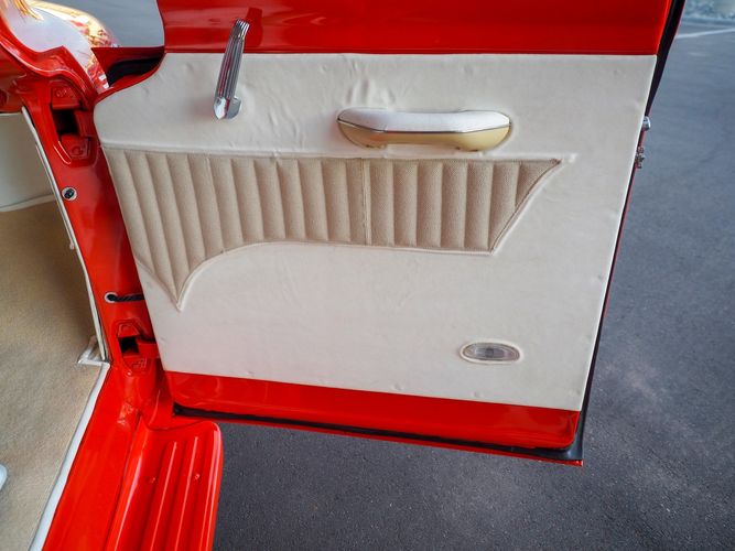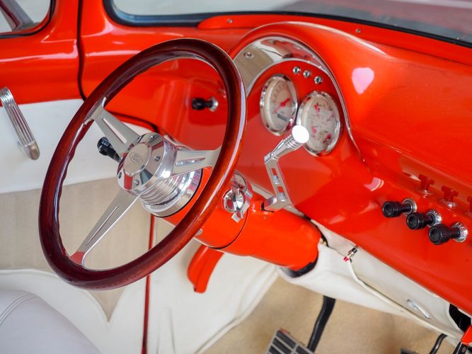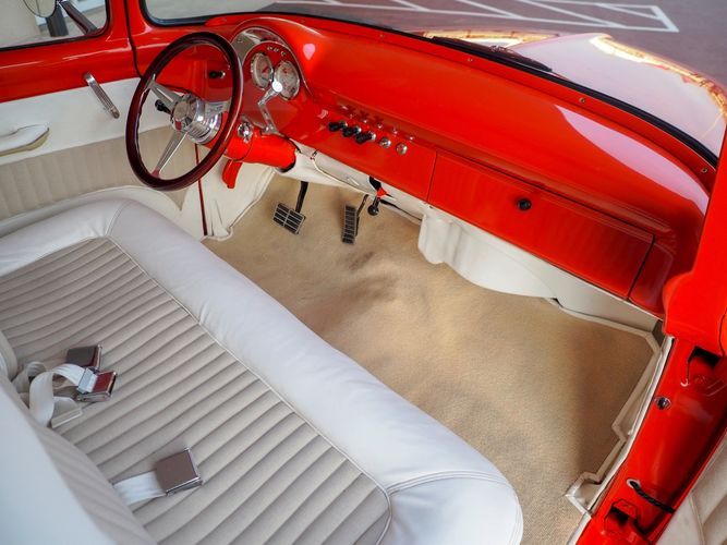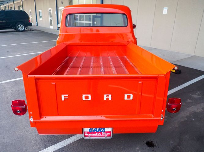 Packed below the 1956 Ford sheet metal is an extensive amount of modern technology including; air conditioning, alarm, remote start, cruise control, ABS power brakes, power windows, automatic door locks when the car is taken in and out of drive, and a modern fuel injected 4.3L V6 paired to a 700R4 overdrive automatic transmission. This Ford F100 is out to get all the right attention everywhere you take it. The PPG burnt orange exterior finish brings out all the body lines and can’t pass by without being noticed. Chrome 18” Ridler wheels compliment the body and stance nicely. This truck features a keyless entry system that makes entering and exiting a breeze. The alarm is a nice addition to keep auto thieves away. The bulletproof fuel injected 4.3L V6 engine runs smooth, is quiet, has plenty of low-end torque and gets 18-20MPG. The extensive creature comforts packed into this truck make it close to a modern car but you still get the feel and style of a 1956 Ford F100! The white interior is nicely done and very comfortable. Featuring: white leather bench seat, wool carpet, fold-down console, tilt wheel, A/C, TPI-TECH gauges, and a custom stereo system. Overall this 1956 Ford F100’s build quality is second to none with many modern features and outstanding looks.