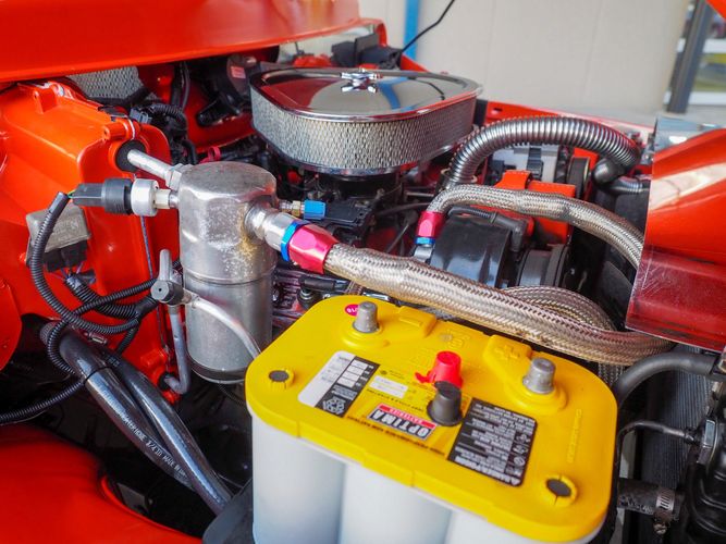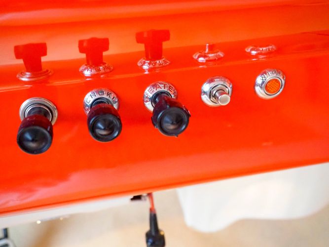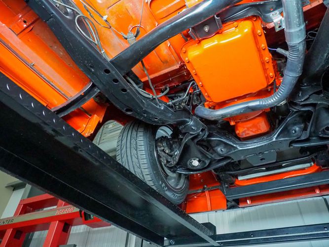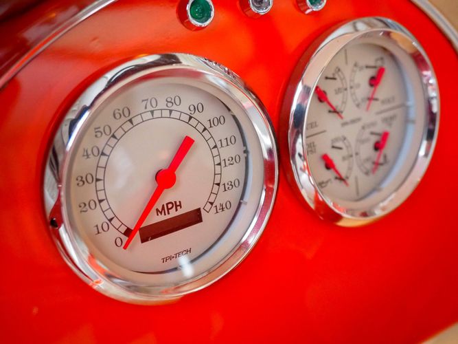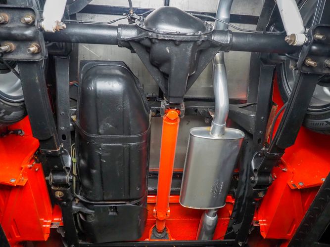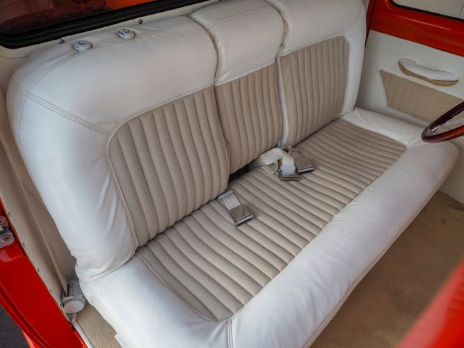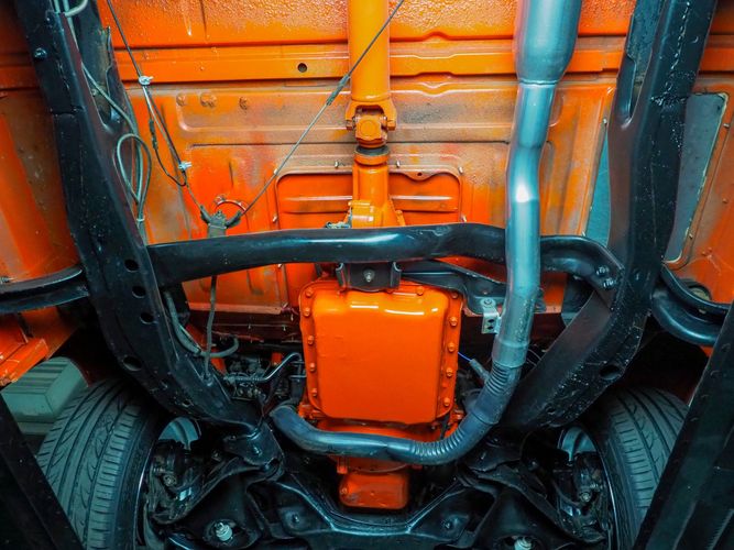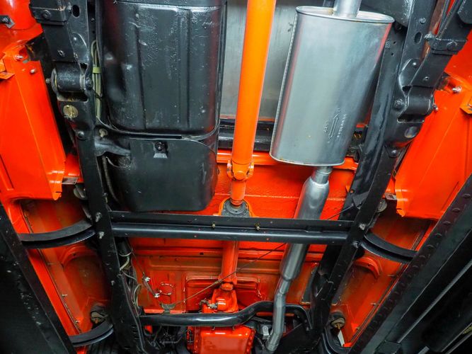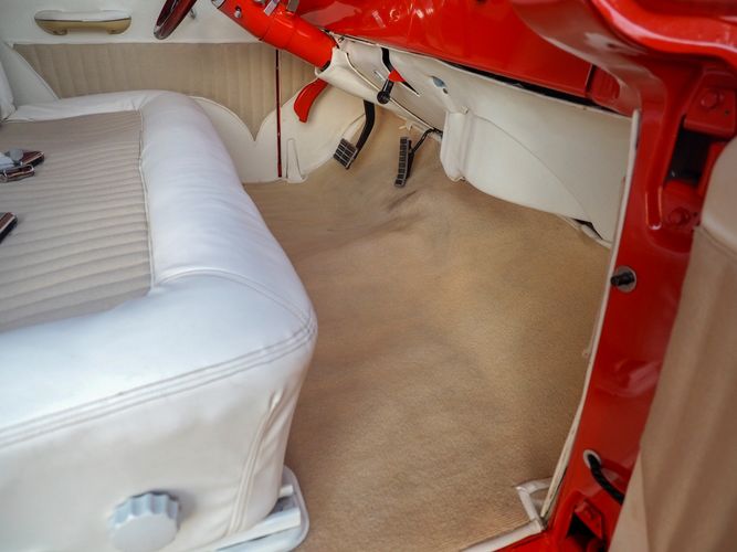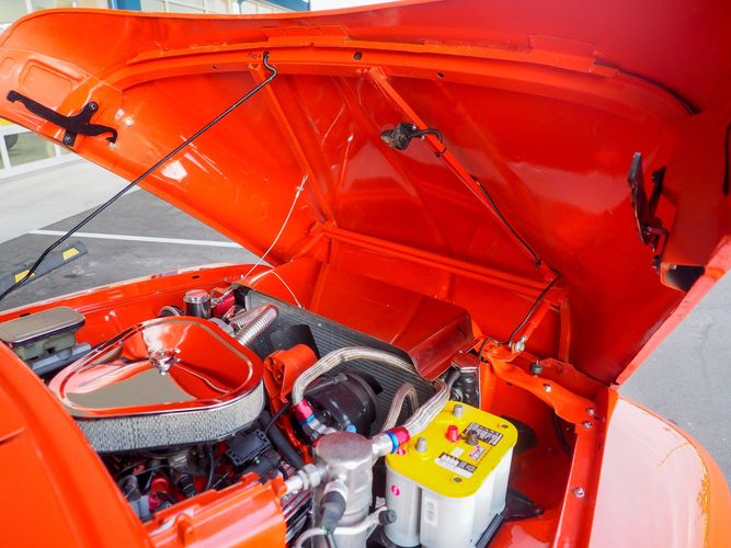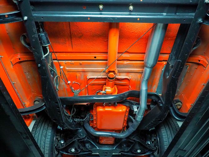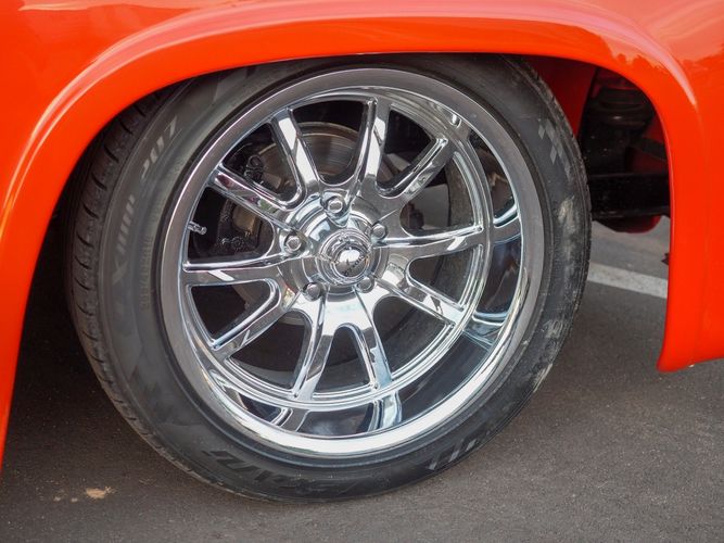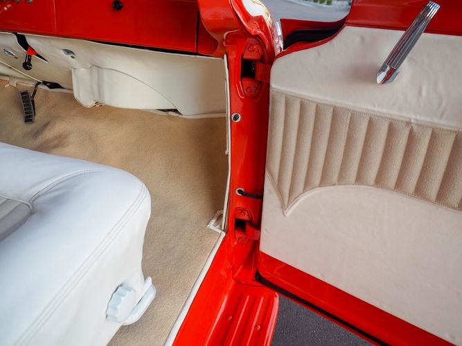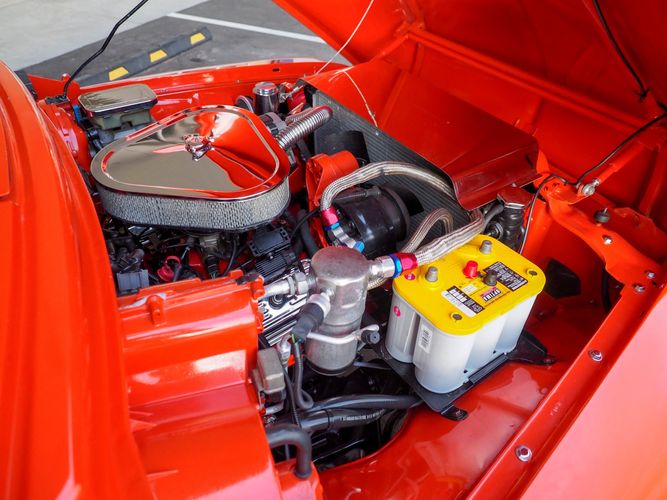 Packed below the 1956 Ford sheet metal is an extensive amount of modern technology including; air conditioning, alarm, remote start, cruise control, ABS power brakes, power windows, automatic door locks when the car is taken in and out of drive, and a modern fuel injected 4.3L V6 paired to a 700R4 overdrive automatic transmission. This Ford F100 is out to get all the right attention everywhere you take it. The PPG burnt orange exterior finish brings out all the body lines and can’t pass by without being noticed. Chrome 18” Ridler wheels compliment the body and stance nicely. This truck features a keyless entry system that makes entering and exiting a breeze. The alarm is a nice addition to keep auto thieves away. The bulletproof fuel injected 4.3L V6 engine runs smooth, is quiet, has plenty of low-end torque and gets 18-20MPG. The extensive creature comforts packed into this truck make it close to a modern car but you still get the feel and style of a 1956 Ford F100! The white interior is nicely done and very comfortable. Featuring: white leather bench seat, wool carpet, fold-down console, tilt wheel, A/C, TPI-TECH gauges, and a custom stereo system. Overall this 1956 Ford F100’s build quality is second to none with many modern features and outstanding looks.
