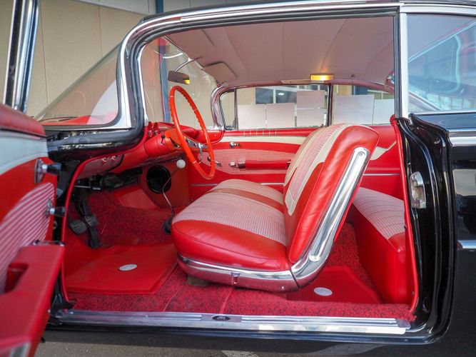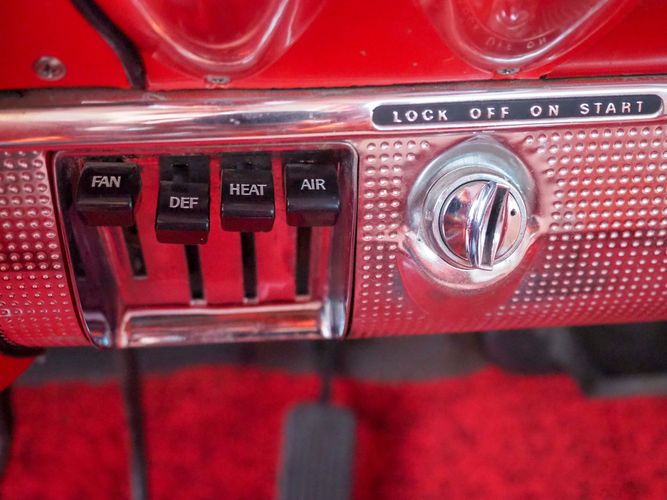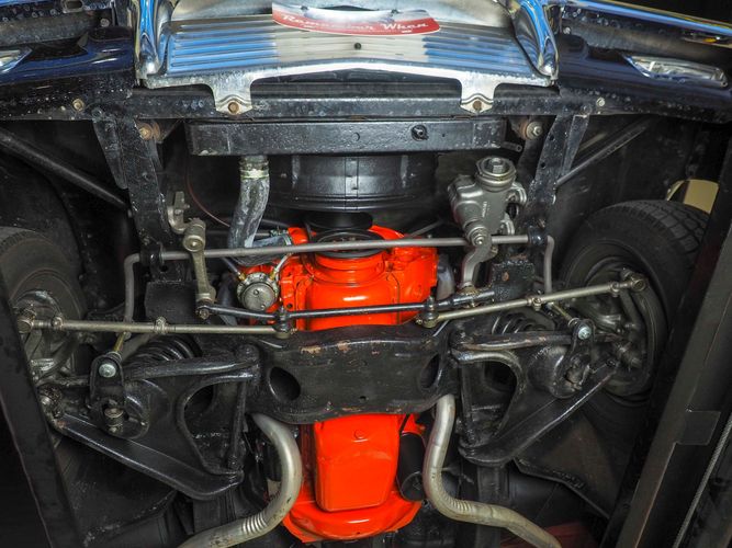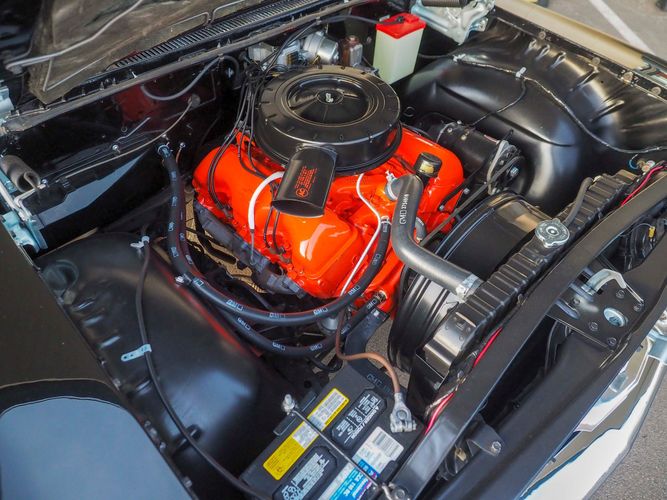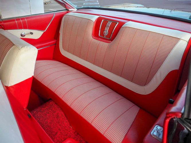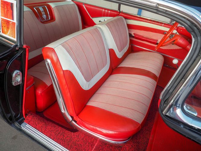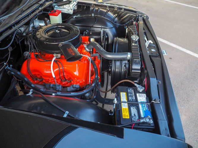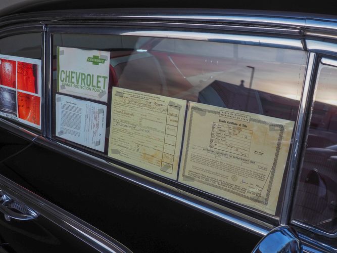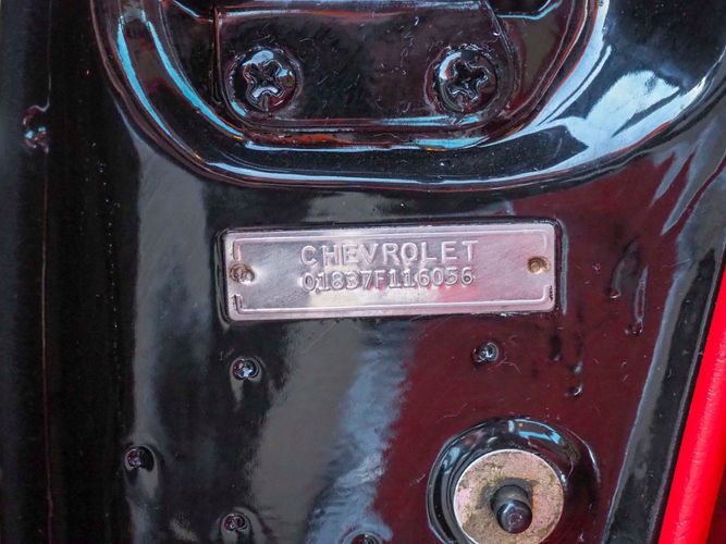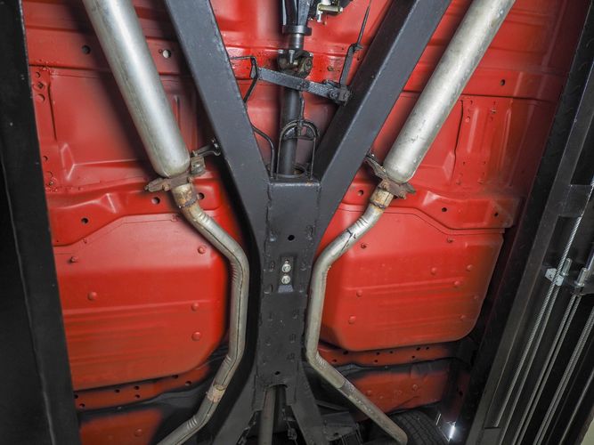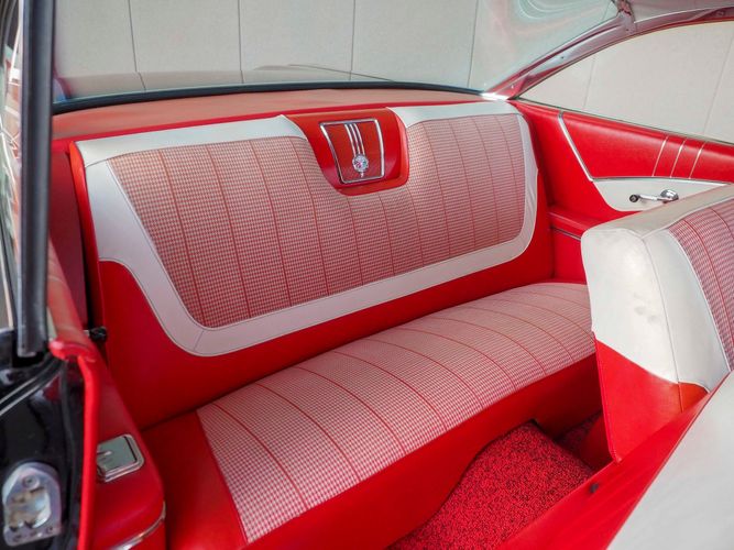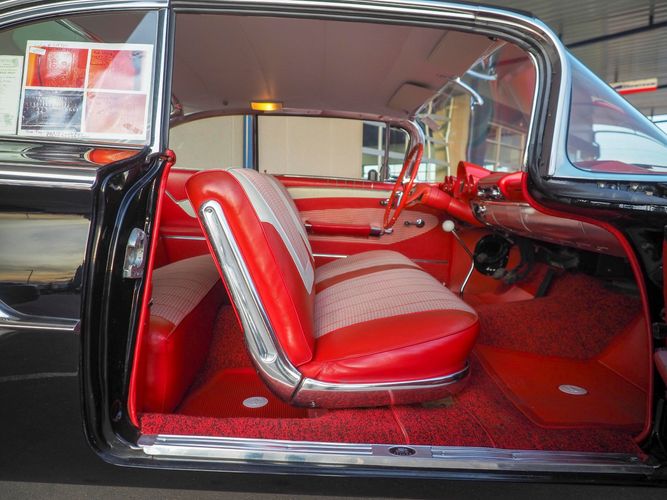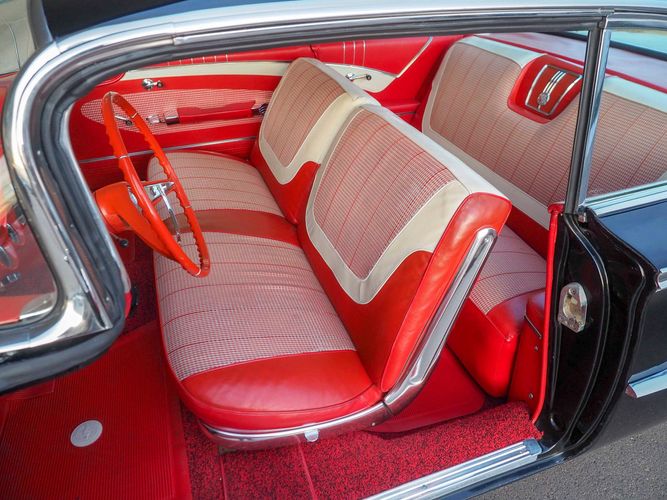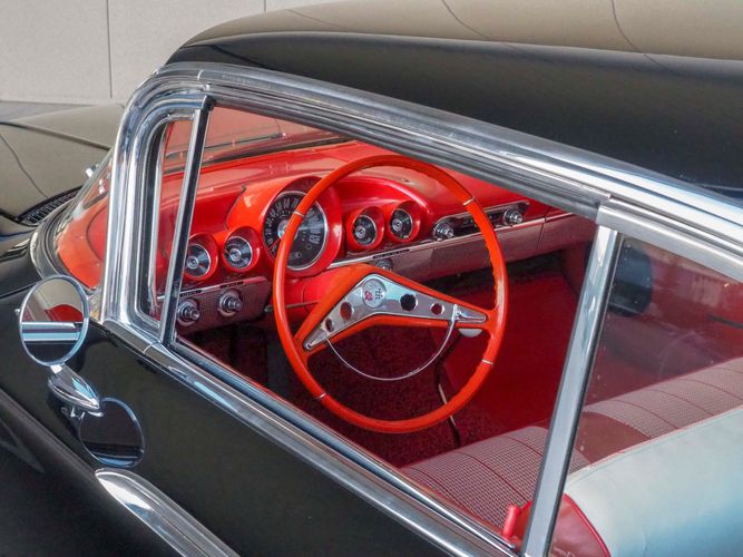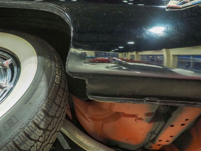 This appears as an original Tuxedo black car that was restored beautifully. The body appears laser straight with a deep gloss shine. All the chrome and trim is in excellent condition and the fit and finish of the body panels are great. Restored red and white interior is simply an amazing color combo and compliments the Tuxedo black nicely.