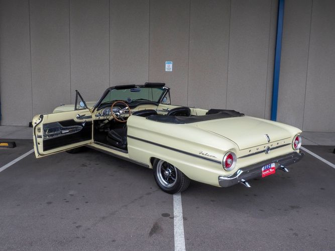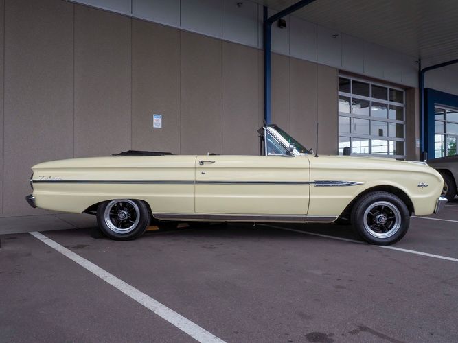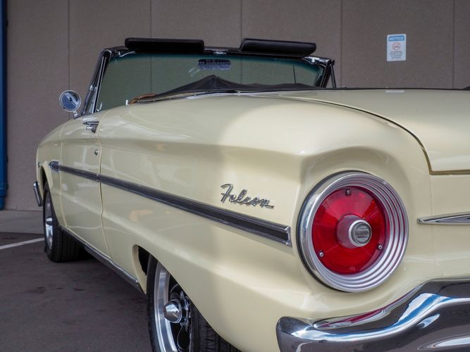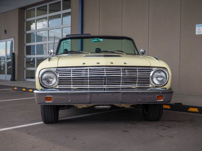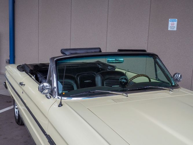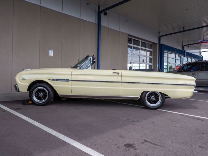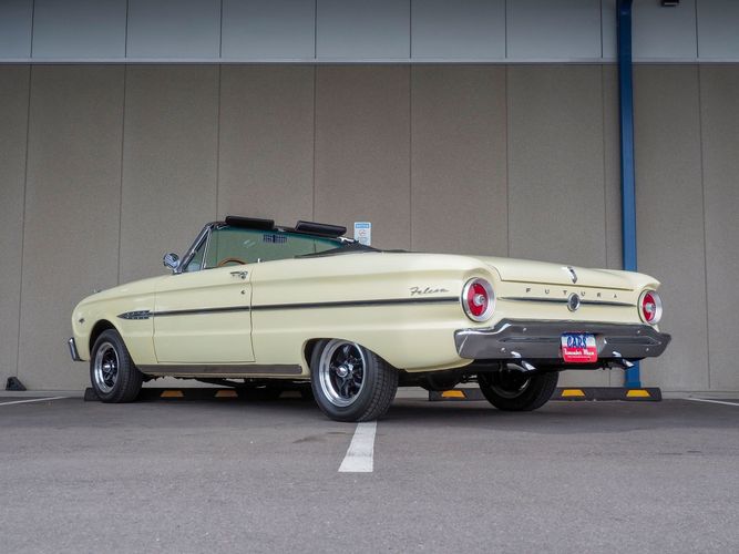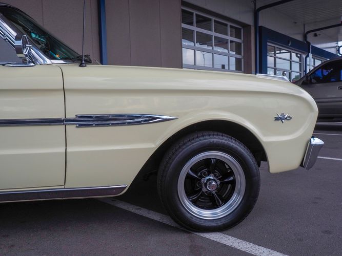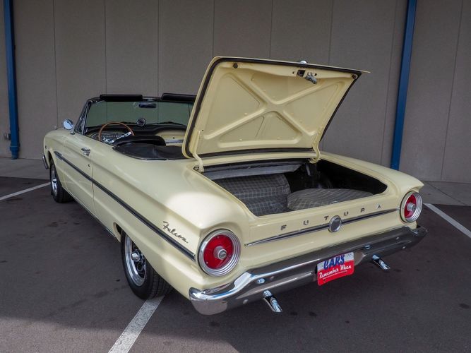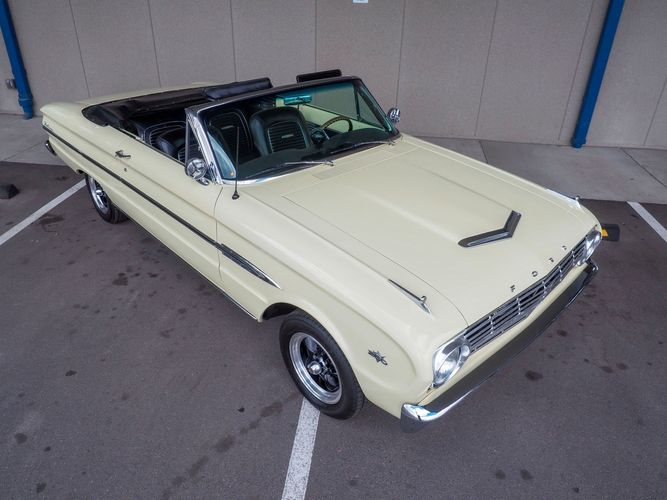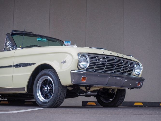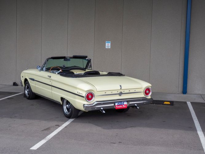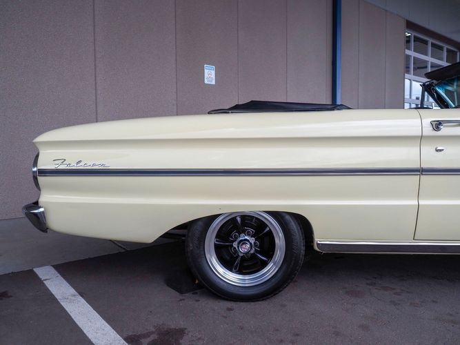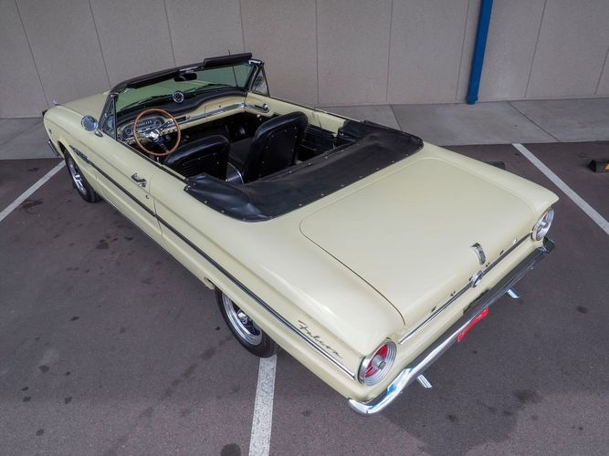 A yellow convertible with bucket seats, four-on-the-floor, and a 260 V8 under the hood make this 1963 Ford Falcon Futura convertible especially desirable. This Futura completed a comprehensive rotisserie restoration in 2007 and was driven very little since restored. You can see restoration photos at the end of the photo gallery. Originally born a red car, it was changed over to this beautiful yellow color that compliments the black bucket seat interior and new black wheels nicely. It also has a new black power convertible top. The body is laser straight and consists of mainly all-original body components as seen in the restoration photos.