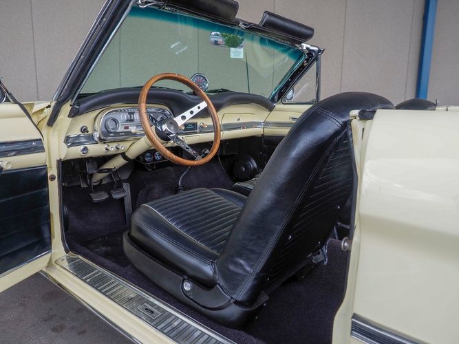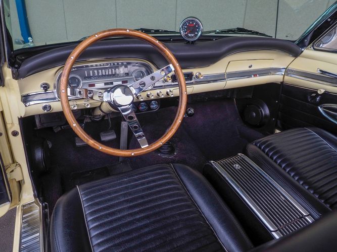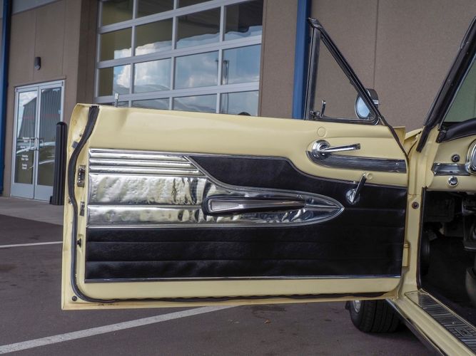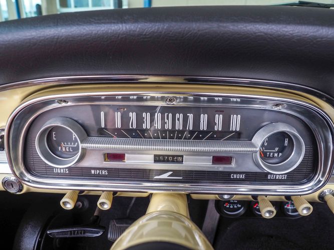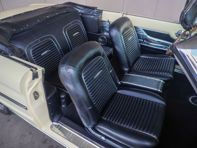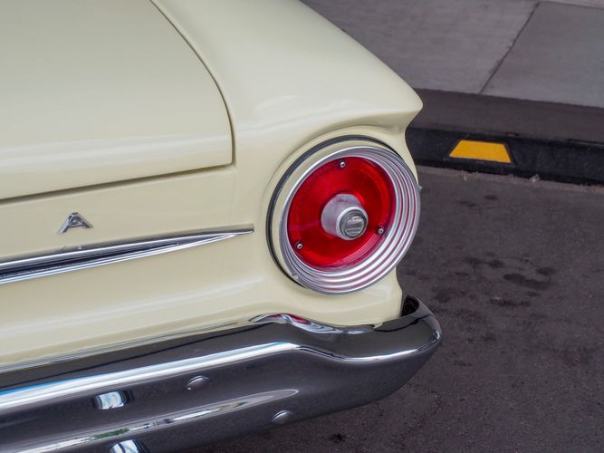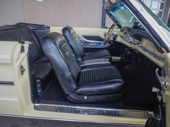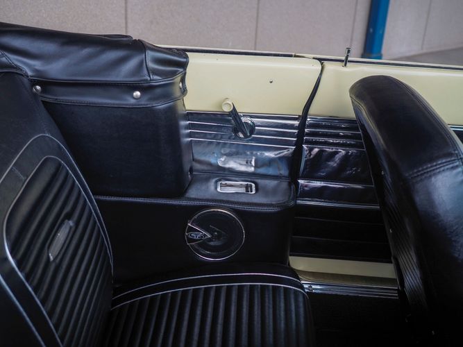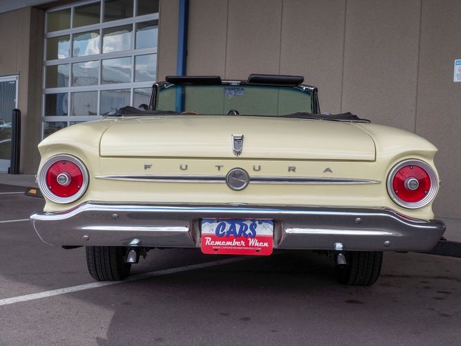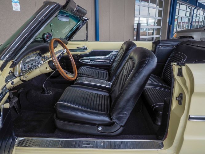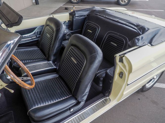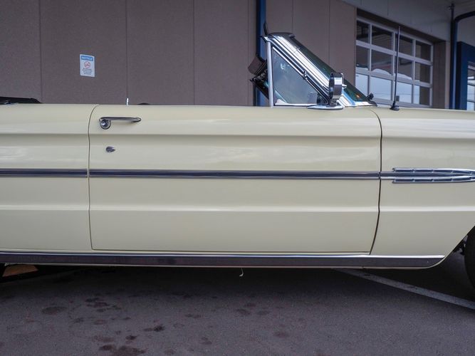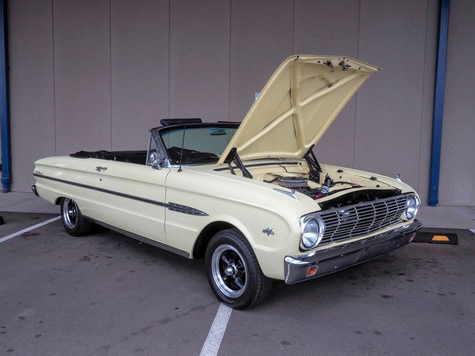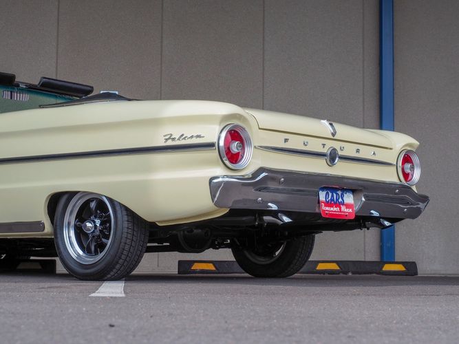A yellow convertible with bucket seats, four-on-the-floor, and a 260 V8 under the hood make this 1963 Ford Falcon Futura convertible especially desirable. This Futura completed a comprehensive rotisserie restoration in 2007 and was driven very little since restored. You can see restoration photos at the end of the photo gallery. Originally born a red car, it was changed over to this beautiful yellow color that compliments the black bucket seat interior and new black wheels nicely. It also has a new black power convertible top. The body is laser straight and consists of mainly all-original body components as seen in the restoration photos.