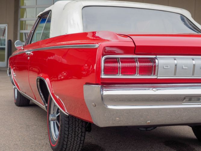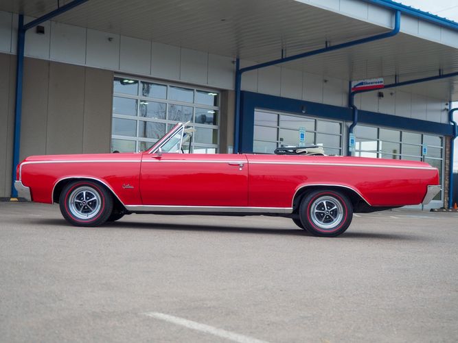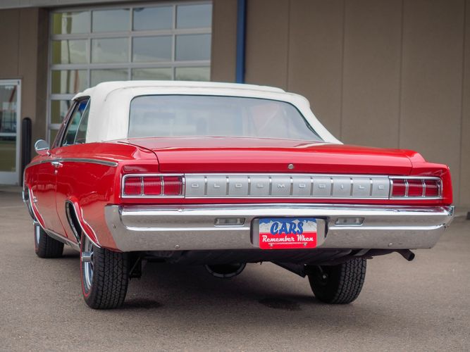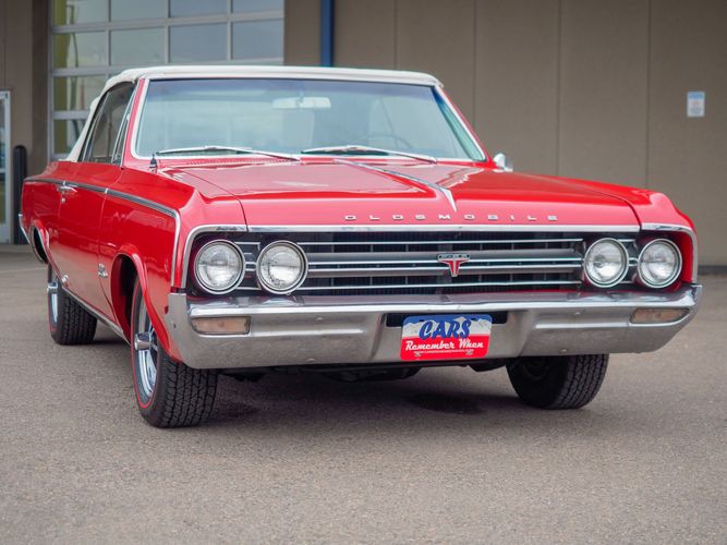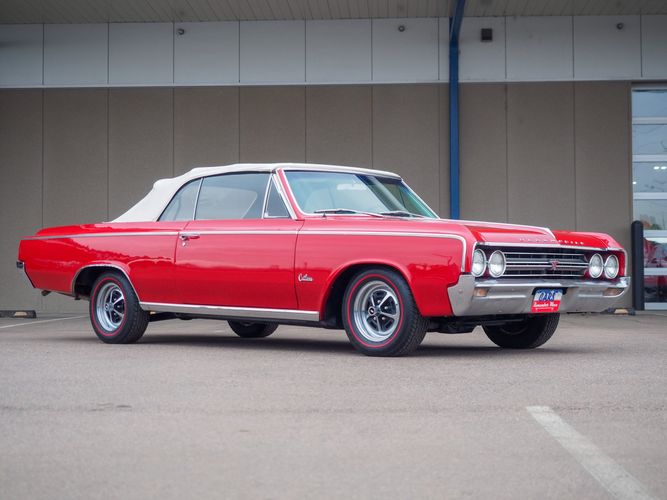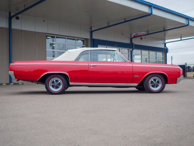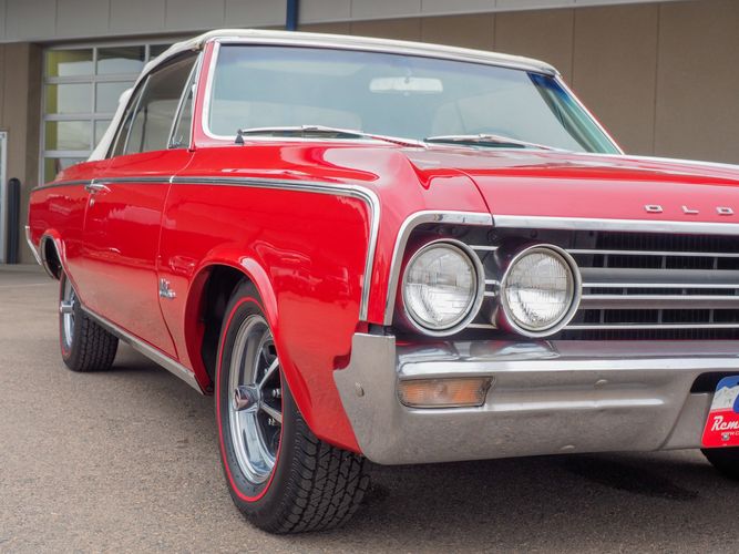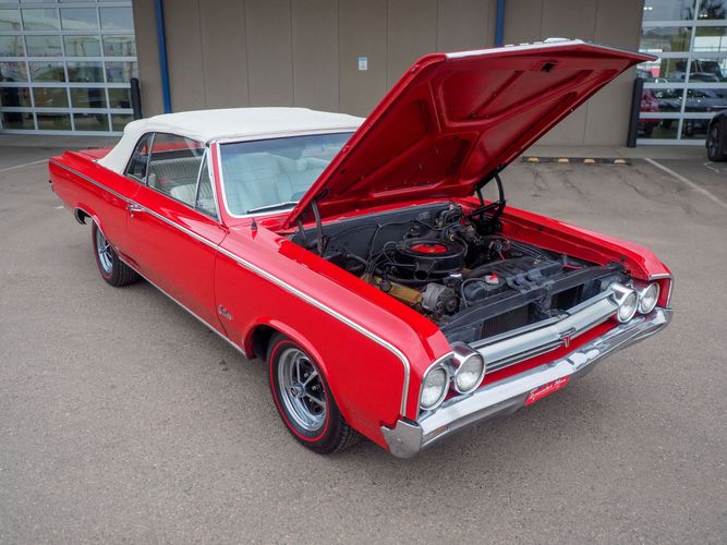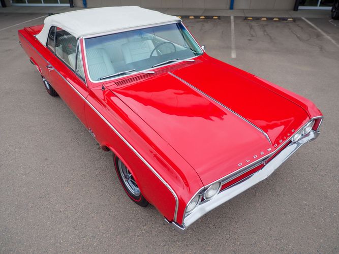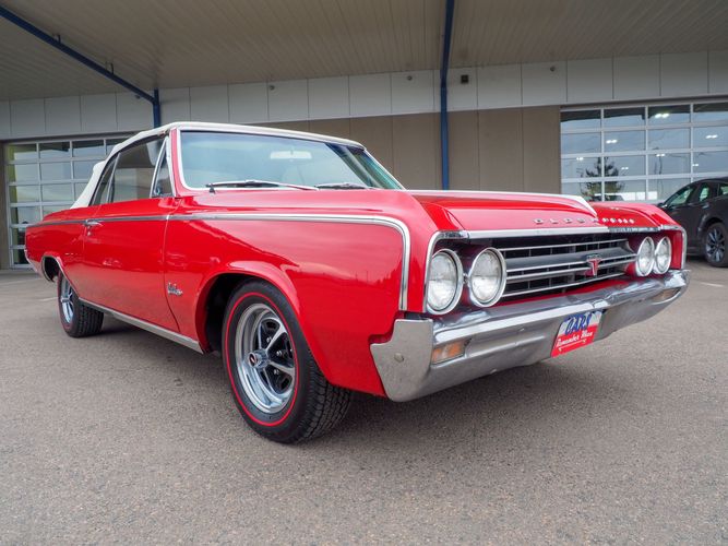Offered for sale is this rare and seldom seen 1964 Oldsmobile Cutlass Convertible. The Cutlass F85 models had a few more option boxes ticked when ordered from GM than the base Cutlass. One such option was a more powerful engine, in the form of an ultra-high compression 330ci V8. Finished in a driver quality red paint finish over a white top and interior. Also with a number of great options, in the form of power top, power steering, and power brakes. The car’s compact body style is complimented with the addition of Magnum 500 442 Style OEM wheels that are reportedly wrapped with BF Goodrich red radial tires. CALL TODAY 720-465-5104