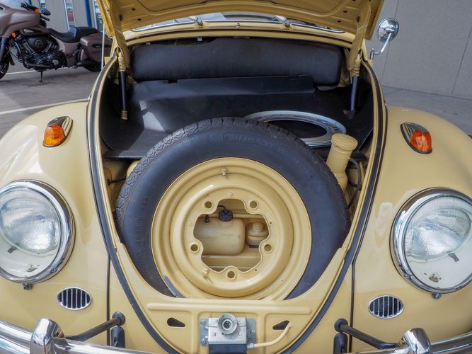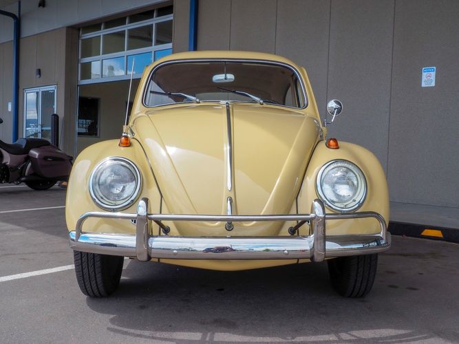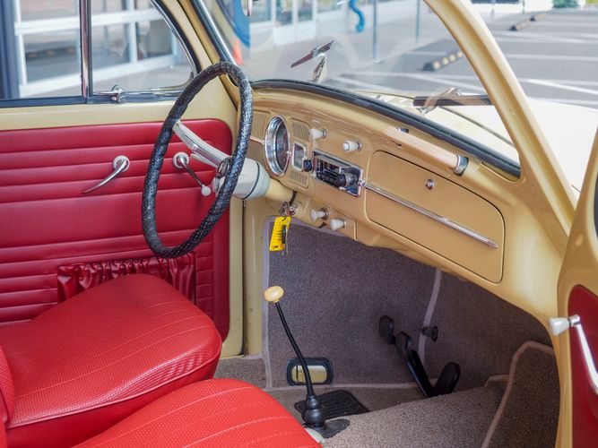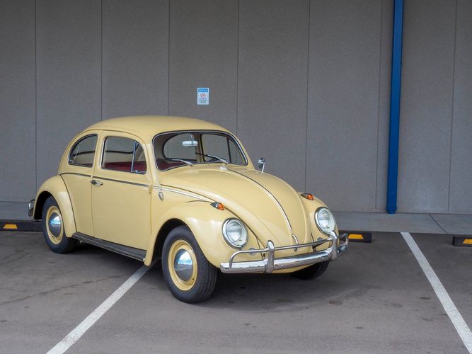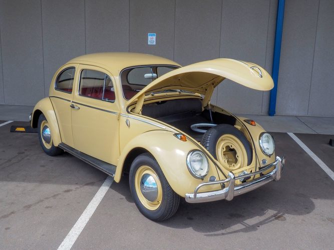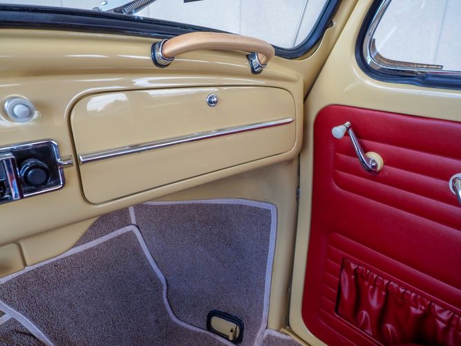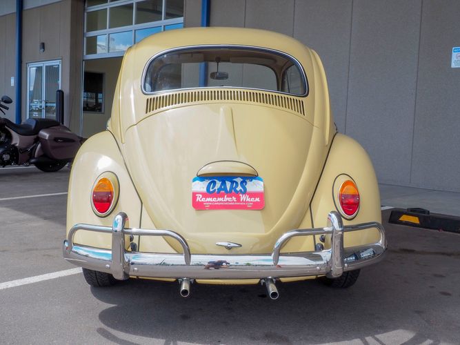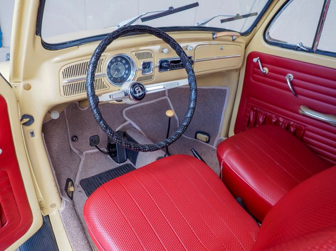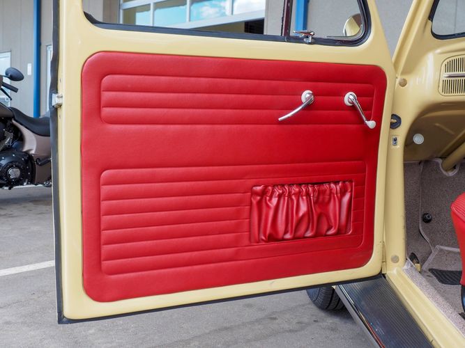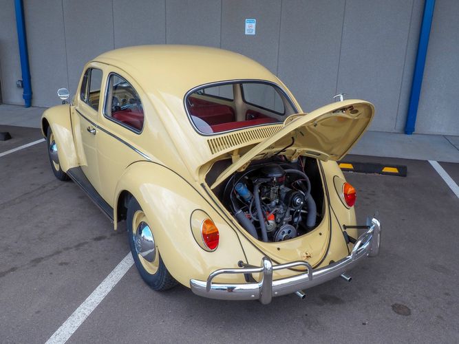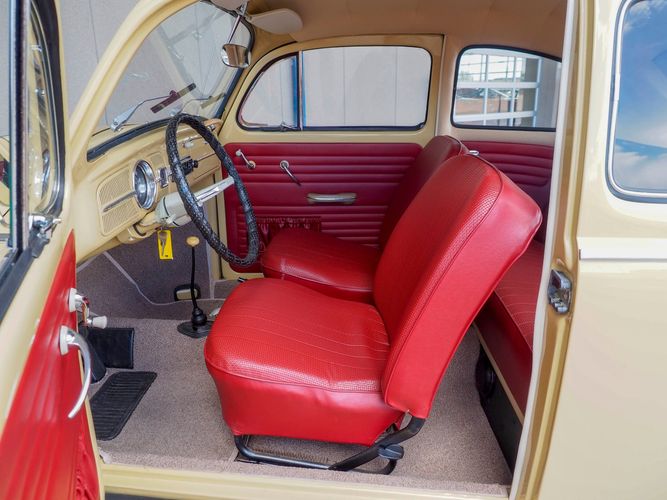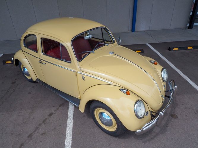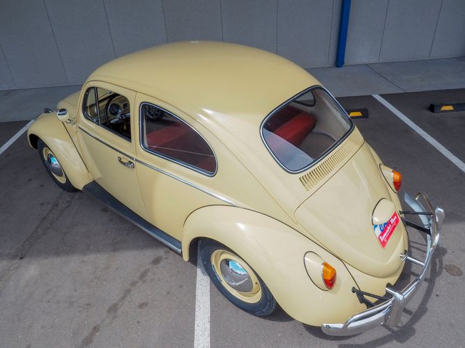 This is a nicely restored example with a smooth running 1200cc flat four engine. The 4-speed gearbox feels fresh as well as the clutch. The interior fit and finish is really nice. The red upholstery on the beige exterior color is different and really pops. All the window glass appears to be original and has the VW stamp on it. The wiper blades work smoothly and all the exterior lights illuminate as they should. This 64' VW Bug needs nothing and is ready to be driven! CALL TODAY 720-465-5104