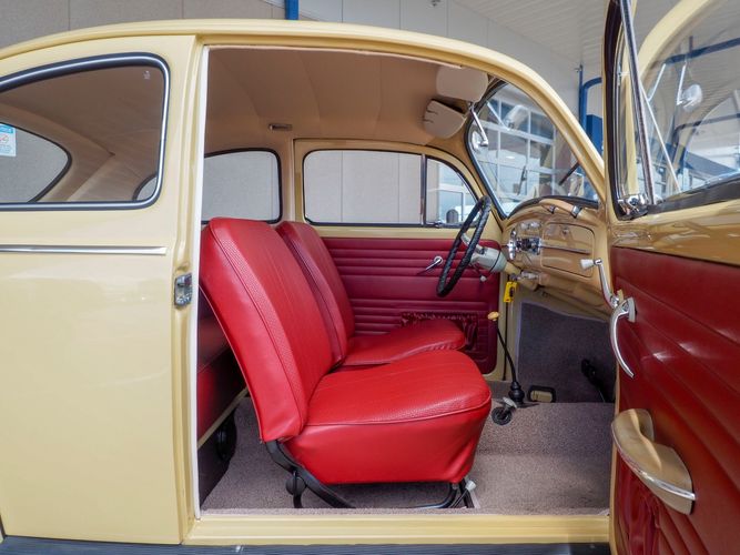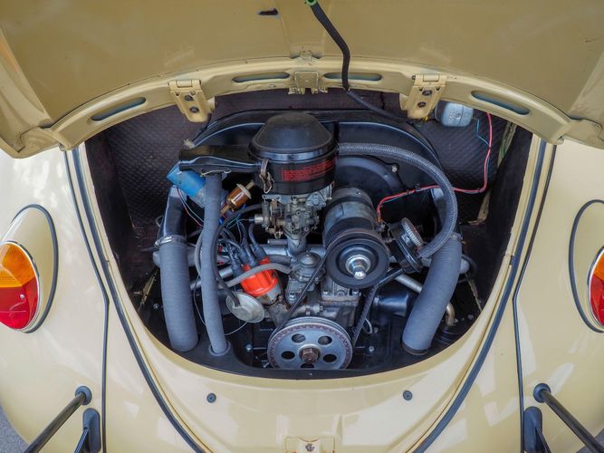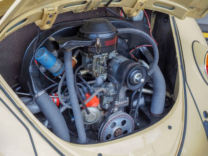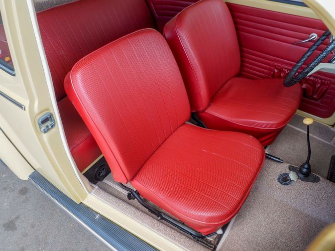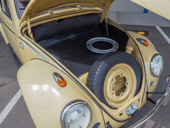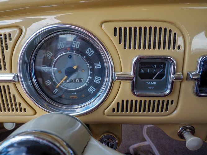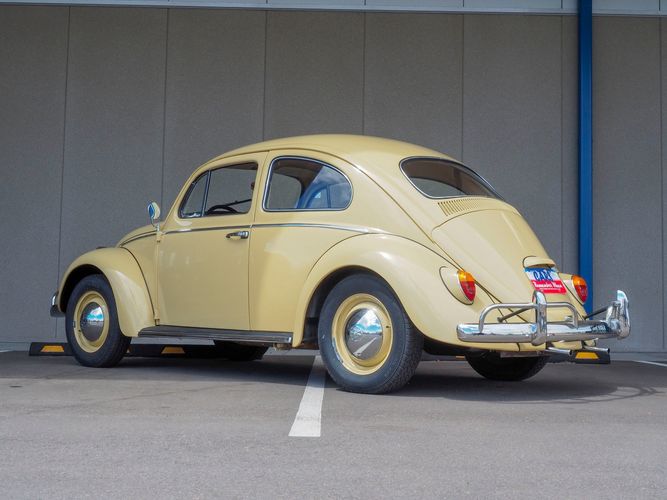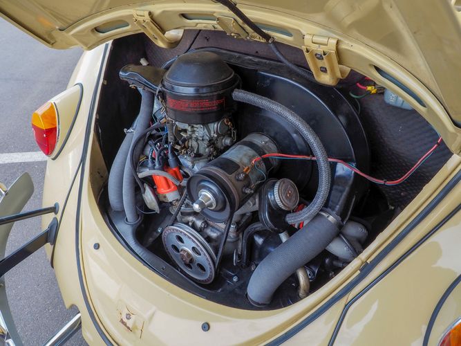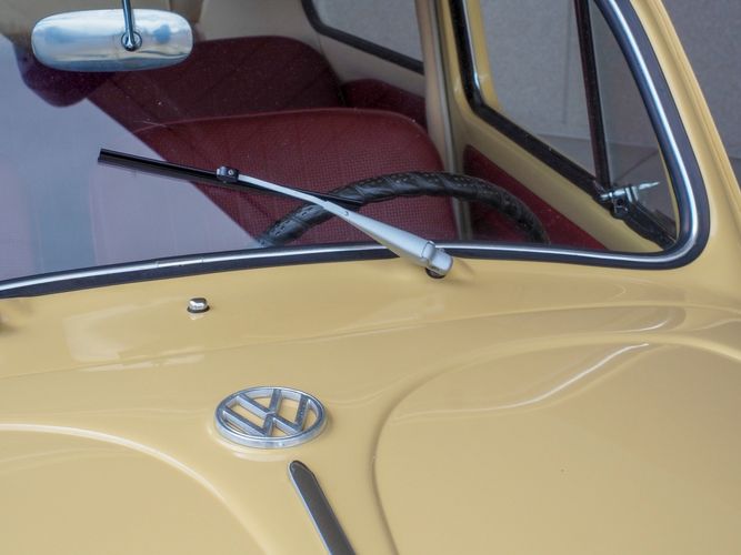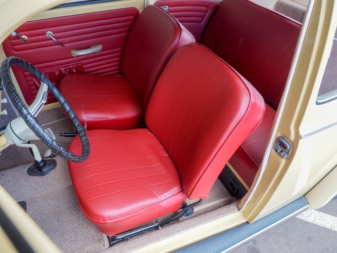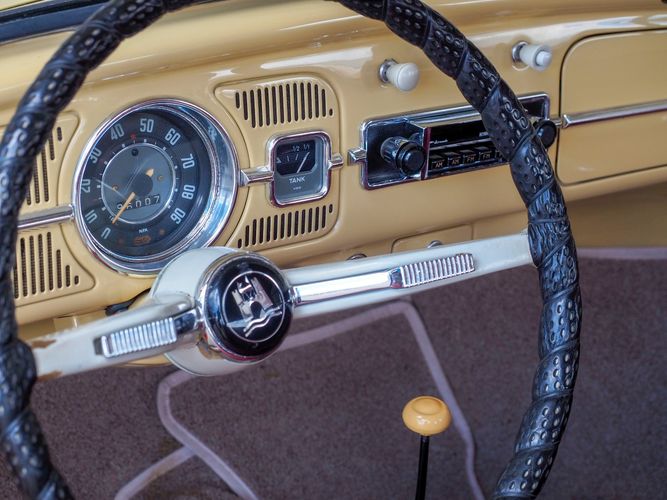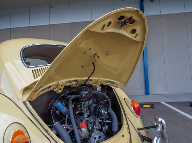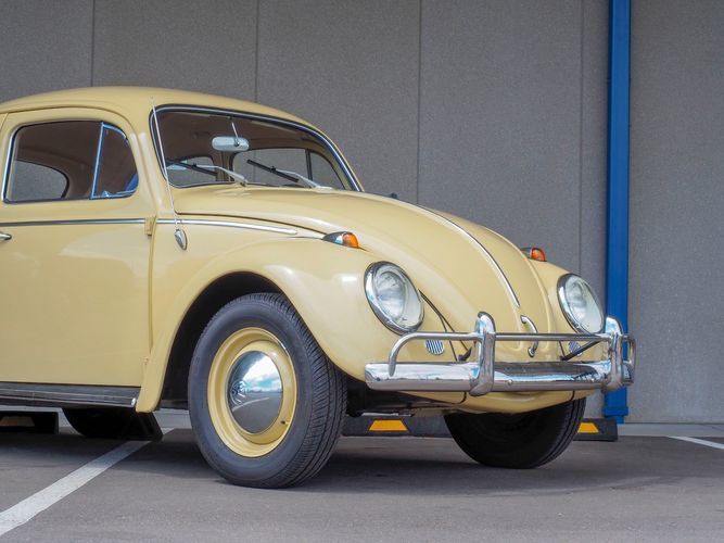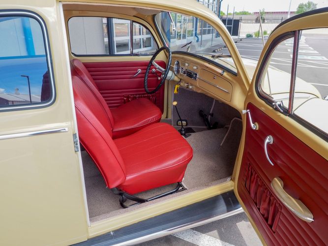 This is a nicely restored example with a smooth running 1200cc flat four engine. The 4-speed gearbox feels fresh as well as the clutch. The interior fit and finish is really nice. The red upholstery on the beige exterior color is different and really pops. All the window glass appears to be original and has the VW stamp on it. The wiper blades work smoothly and all the exterior lights illuminate as they should. This 64' VW Bug needs nothing and is ready to be driven! CALL TODAY 720-465-5104