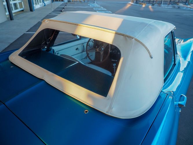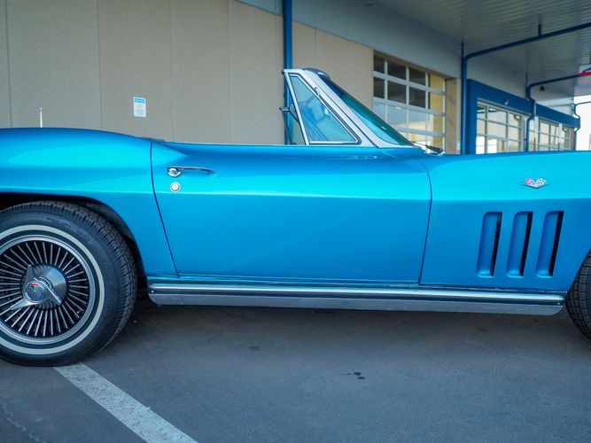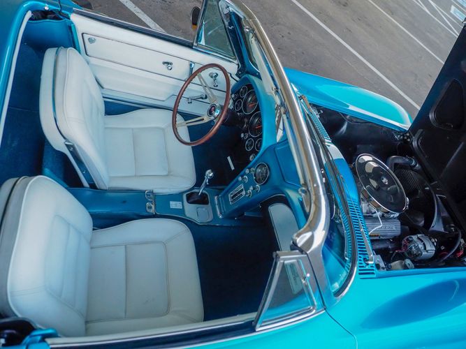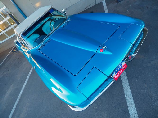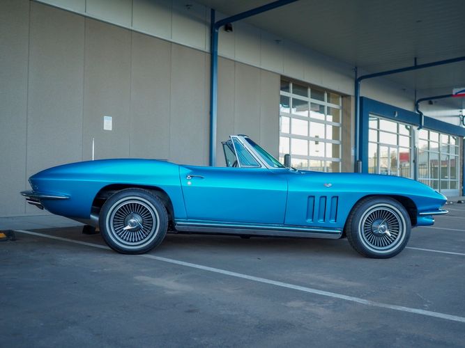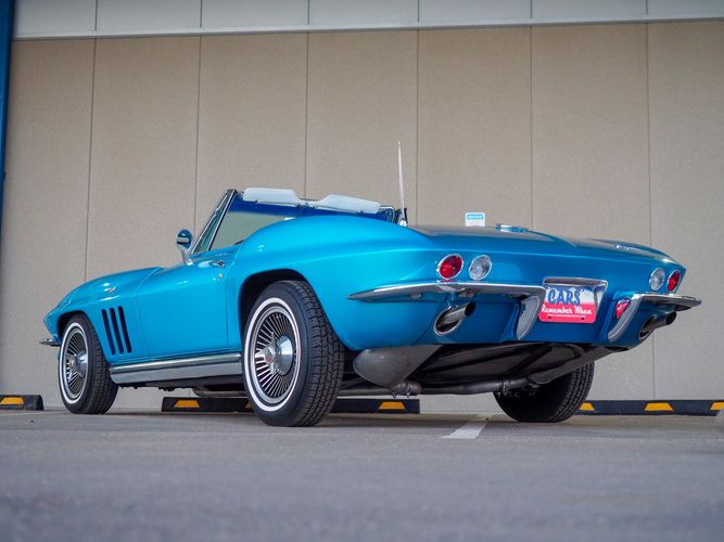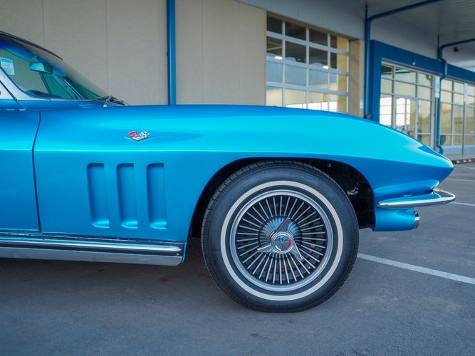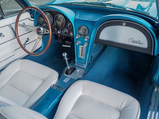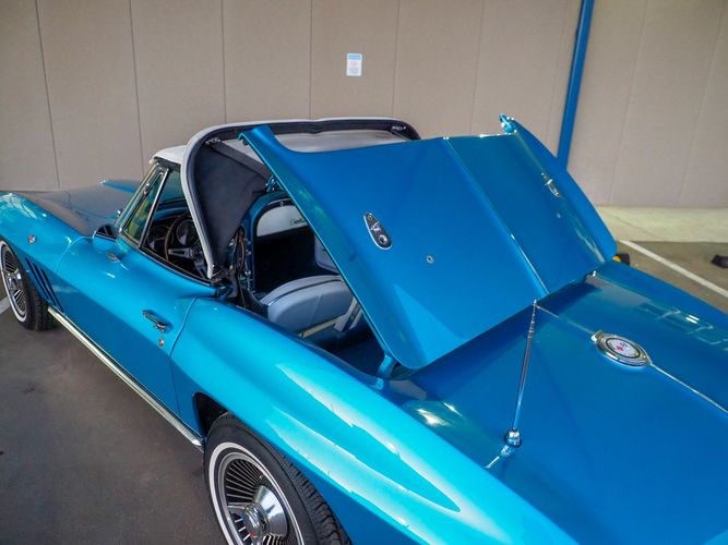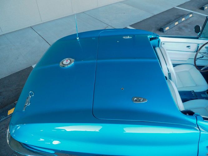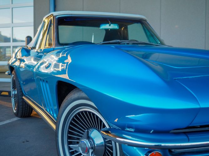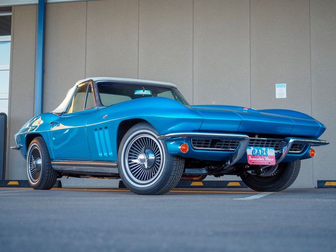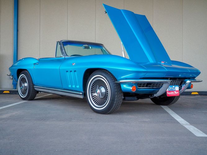 This 1965 Chevrolet Corvette convertible has its original numbers-matching, 327 cubic-inch 365 horsepower L76 V8. That makes this well-presented example significant, rare, and absolutely cool. Finished in a factory correct Nassau blue paired with a white top, the overall presentation is fantastic. The body is in excellent shape with straight lines, correct trim and emblems topped off with knock-off wheels. The overall appearance is very close to how it looked new in 1965. The Nassau blue is a fantastic color for a convertible and pairs nicely with the white top and white/blue interior. A matching Nassau blue hardtop is also included!