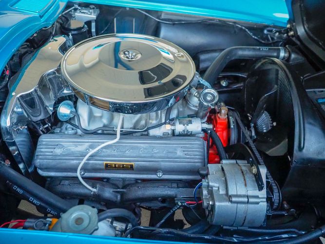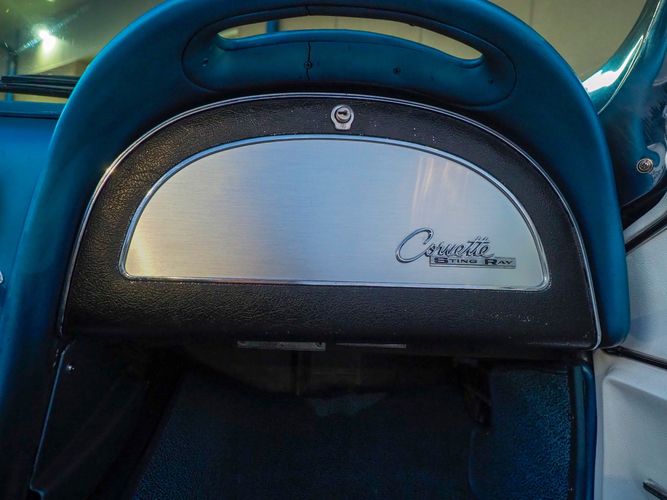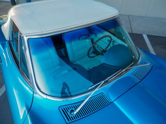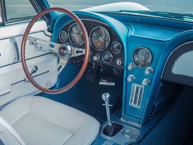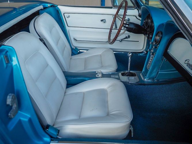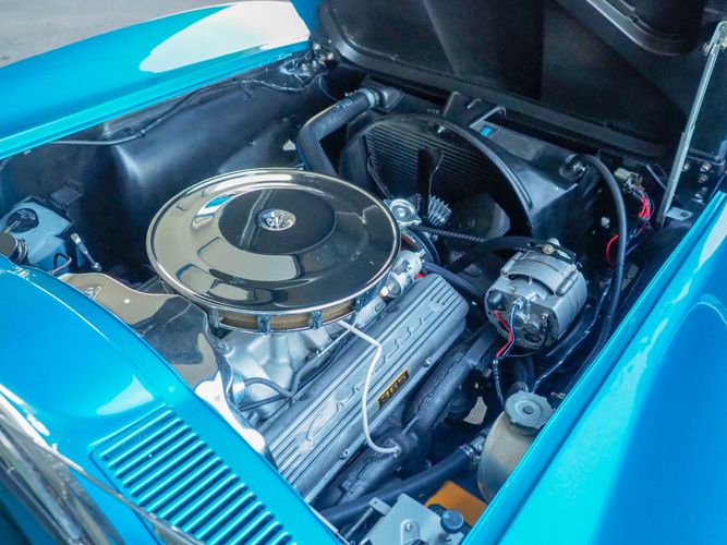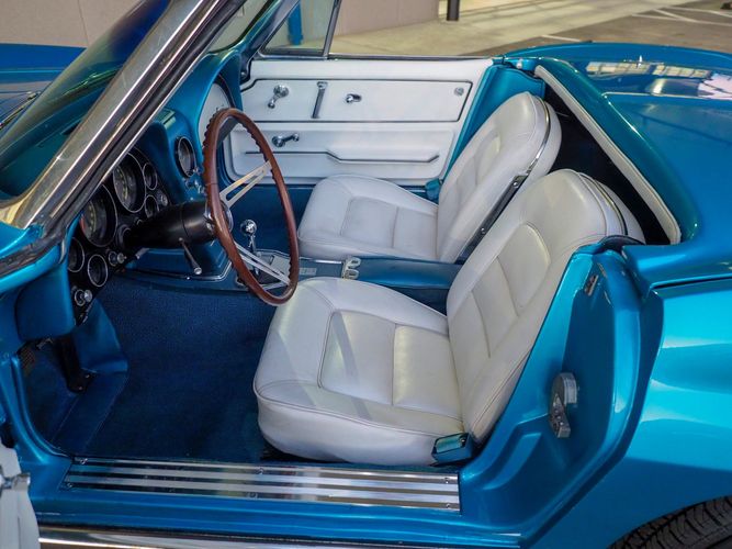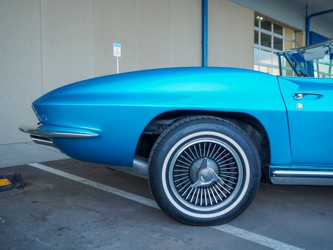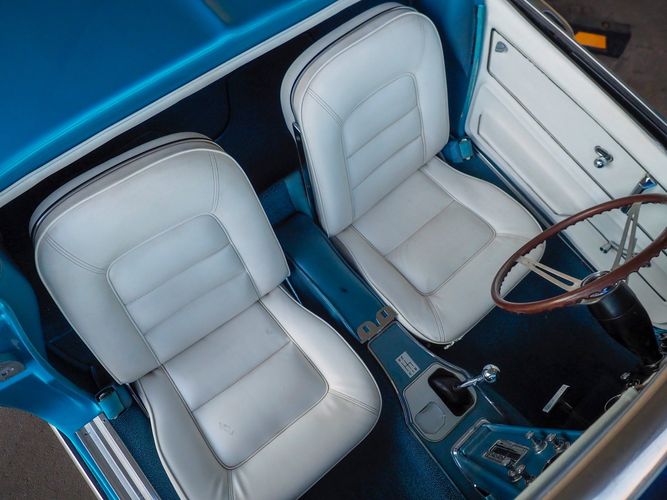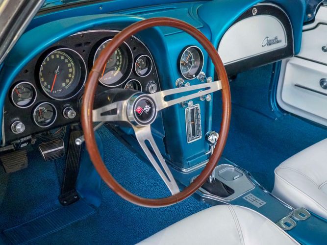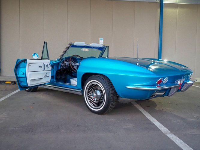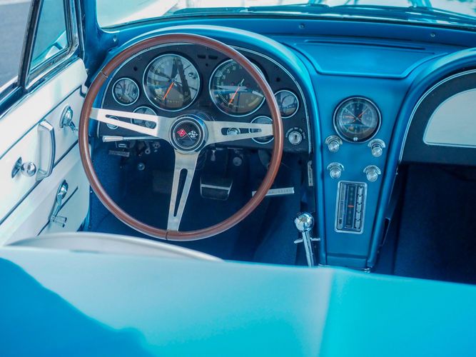 This 1965 Chevrolet Corvette convertible has its original numbers-matching, 327 cubic-inch 365 horsepower L76 V8. That makes this well-presented example significant, rare, and absolutely cool. Finished in a factory correct Nassau blue paired with a white top, the overall presentation is fantastic. The body is in excellent shape with straight lines, correct trim and emblems topped off with knock-off wheels. The overall appearance is very close to how it looked new in 1965. The Nassau blue is a fantastic color for a convertible and pairs nicely with the white top and white/blue interior. A matching Nassau blue hardtop is also included!