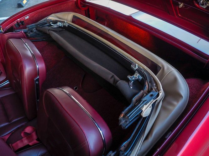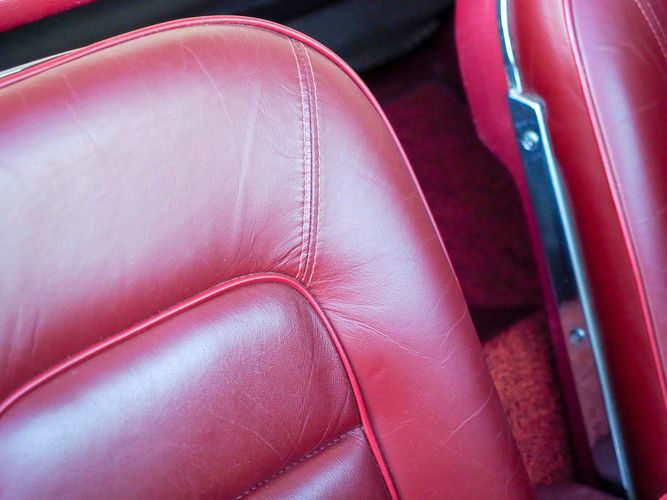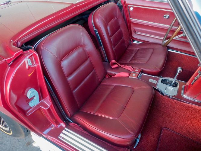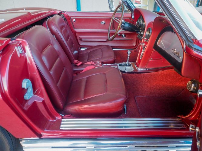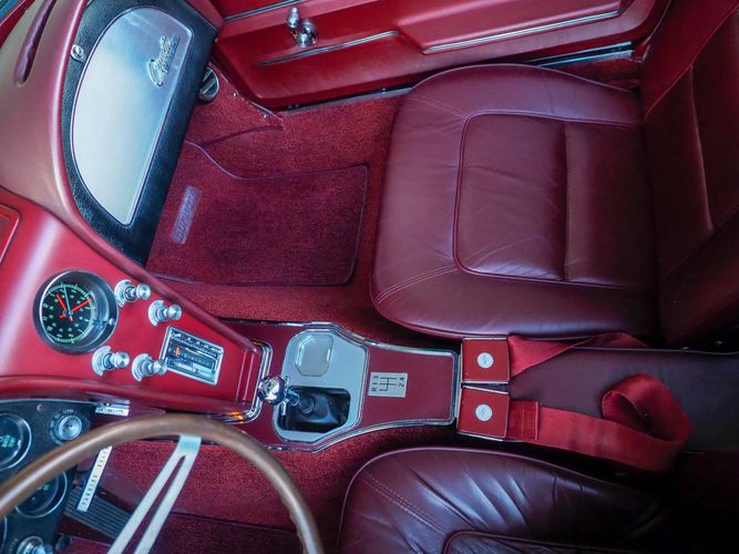 The razor straight body of this corvette really compliments the Milano red and whether you have the tan soft top up, the matching red hardtop, or no top, this Corvette is just flat our gorgeous. It is paired with a restored matching Milano red leather interior with new door panels, carpet, refurbished gauges, dash, center console and newer leather bucket seat covers. All the gauges and lights work as they should and the A/C blows ice cold.