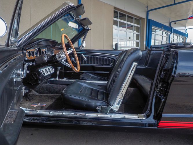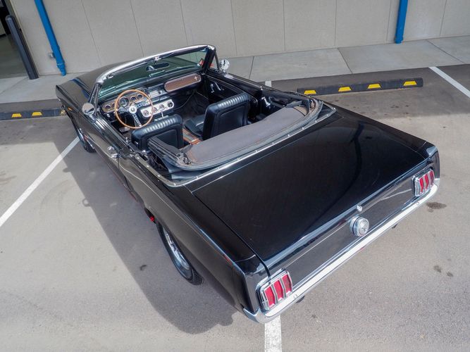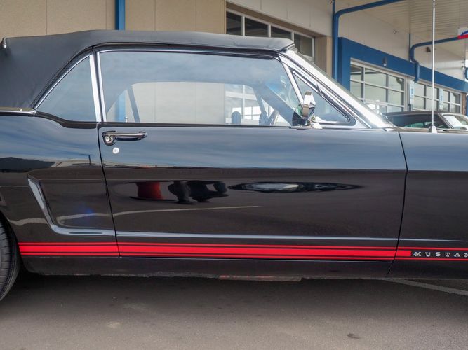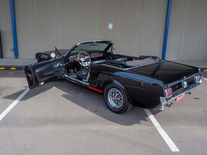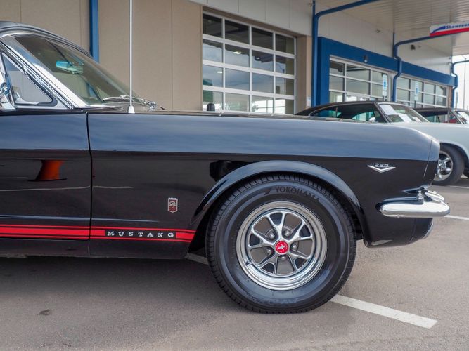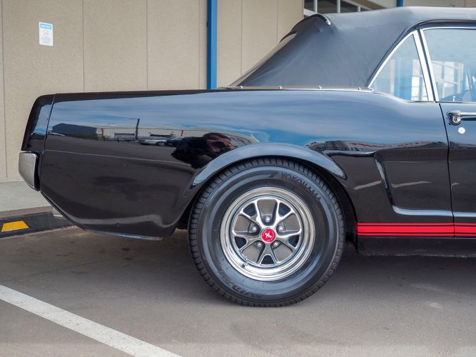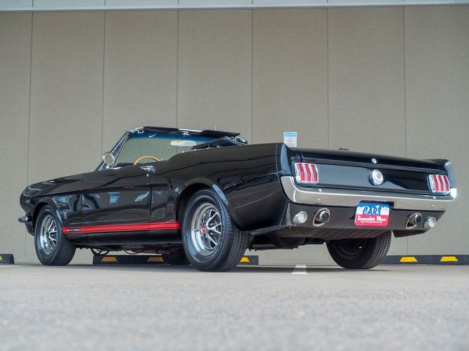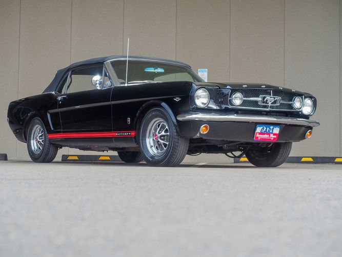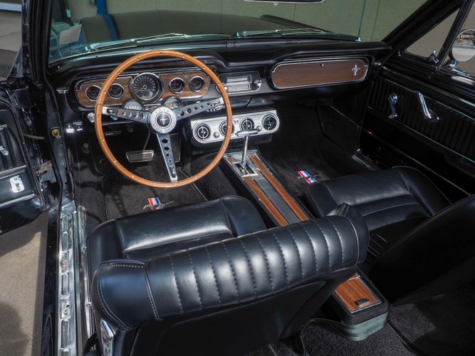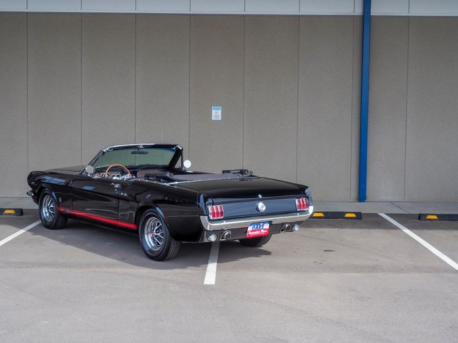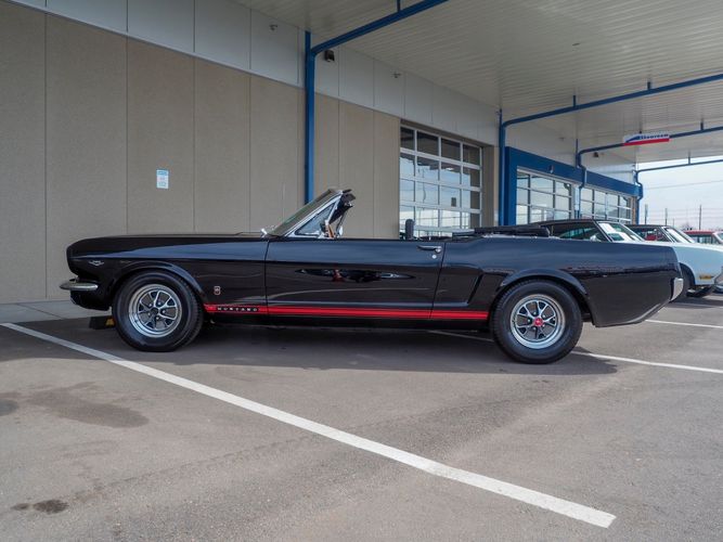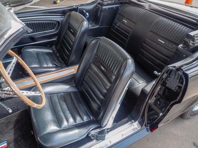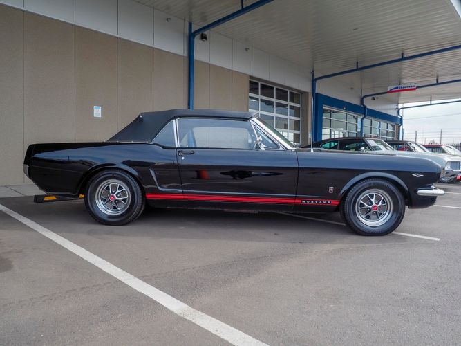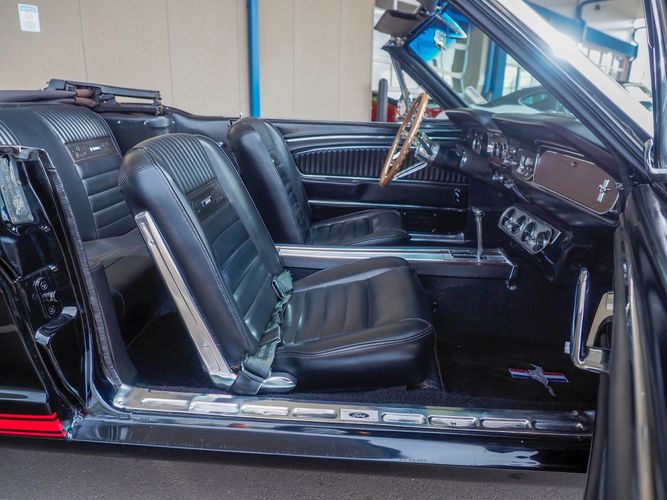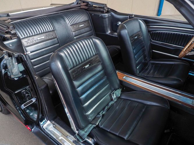 It is sporting a triple black color combo with red rally stripes across the side complete with GT badging. The black exterior paint job is very high quality and has a great shine to it overall. The power convertible top cover appears to be in excellent shape. Riding on original style wheels give it an authentic period-correct feel and driving experience. Under the hood is an "A" code 289 V8 running strong. Paired to an automatic with a conventional 2.80 rear end ratio makes this the ultimate cruising convertible Mustang that can be driven anywhere reliably. Overall this is an excellent Mustang GT that is very original and full of desirable options.
