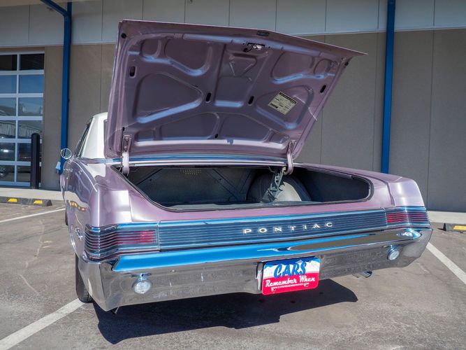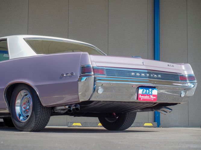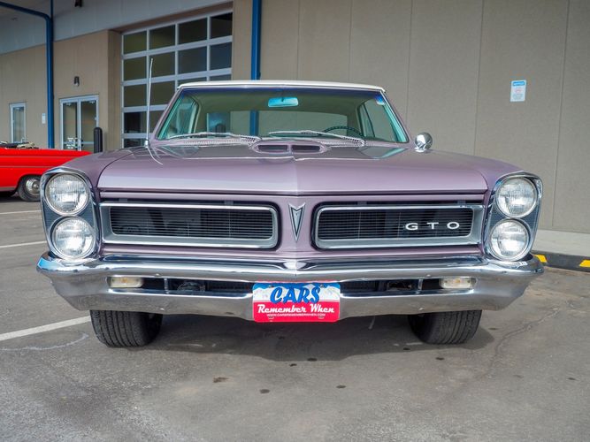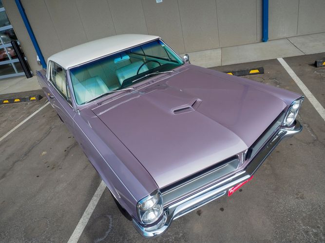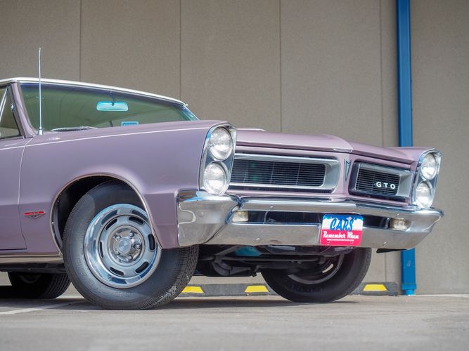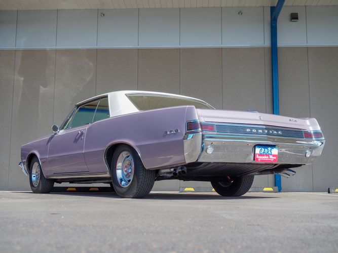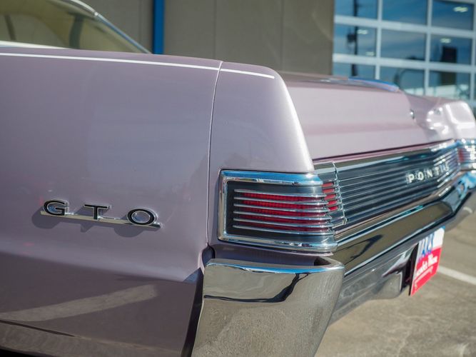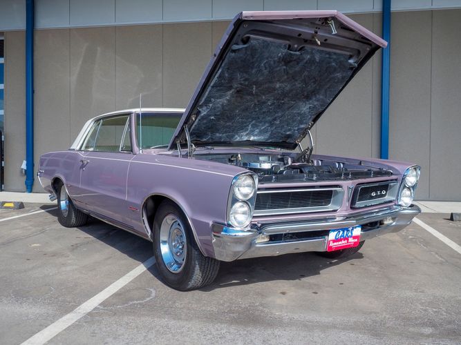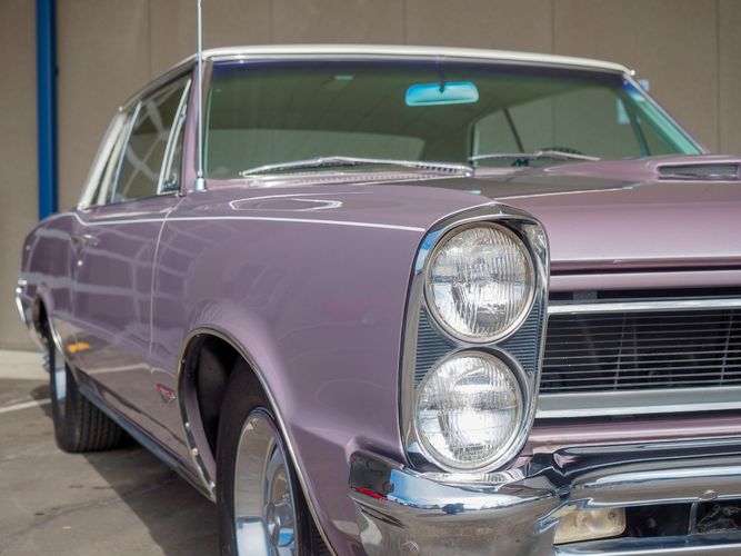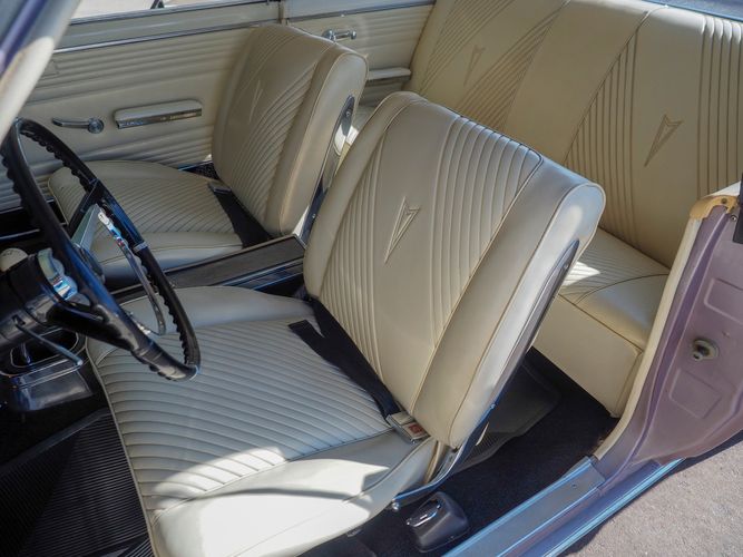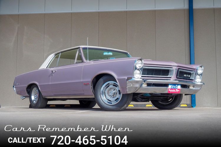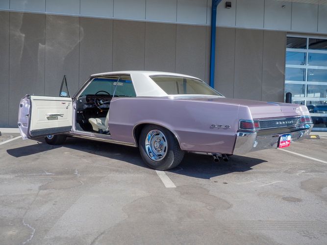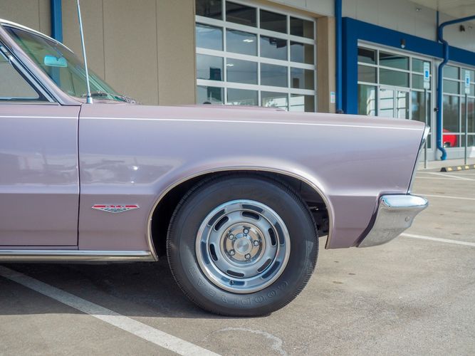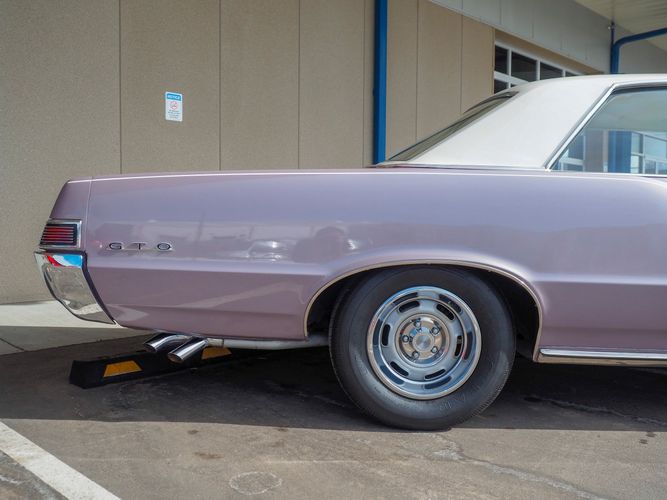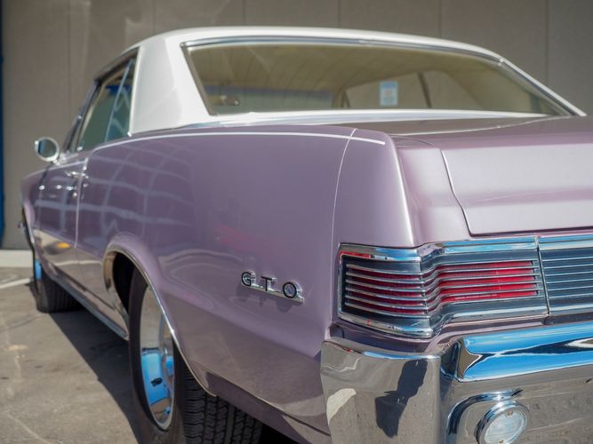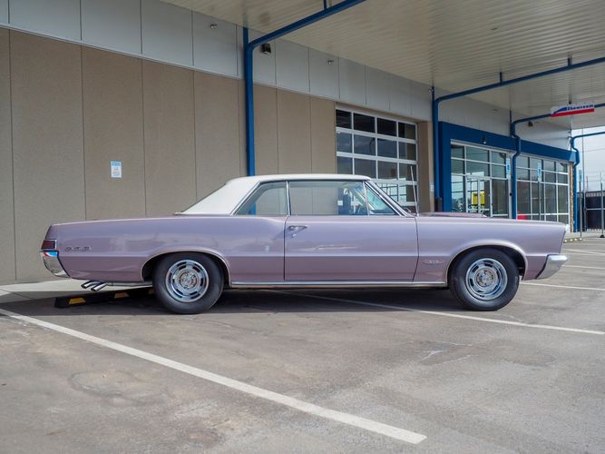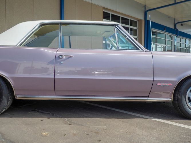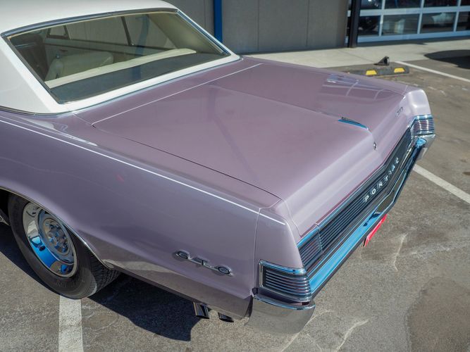 You are looking at a beautiful 1965 GTO finished in the rare factory correct Iris Mist with a Cameo Ivory top. This is a very rare and desirable color combo. The body is razor straight and has a great shine too it. It is believed to have all original sheet metal with only 1 repaint. The overall fit and finish is top notch with nice gaps on all the panels and no vibrations when going down the road. All of the lights, gauges, wipers and the horn work as they should. The interior is nicely restored in the factory correct black and white parchment material. The white interior paired with the Cameo Ivory roof and Iris Mist body is stunning.