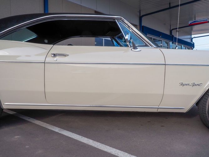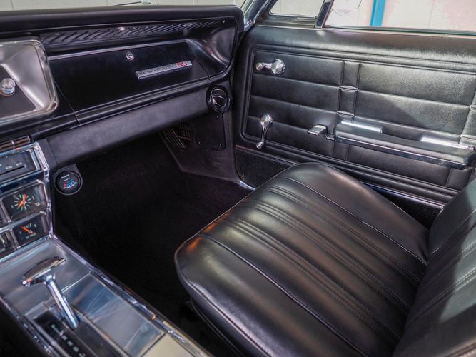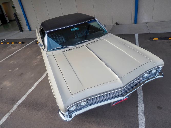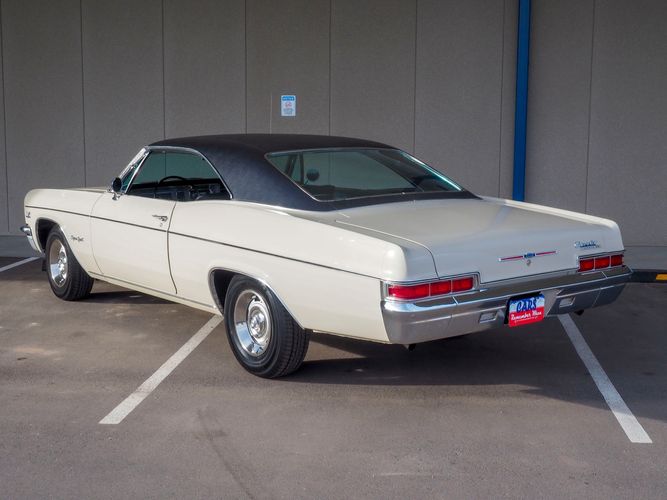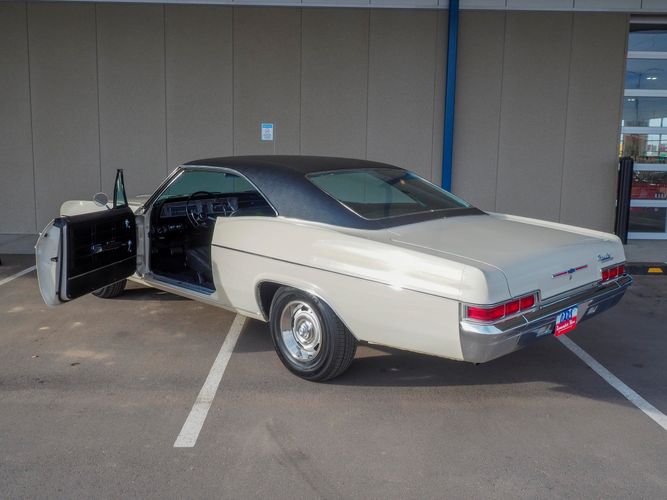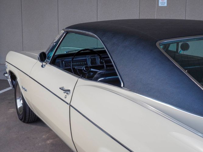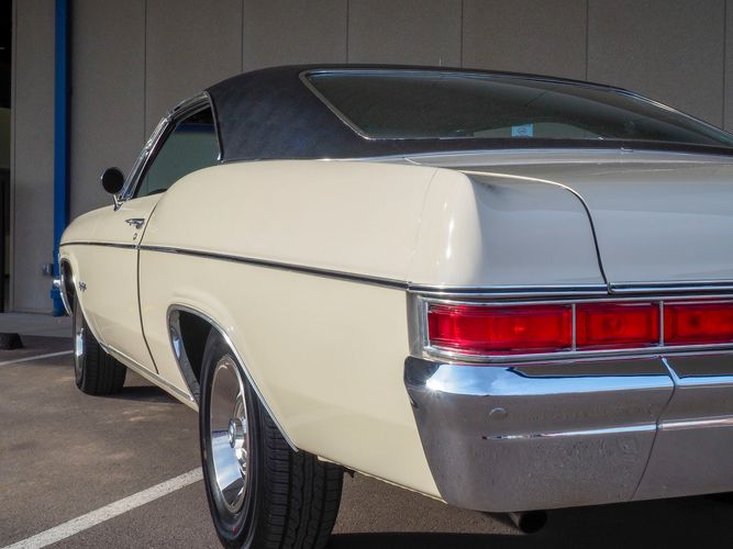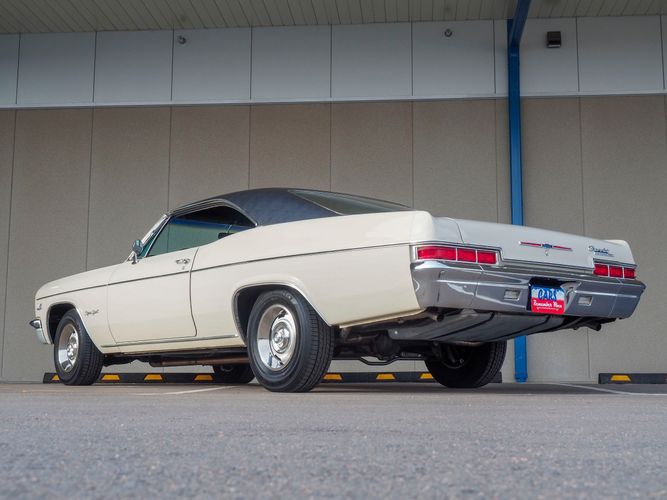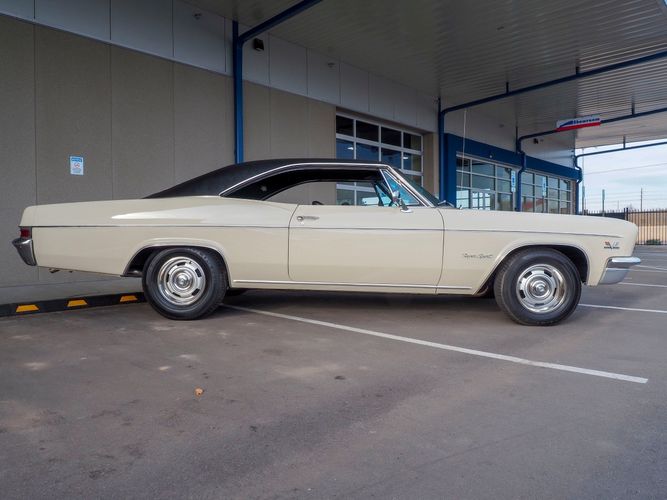 Beautifully restored in its correct Adobe Beige paint, black vinyl bucket interior, numbers matching 396 big block V8 and tastily optioned with cold factory A/C, power steering and brakes, this Impala is the real deal. This is one nice ride that needs nothing and is ready to be driven reliably. The body is razor straight and you can tell a professional painted the car as the paint finish quality is very high. The bucket seat console interior is very nicely restored, comfortable and has a cool center gauge package as well as a factory tach. The interior is fully restored with new carpet, door panels, headliner, seat covers and a reconditioned center console.