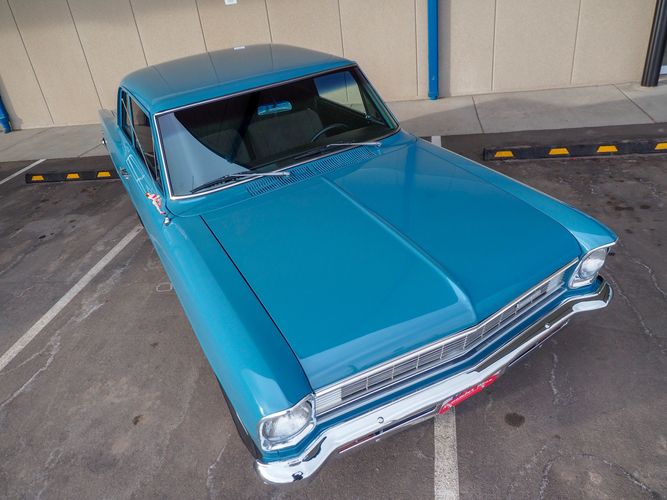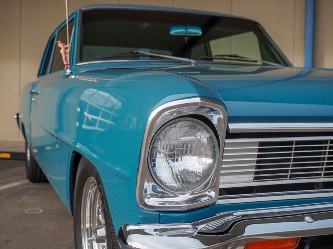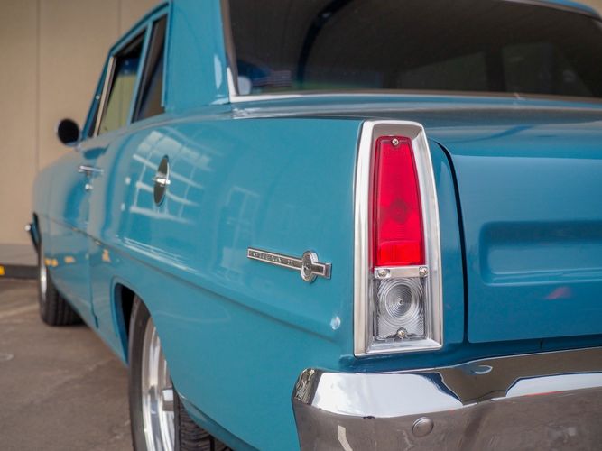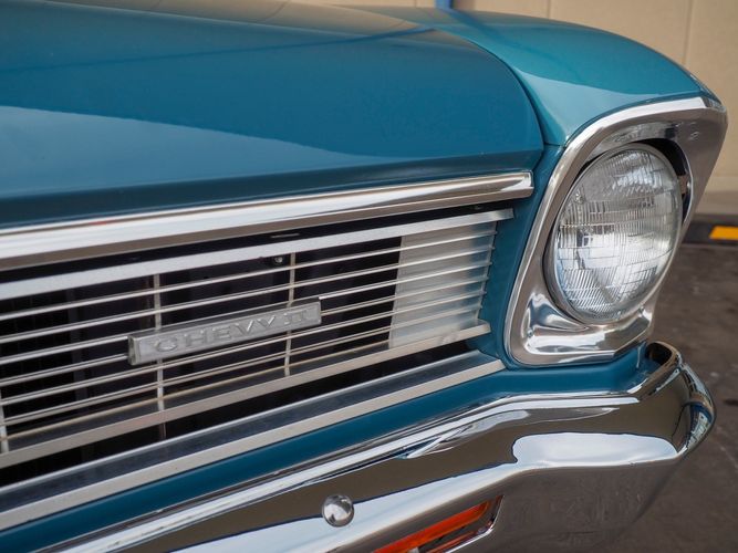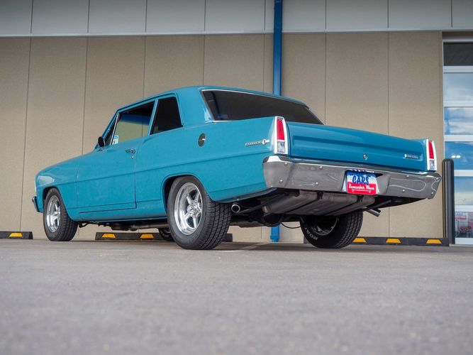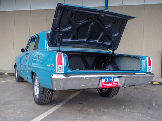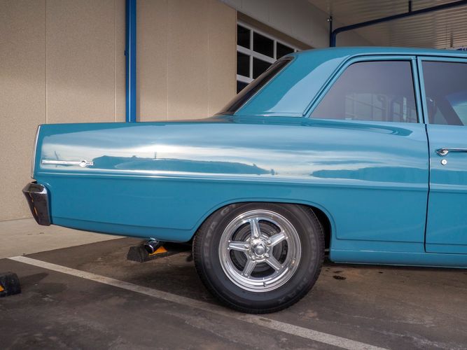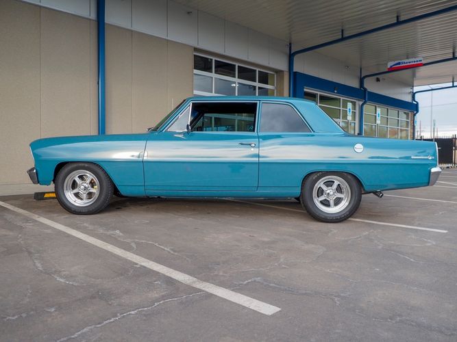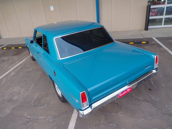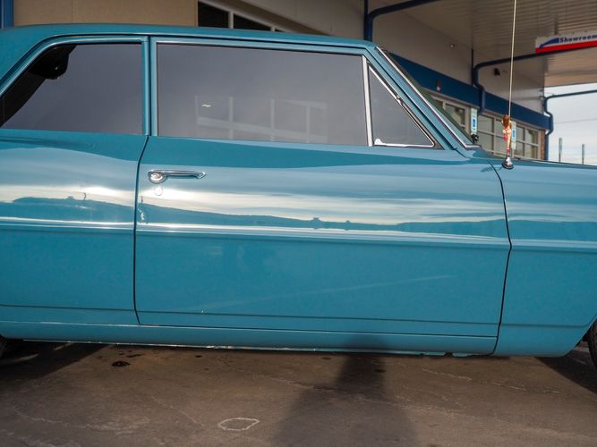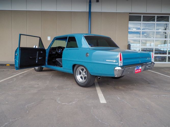 This Nova is sporting a very pretty, unique paint most would describe as a blue/turquoise mix. Overall the paint quality is very good, the body is razor straight and has a great shine. Paired with 15in chrome wheels, new tires and smoked windows this is one cool coupe with a great stance and look.