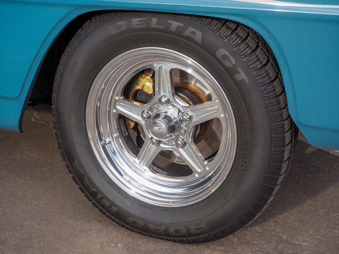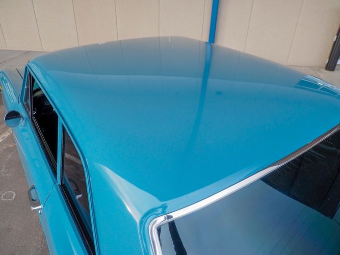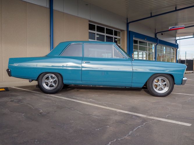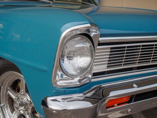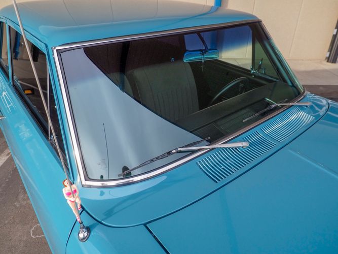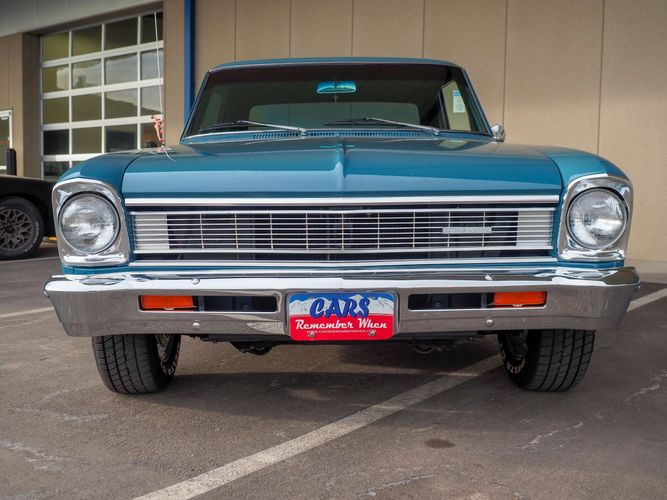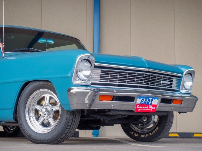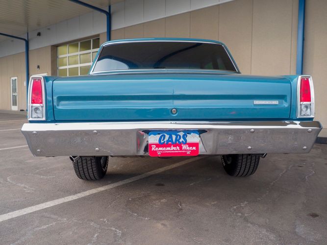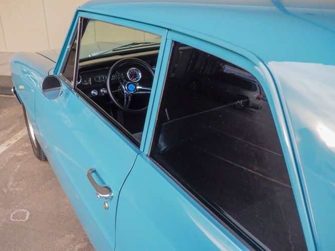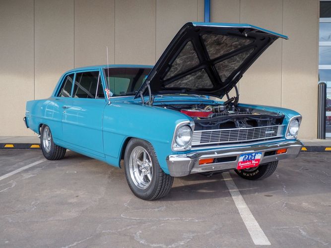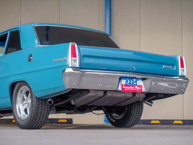 This Nova is sporting a very pretty, unique paint most would describe as a blue/turquoise mix. Overall the paint quality is very good, the body is razor straight and has a great shine. Paired with 15in chrome wheels, new tires and smoked windows this is one cool coupe with a great stance and look.
