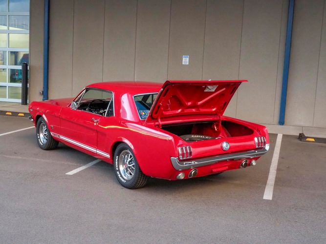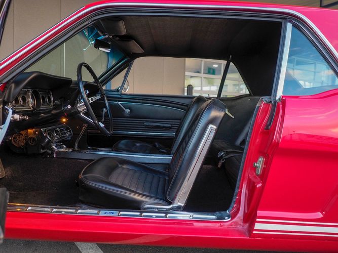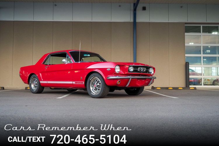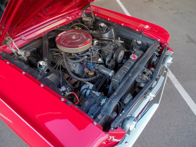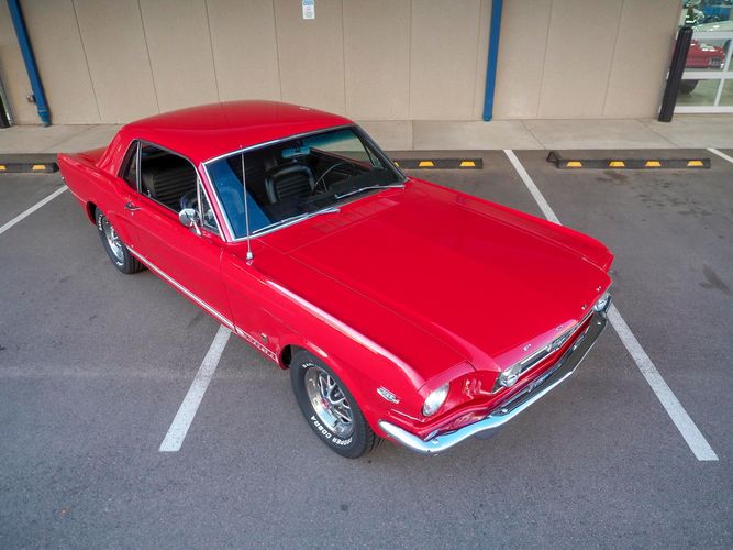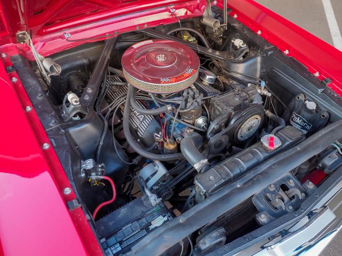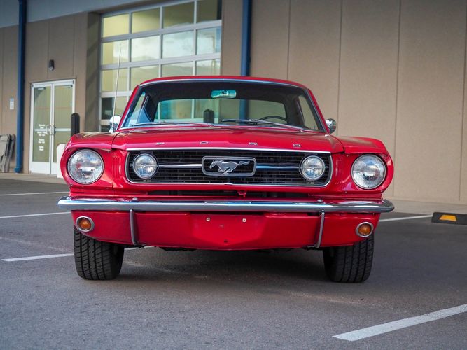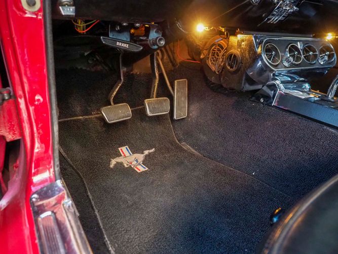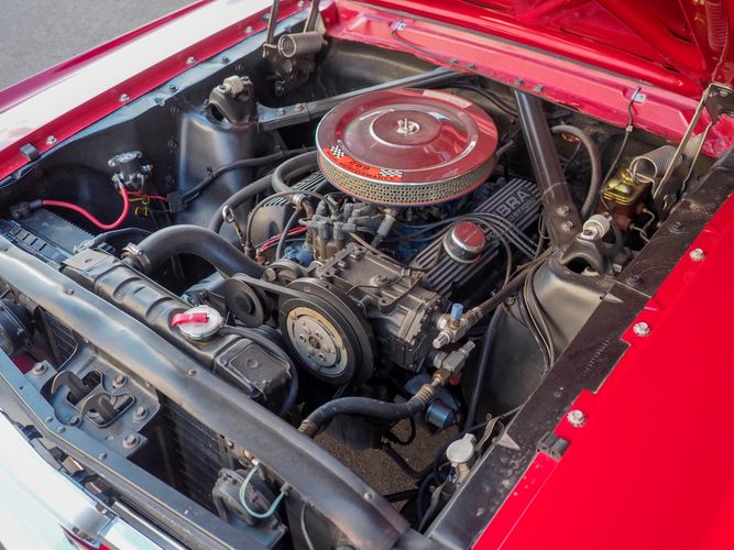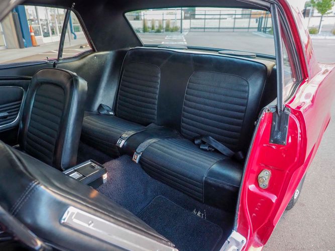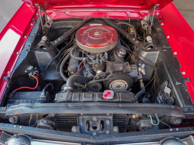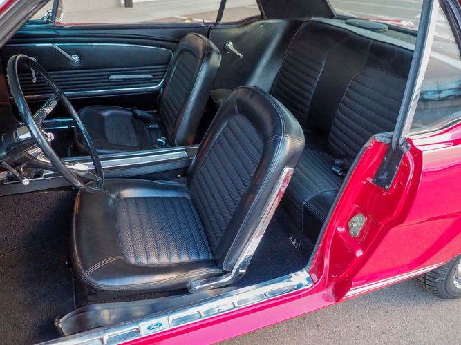 Originally a "T" code L6 car, it is now a 289 V8 GT clone with factory air, 4-speed, black leather bucket seats, console, and a beautiful candy apple red paint job. This Mustang is the ultimate cruiser with many drivability upgrades on it. You can drive this car with confidence as the entire suspension has been rebuilt and the front has been upgraded to disc brakes making the car very safe. The interior is nicely restored with cold A/C and a good Alpine stereo system. The current running condition is excellent. The 289 V8 runs strong and sounds great. Paired to a 4-speed it is fun to drive and makes for a desirable drivetrain. Overall this is a very well done restoration that was built to drive! We would feel confident driving this car anywhere!