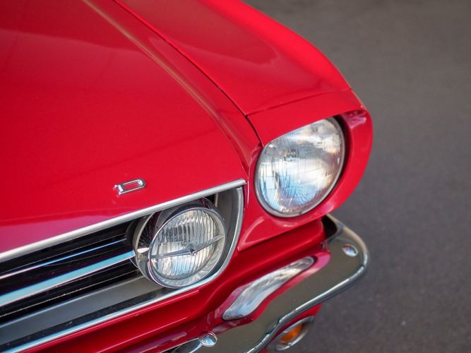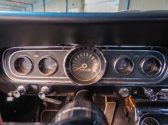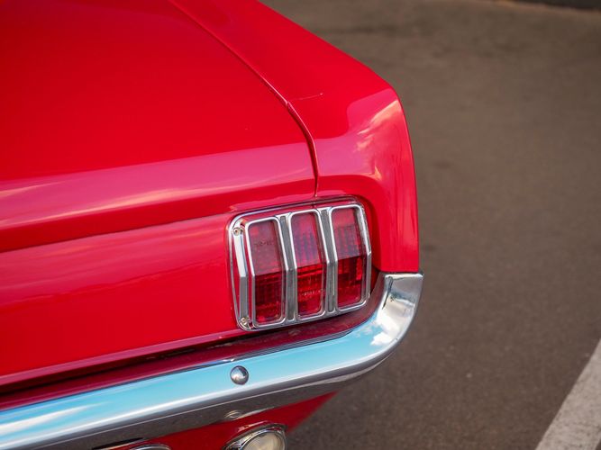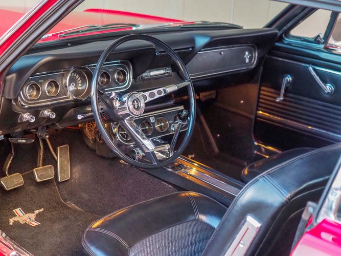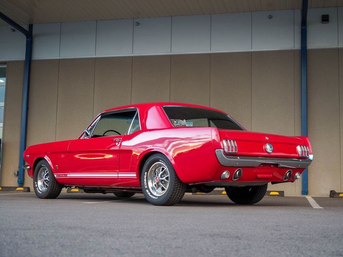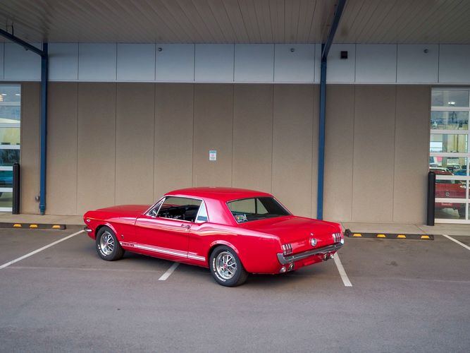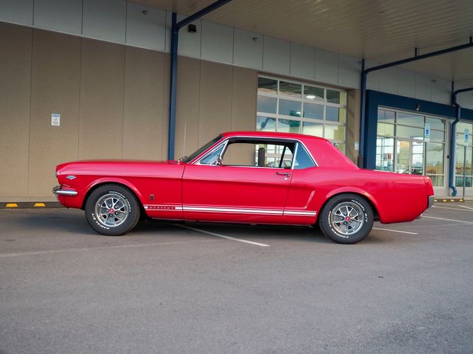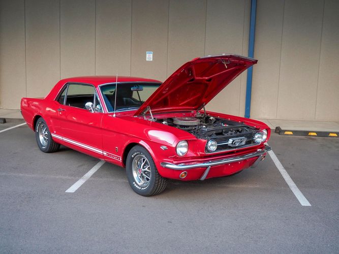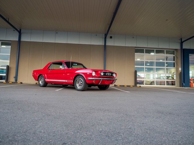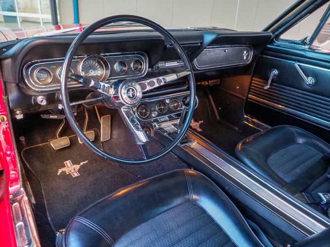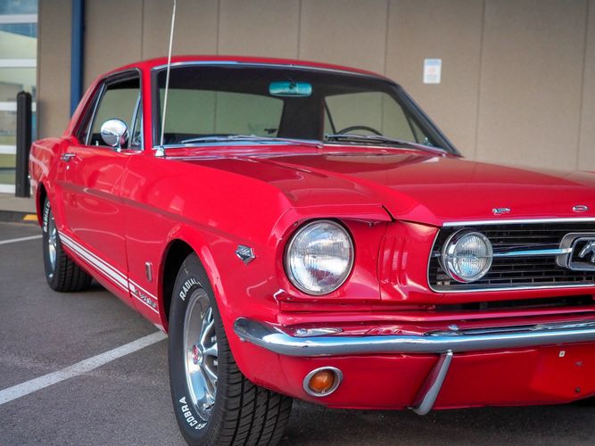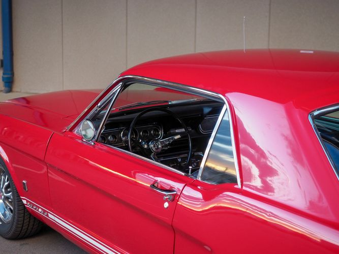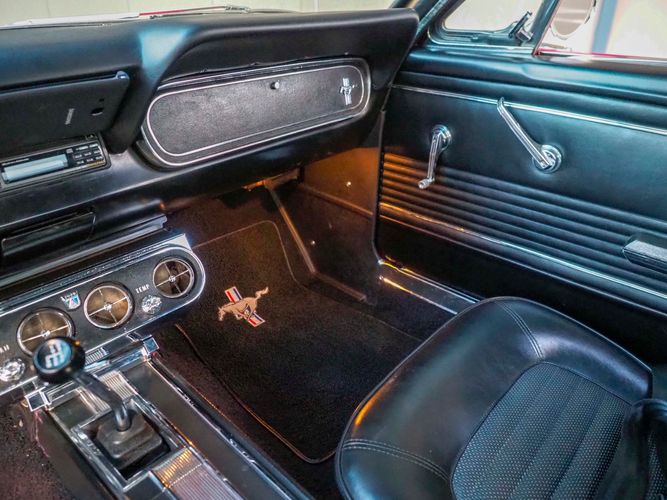 Originally a "T" code L6 car, it is now a 289 V8 GT clone with factory air, 4-speed, black leather bucket seats, console, and a beautiful candy apple red paint job. This Mustang is the ultimate cruiser with many drivability upgrades on it. You can drive this car with confidence as the entire suspension has been rebuilt and the front has been upgraded to disc brakes making the car very safe. The interior is nicely restored with cold A/C and a good Alpine stereo system. The current running condition is excellent. The 289 V8 runs strong and sounds great. Paired to a 4-speed it is fun to drive and makes for a desirable drivetrain. Overall this is a very well done restoration that was built to drive! We would feel confident driving this car anywhere!