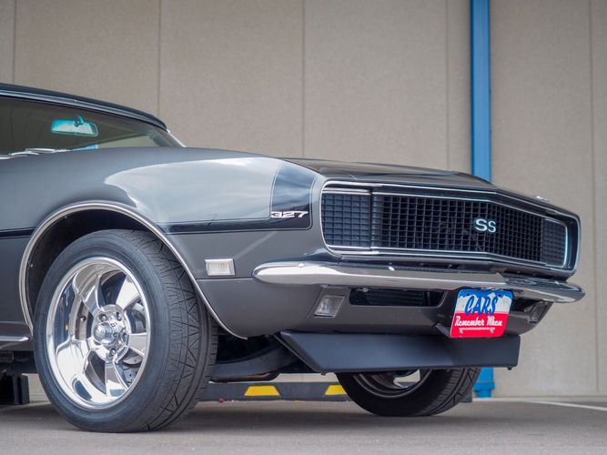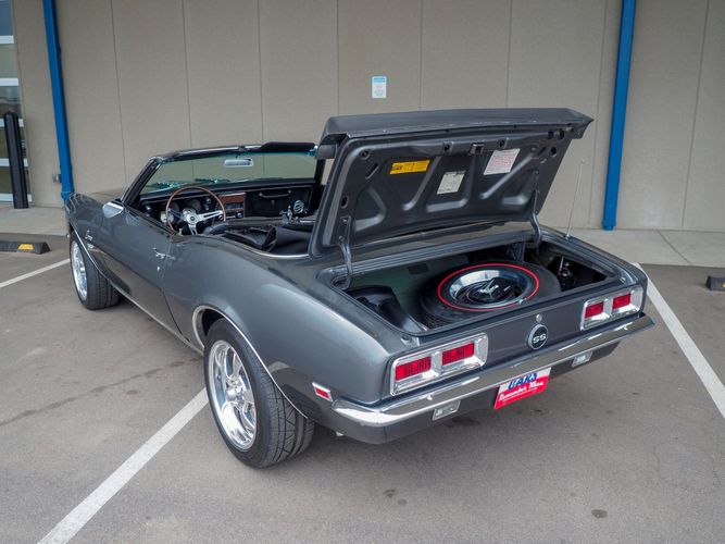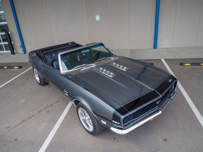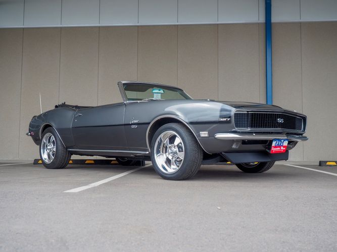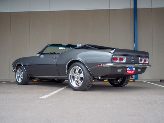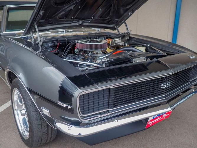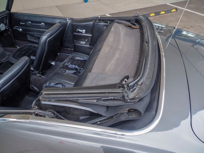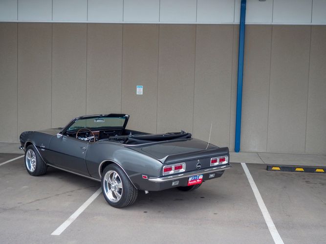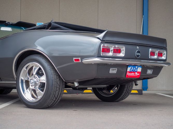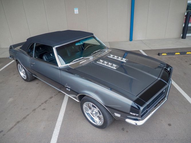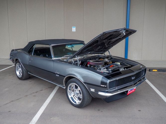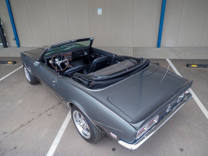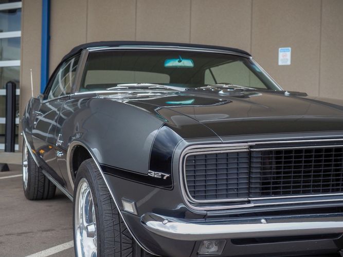 The paint, four-speed, rumbling exhaust, and iconic 327 small block V8 make this fully-built 1968 Chevrolet Camaro convertible an incredible driver. The paint colors are simply stunning and eye catching with the chrome accents. You can tell there was a nice investment to get this black and silver so smooth. Riding on front 17'' and rear 18'' chrome wheels give a nice stance and better handling with the low profile tires. 4-wheel power Wilwood disc brakes provide safe and fast stopping. Under the hood is a nicely detailed 327 V8 engine paired to a 4-speed manual transmission. This is a great cruiser Camaro with a nice idle exhaust lope and will cruise 70mph with low rpms. Power convertible top operates smooth and fast (see video) and the power steering is smooth as well. The undercarriage is fully restored with all new rubber and rides very smooth. Overall if you are looking for head turning, iconic classic Camaro look no further!