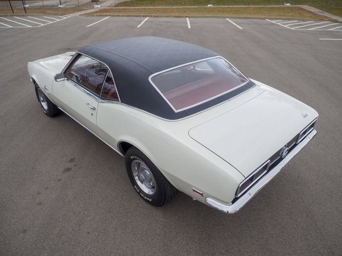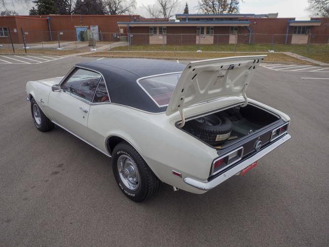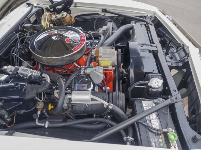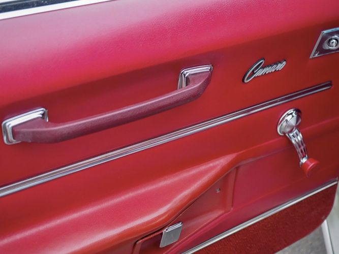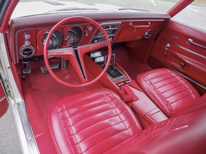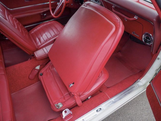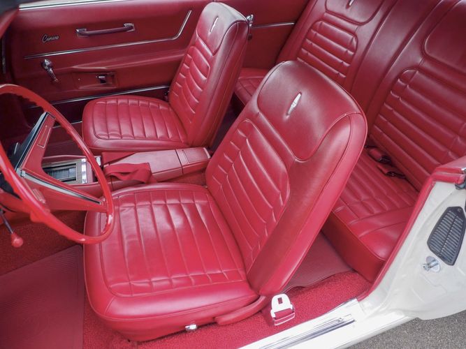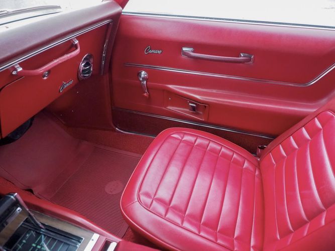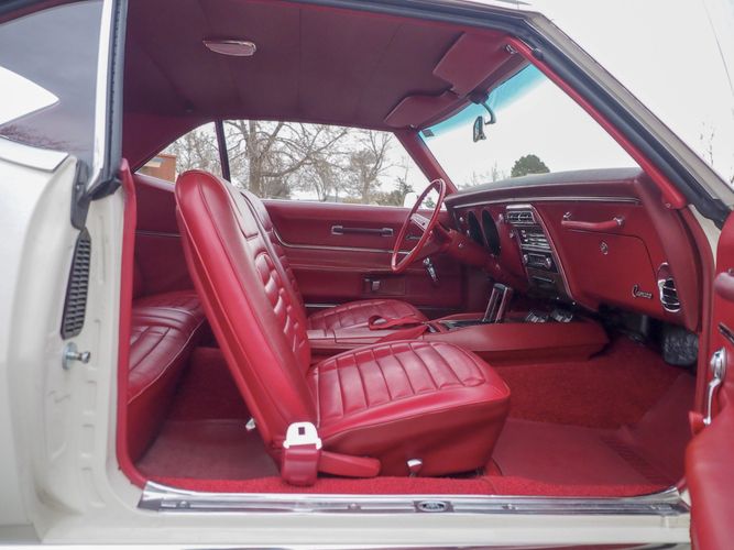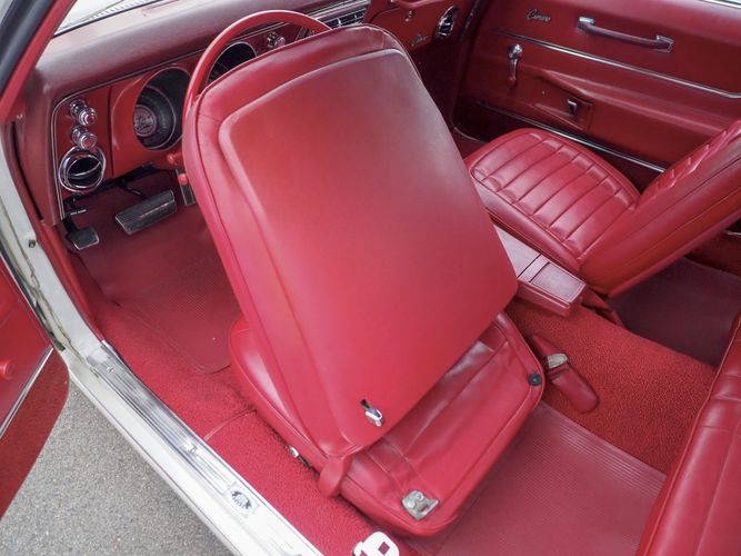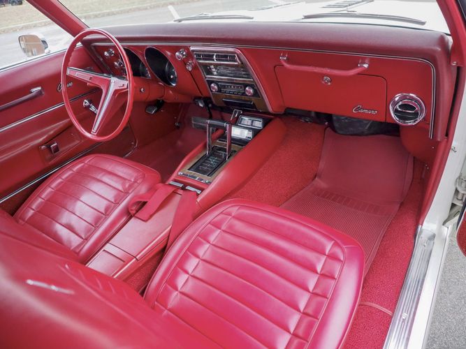 This Camaro appears to be highly optioned with a stunning red bucket seat console interior, deluxe interior, gauge package, factory A/C, and Ermine white with a black vinyl top. This car was reportedly sold new in California and does retain its original smog equipment. Other equipment includes power front disc brakes, power steering, and a TH400 automatic transmission.
