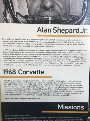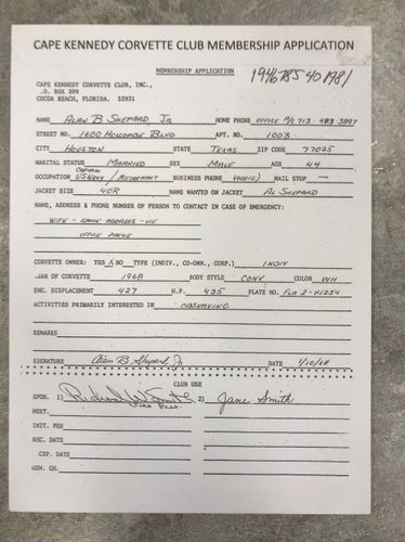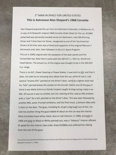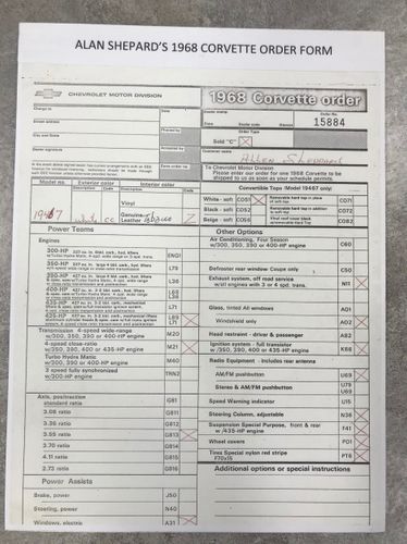 Alan Shepard acquired this car from Jim Rathmann Chevrolet in Melbourne, Florida as part of the Astronaut Courtesy Car Program in late 1967. Alan got to lease this car for one year for the cost of $1. He custom ordered it with the highest horsepower option available- the 427/435hp L89 with tri-power & aluminum heads. Only 624 Corvettes were produced in 1968 with this engine. The current L89 engine in the car is a dealer warranty replacement that was installed in the first year of ownership. The old rumors of Astronauts racing their Corvettes could be true as Alan certainly blew up his original engine.