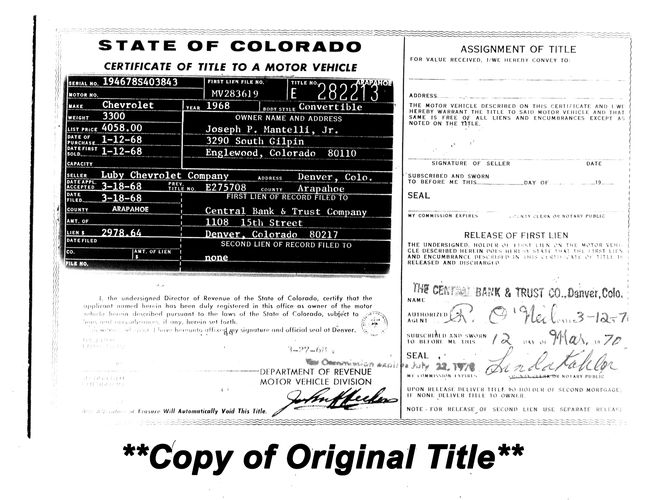 Check out this 1968 Corvette in survivor condition, originally sold at Luby Chevrolet in Denver Colorado.It is showing a mere 38,152 miles on the odometer that is believed to be original and supported by the title. This vehicle has had only one owner since it was acquired by our dealership. Make sure to take a look at the copy of the original title included with the vehicle.
