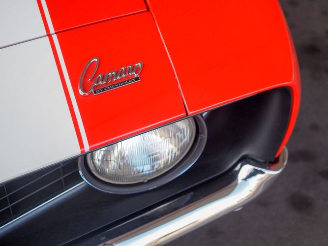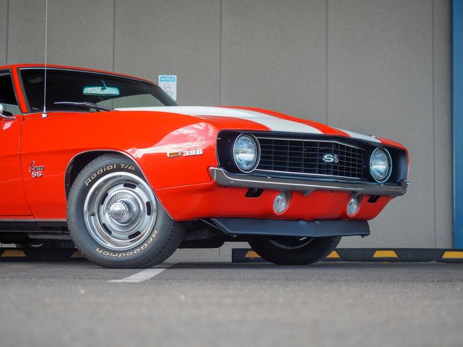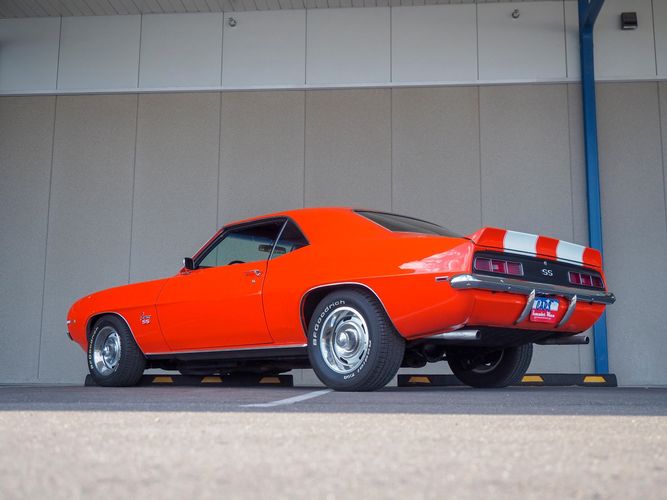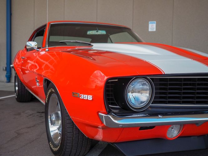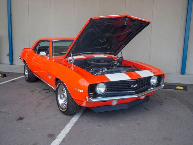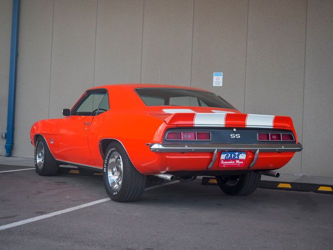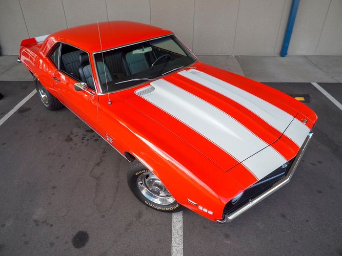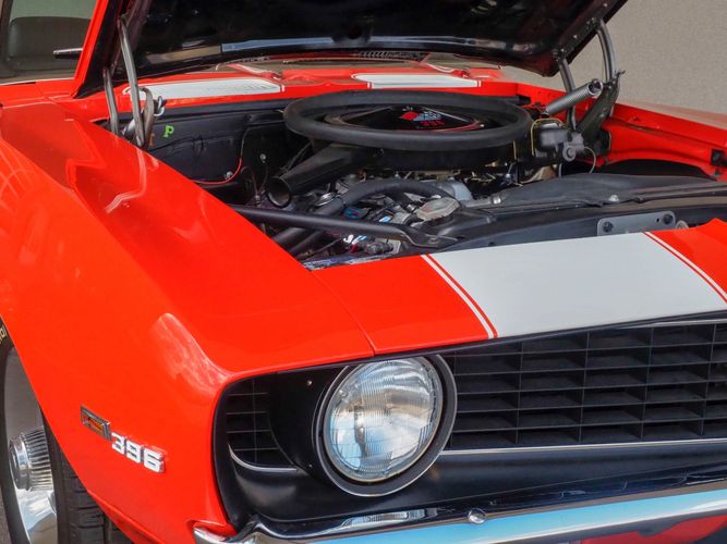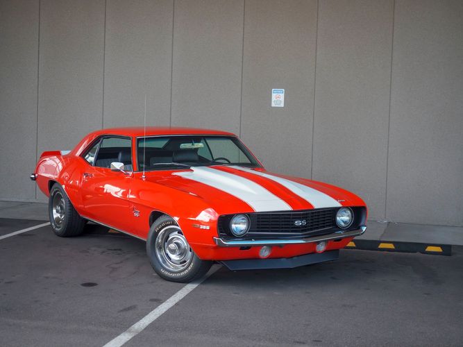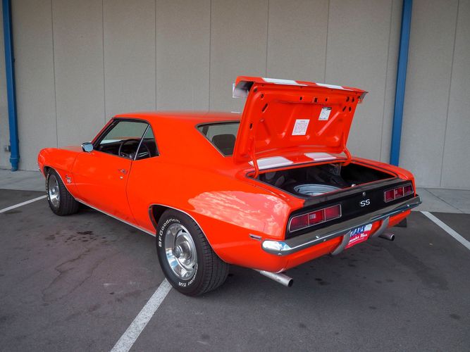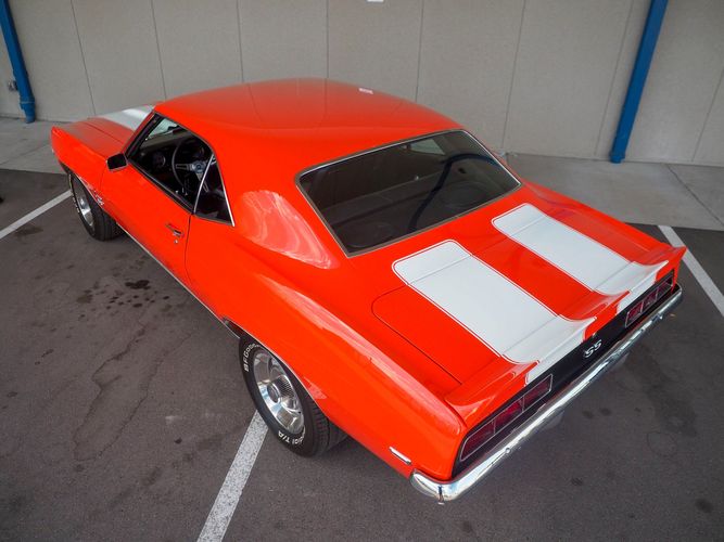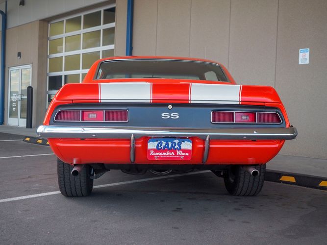 This 1969 Chevrolet Camaro SS is laser straight and has all the right features. The 1st generation Chevrolet Camaro is one of the most recognizable cars in the world thanks to its distinguishable lines. The 69' Camaro would receive an extensive lower-body facelift that featured a newly restyled grille and bumpers, round parking lights and a reshaped tail. While the wheelbase remained at 108 inches, the '69 body looked longer, lower and more muscular than the 67/68 models thanks to harder lines. This 1969 Camaro SS is finished in Hugger Orange with white SS stripes and sports the special ducted hood along with front and rear spoilers. Exterior SS options also include black sill moldings, a special suspension and applicable SS badging. The black interior features houndstooth bucket seats, a center console with gauges and the popular horseshoe shifter. Interior amenities include a Pioneer CD stereo, heat and defrost, wood-grain console and dash inserts, and the carpet is in good condition. A 396/350 HP V-8 engine is equipped with an Edelbrock Performer intake, MSD ignition, headers and dual exhaust. Power from the formidable 396 CI powerplant is sent to the rear rally wheels fitted with BF Goodrich radial tires through an automatic TH400 transmission. The car features power steering and front disc brakes to aid the driver in controlling this beast. This is a sharp-looking example of an American icon and one of the most recognizable cars ever built.
