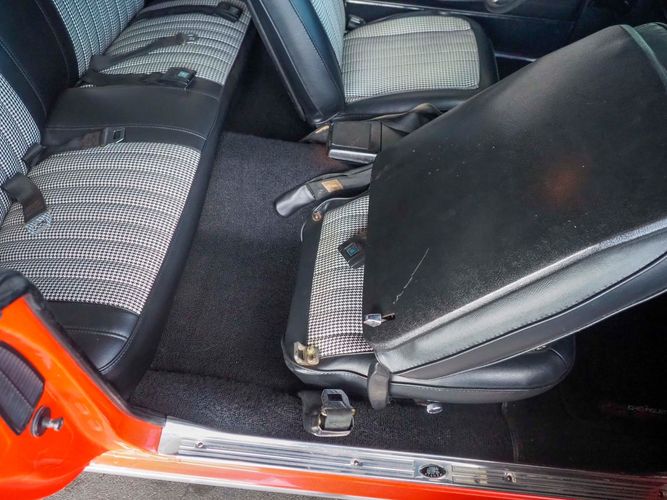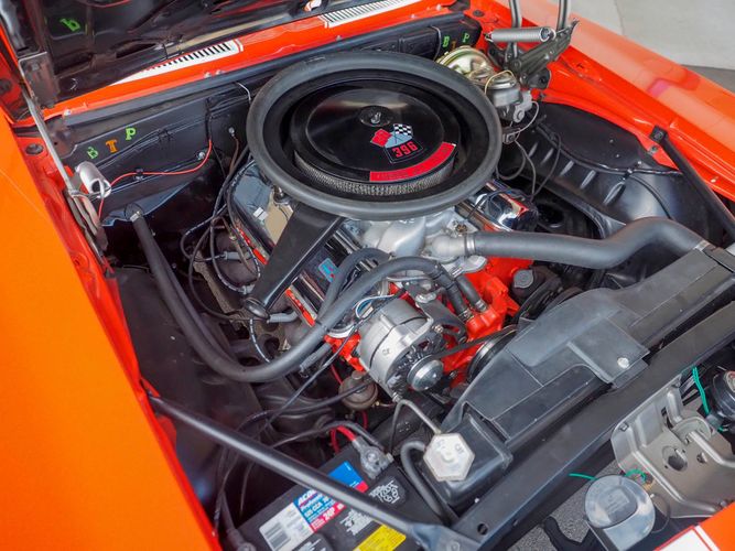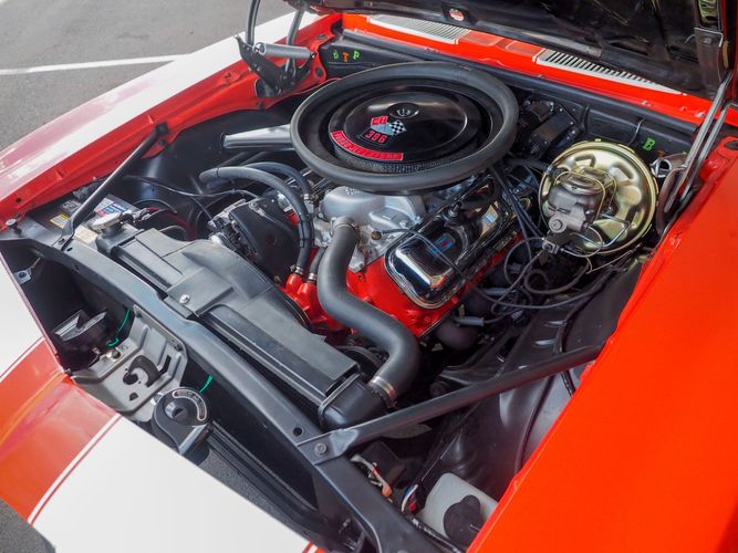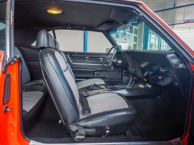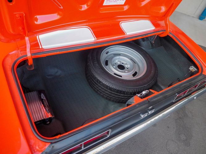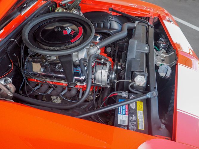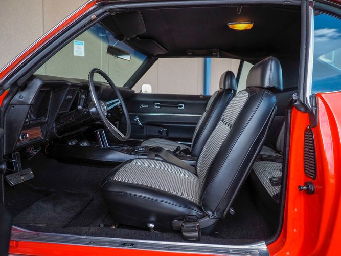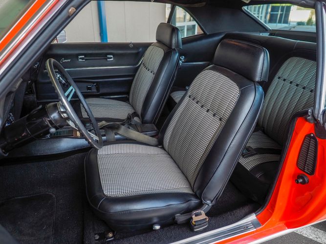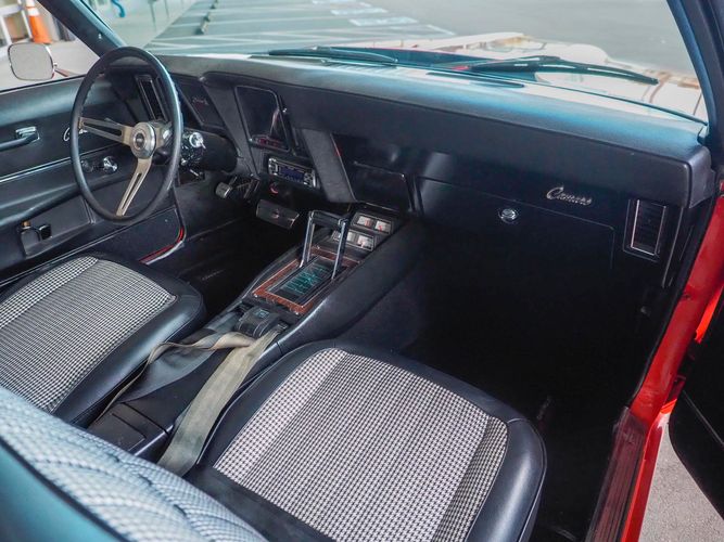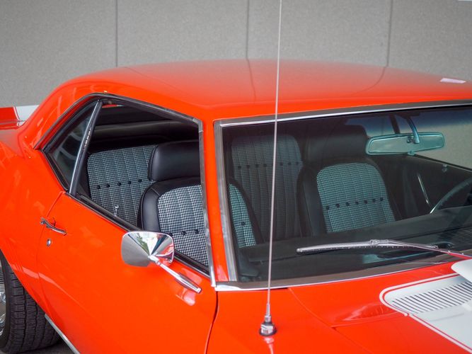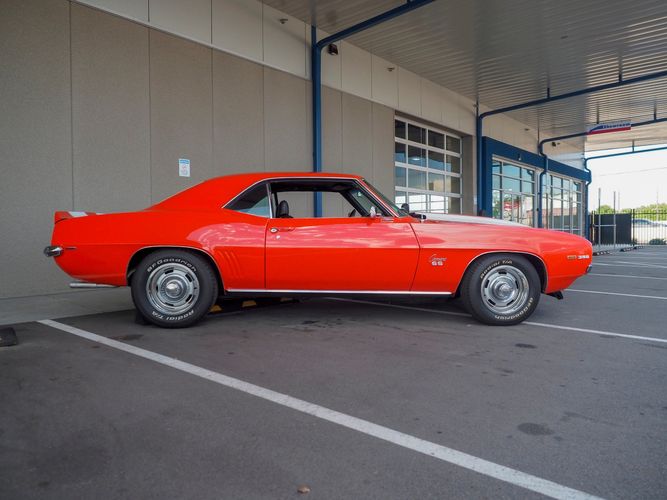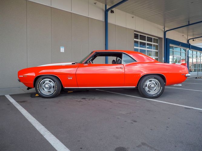 This 1969 Chevrolet Camaro SS is laser straight and has all the right features. The 1st generation Chevrolet Camaro is one of the most recognizable cars in the world thanks to its distinguishable lines. The 69' Camaro would receive an extensive lower-body facelift that featured a newly restyled grille and bumpers, round parking lights and a reshaped tail. While the wheelbase remained at 108 inches, the '69 body looked longer, lower and more muscular than the 67/68 models thanks to harder lines. This 1969 Camaro SS is finished in Hugger Orange with white SS stripes and sports the special ducted hood along with front and rear spoilers. Exterior SS options also include black sill moldings, a special suspension and applicable SS badging. The black interior features houndstooth bucket seats, a center console with gauges and the popular horseshoe shifter. Interior amenities include a Pioneer CD stereo, heat and defrost, wood-grain console and dash inserts, and the carpet is in good condition. A 396/350 HP V-8 engine is equipped with an Edelbrock Performer intake, MSD ignition, headers and dual exhaust. Power from the formidable 396 CI powerplant is sent to the rear rally wheels fitted with BF Goodrich radial tires through an automatic TH400 transmission. The car features power steering and front disc brakes to aid the driver in controlling this beast. This is a sharp-looking example of an American icon and one of the most recognizable cars ever built.