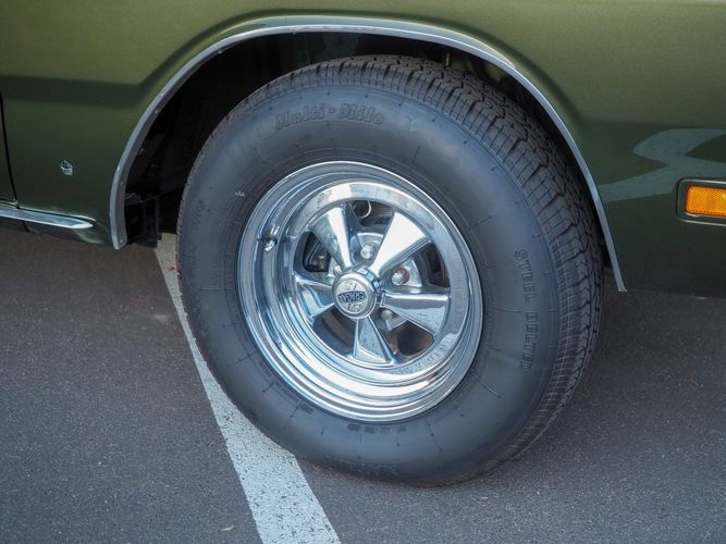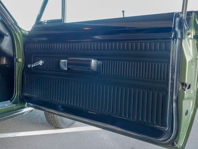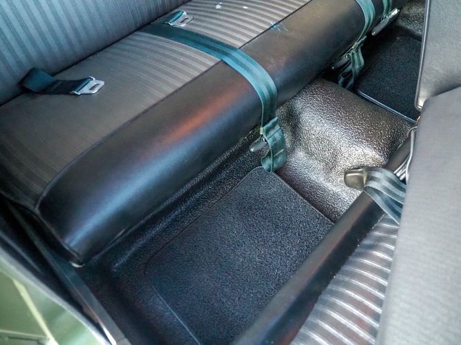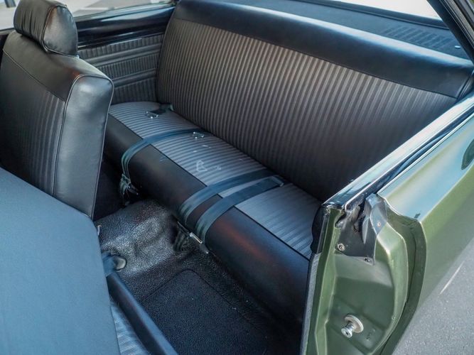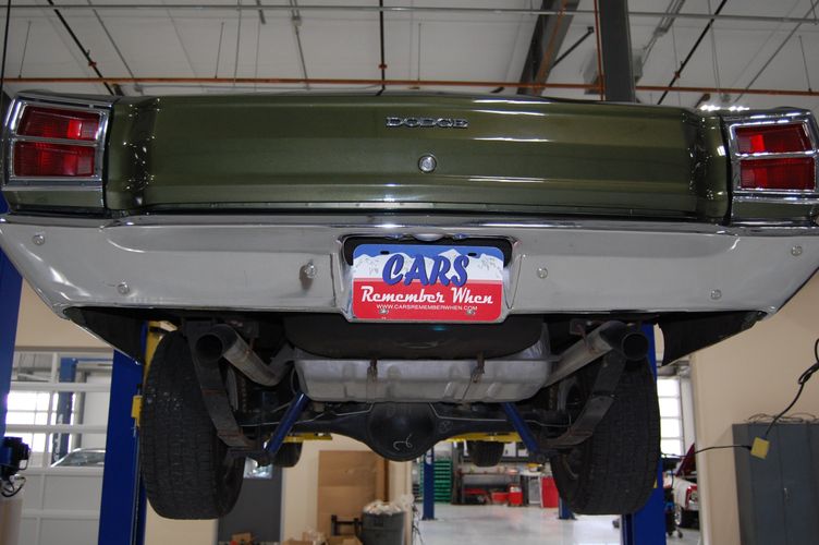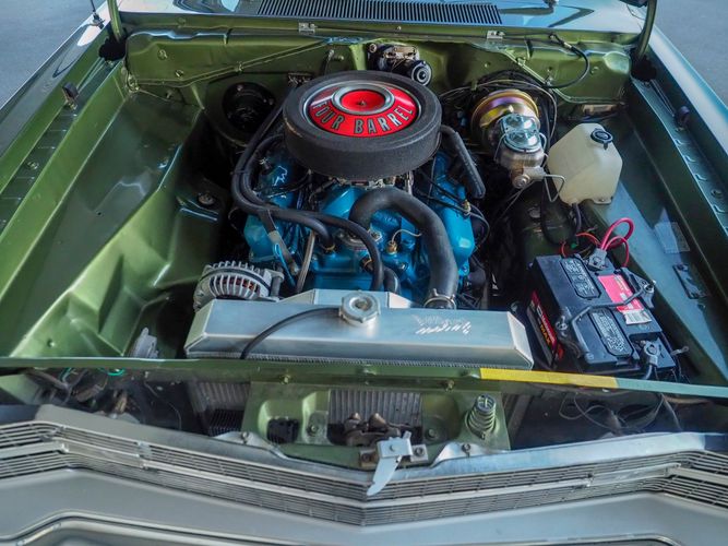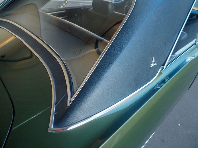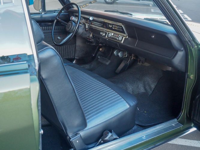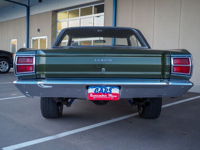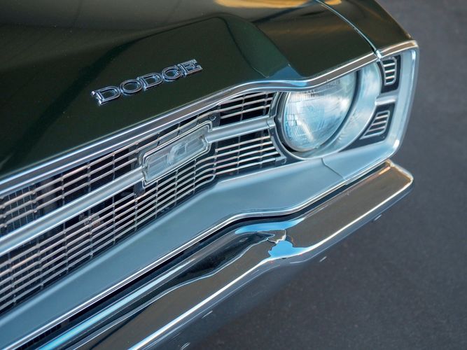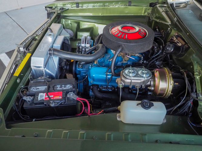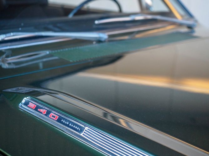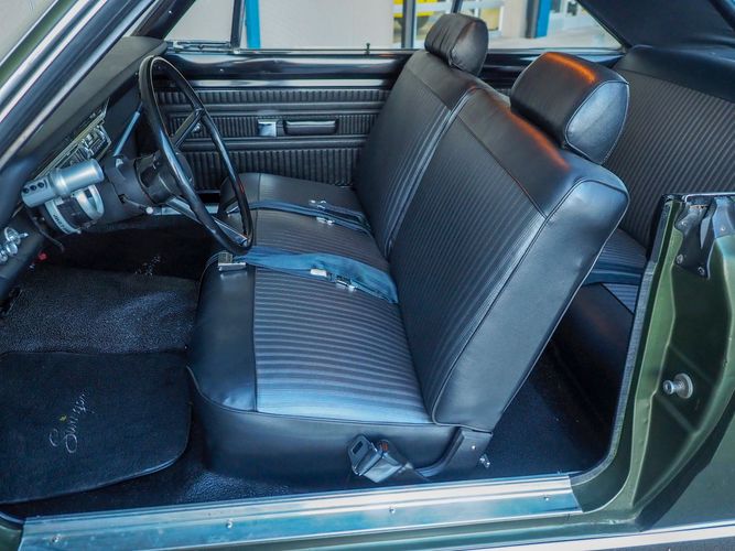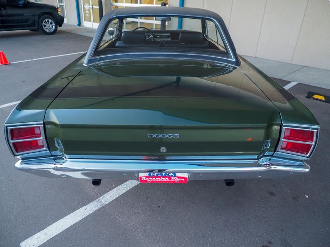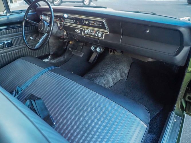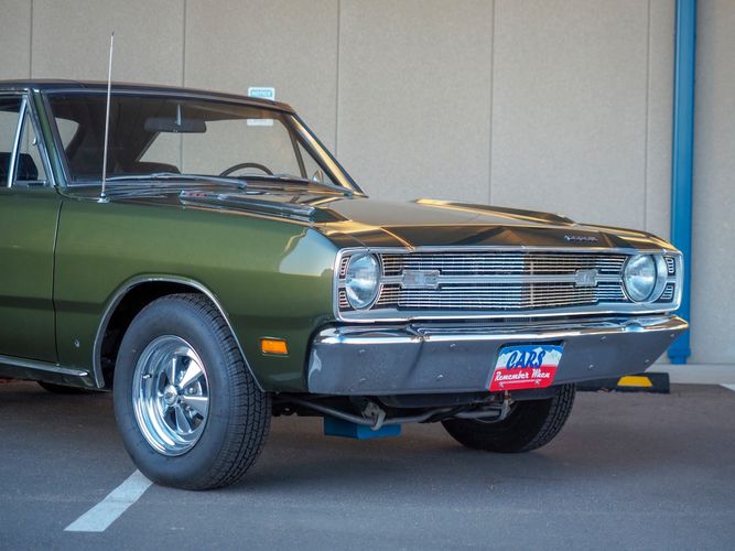 This Dart underwent a complete restoration and now stunts a beautiful forest green exterior with a black vinyl top. The body is very straight and sports a great stance. All the chrome bumpers and trim are in great condition. The interior is nicely restored with new seat upholstery, headliner, seat belts and door panels. The dash is nicely detailed and includes a nice original radio, climate control system and gauges. The interior is very roomy and comfortable overall for cruising to car shows or just around town!