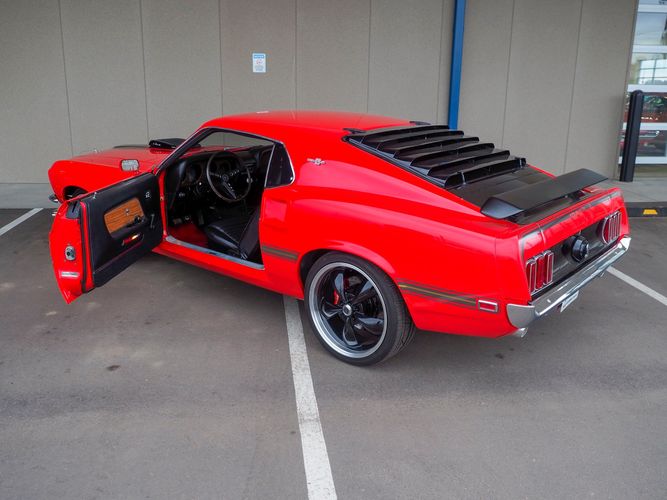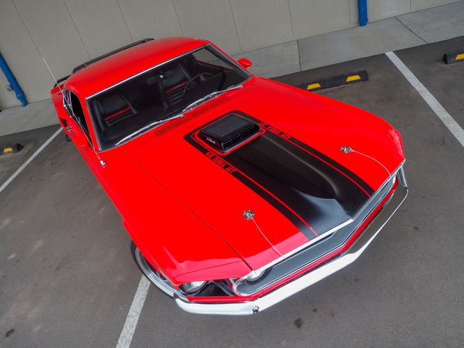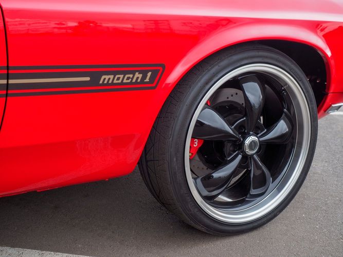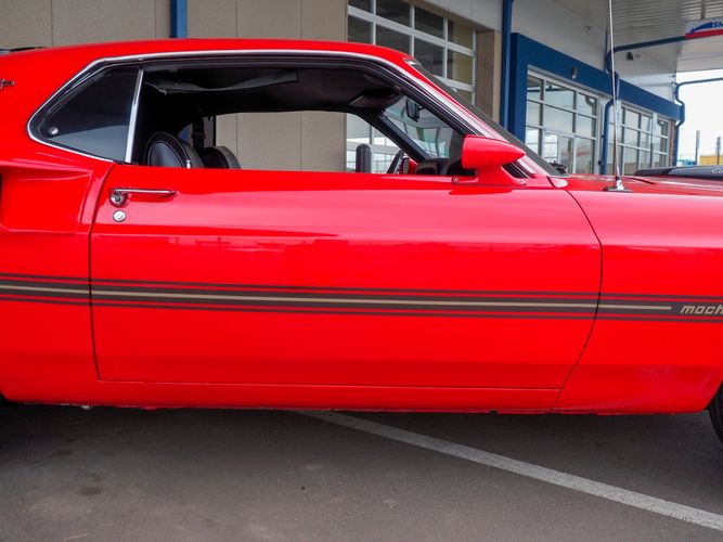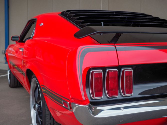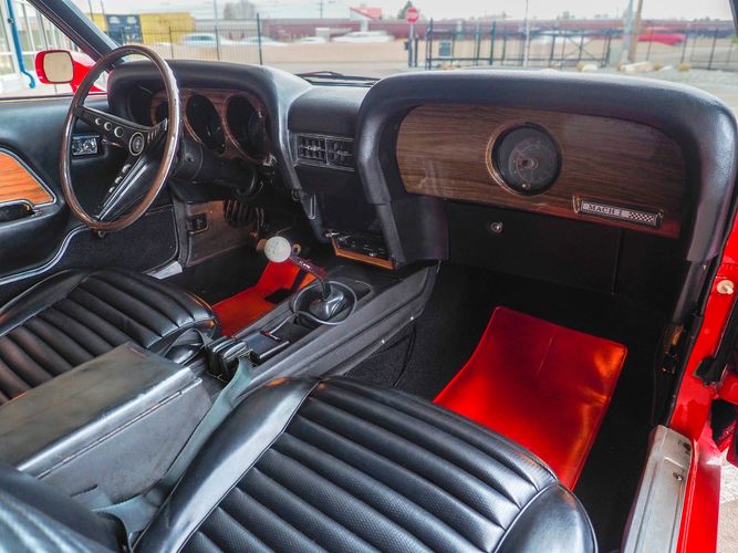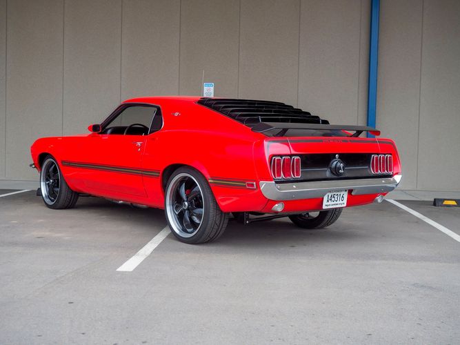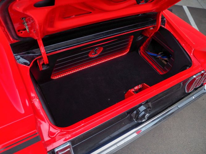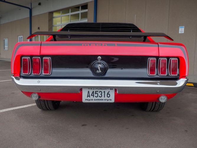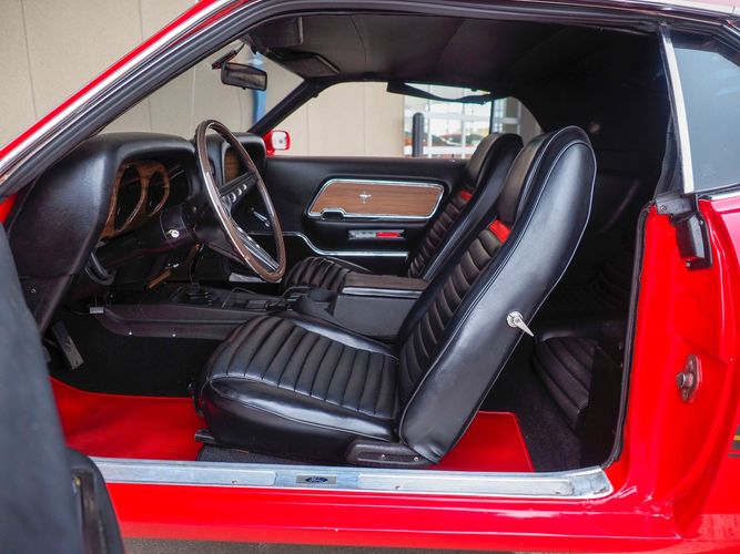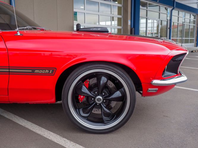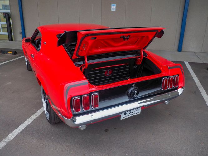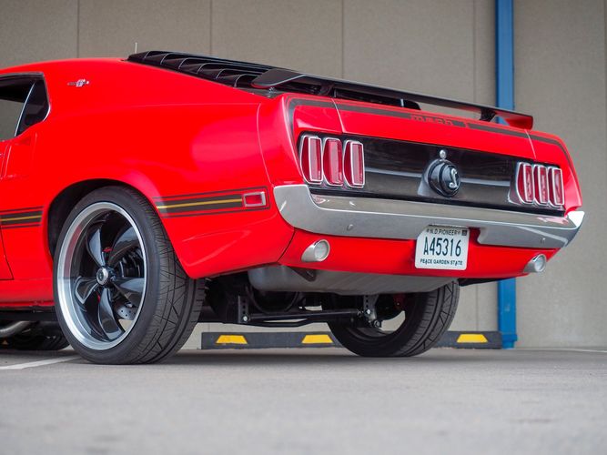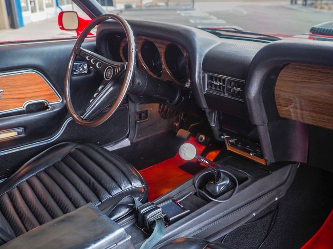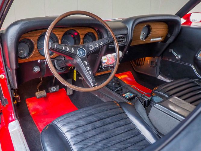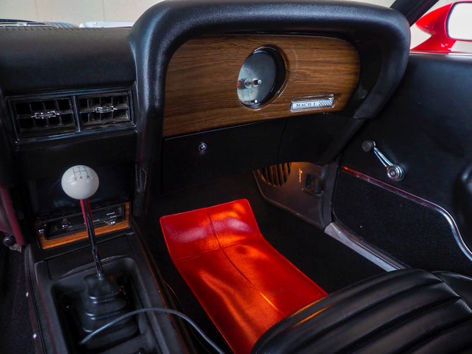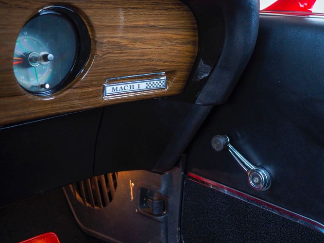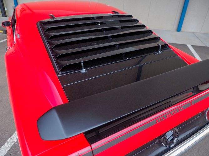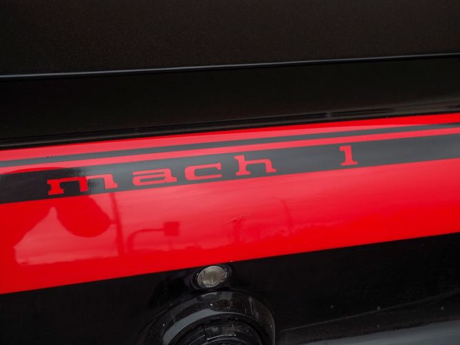 The interior is very nice, spacious and comfortable. It is complete with mostly new upholstery and an aftermarket sound system with a double din stereo, Bluetooth, amplifier, speakers and a sub. The trunk houses the sub and amplifier in a neat presentation with red LED lights. The red exterior paint finish has a great shine and looks sinister with the black 20'' wheels and black accents. It is complete with the rear spoiler package, window louvers and ram air hood. Overall, this Mach 1 is a professionally built pro-touring beast that can be driven in any situation and will turn heads everywhere you take it.