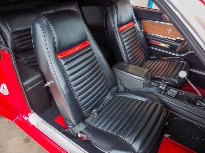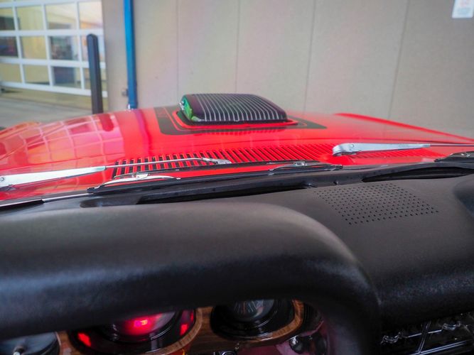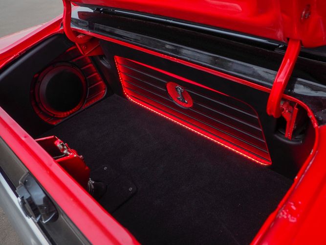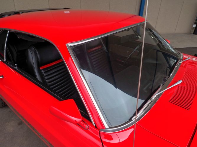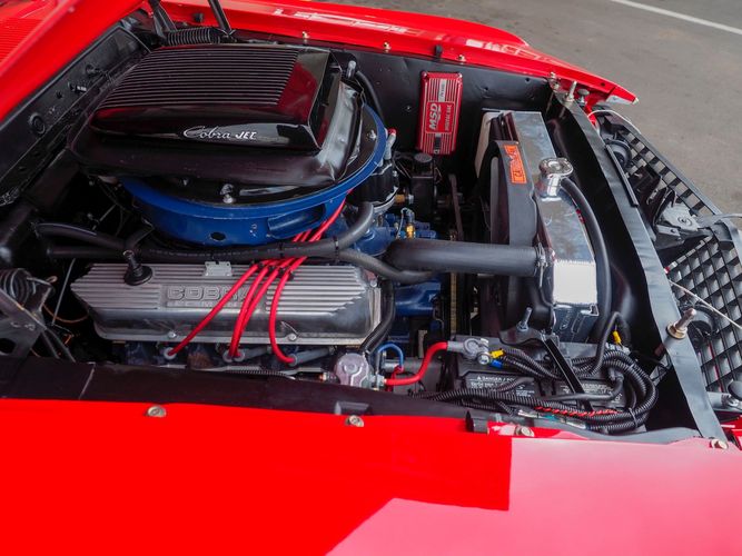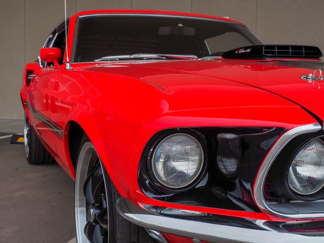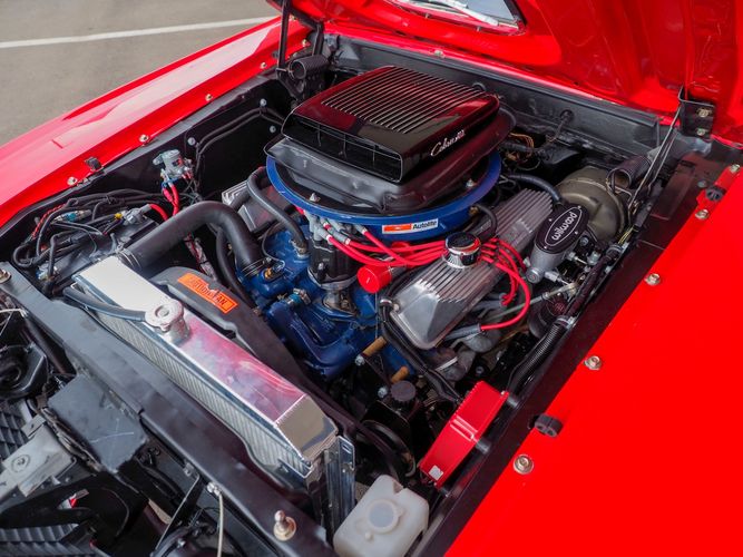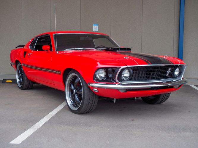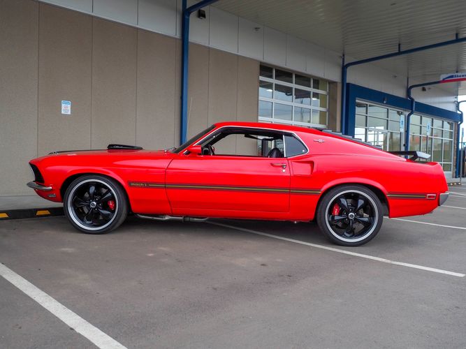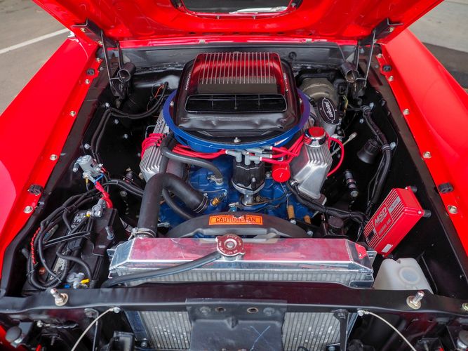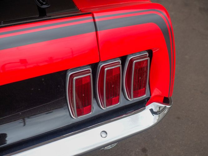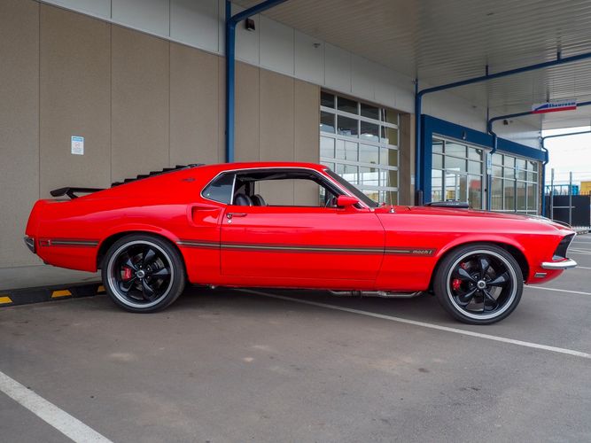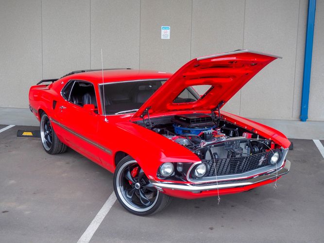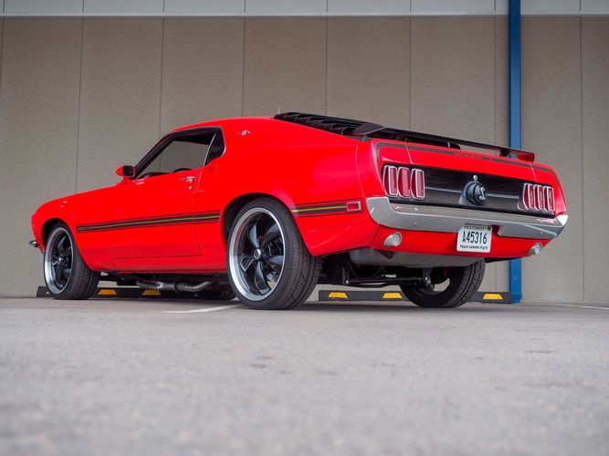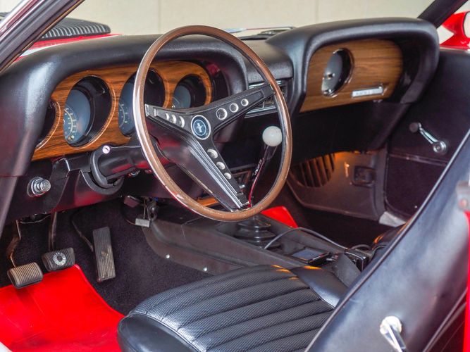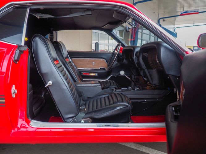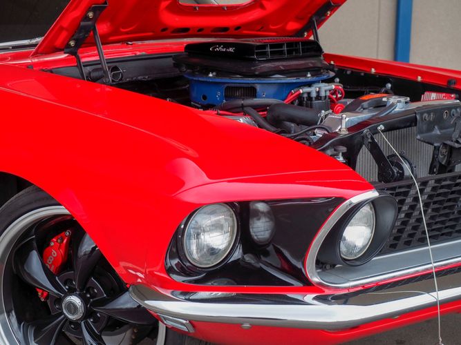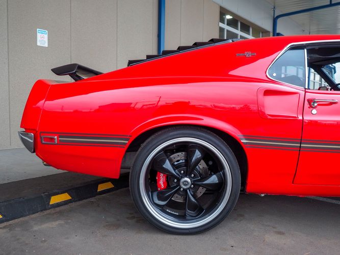 The interior is very nice, spacious and comfortable. It is complete with mostly new upholstery and an aftermarket sound system with a double din stereo, Bluetooth, amplifier, speakers and a sub. The trunk houses the sub and amplifier in a neat presentation with red LED lights. The red exterior paint finish has a great shine and looks sinister with the black 20'' wheels and black accents. It is complete with the rear spoiler package, window louvers and ram air hood. Overall, this Mach 1 is a professionally built pro-touring beast that can be driven in any situation and will turn heads everywhere you take it.