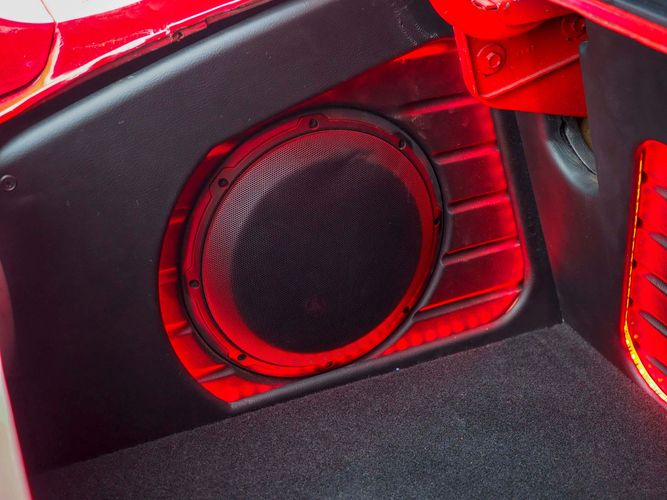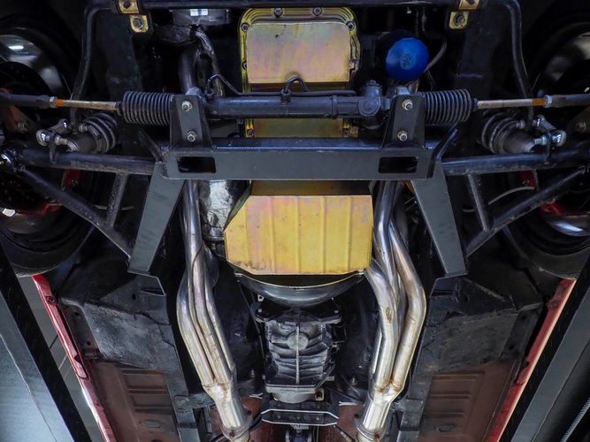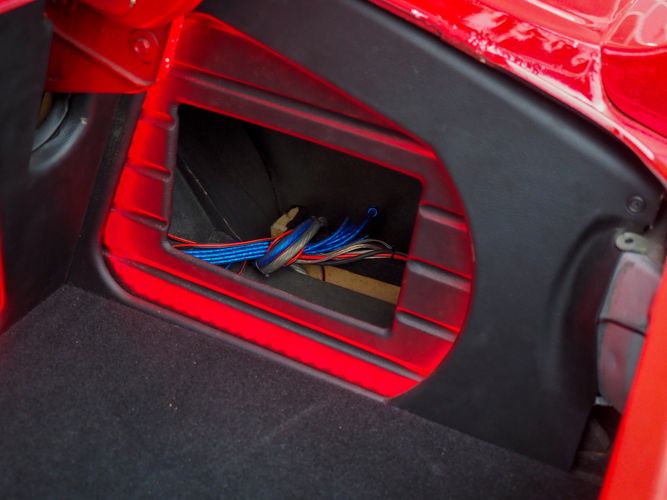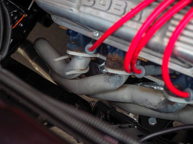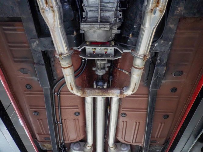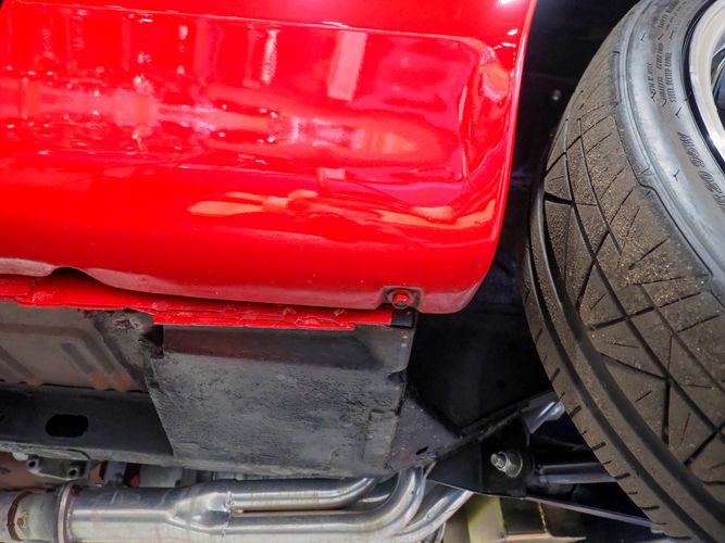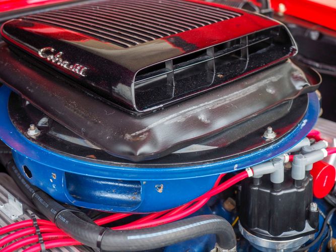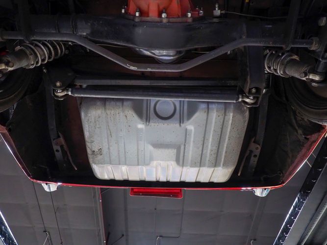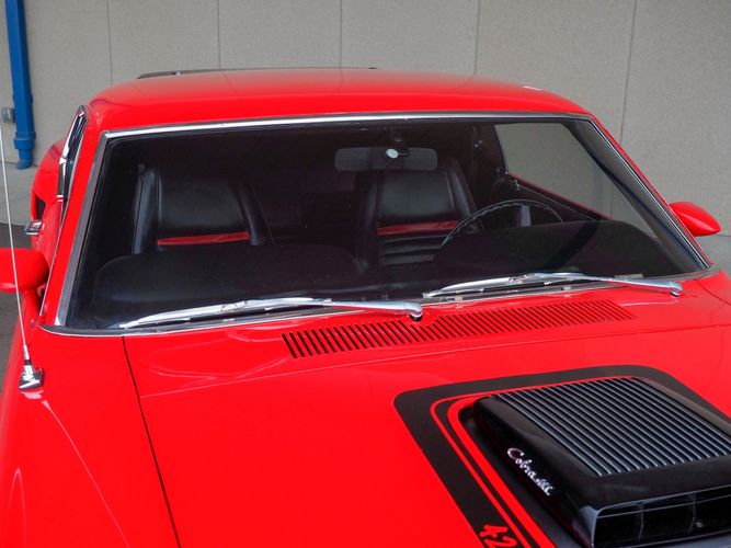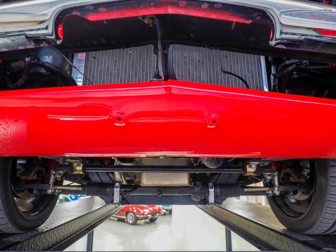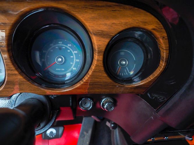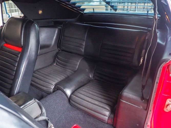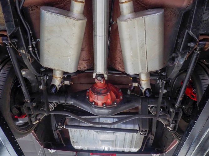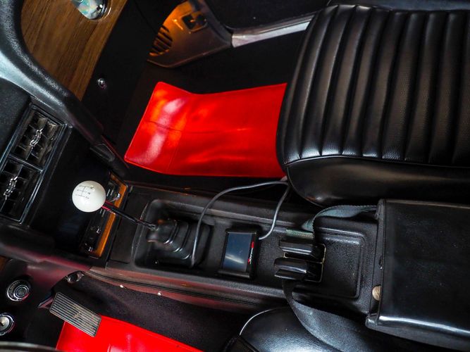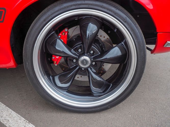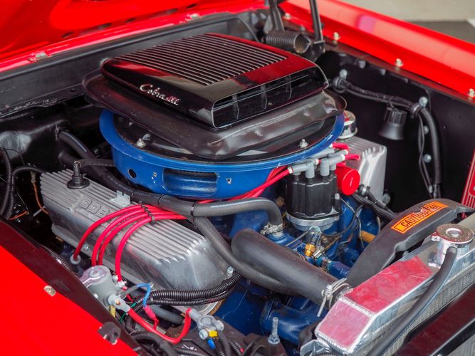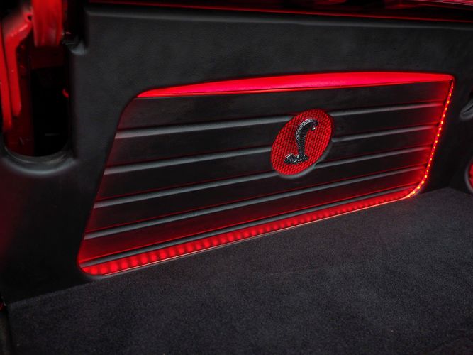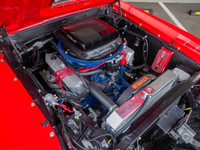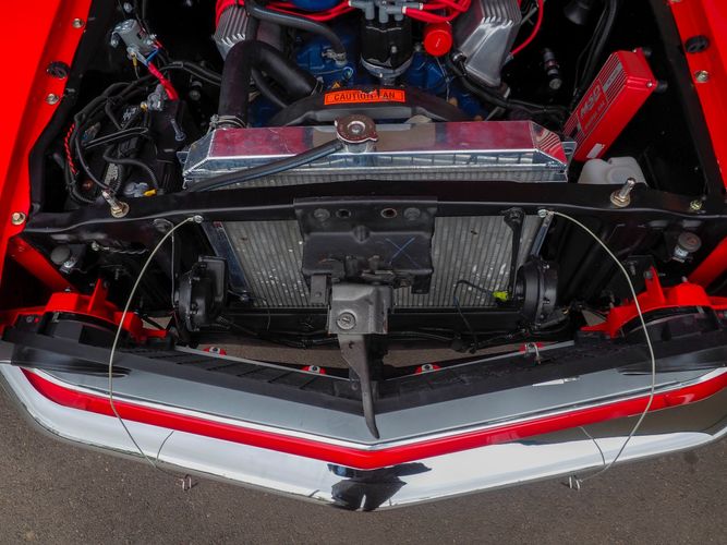 The interior is very nice, spacious and comfortable. It is complete with mostly new upholstery and an aftermarket sound system with a double din stereo, Bluetooth, amplifier, speakers and a sub. The trunk houses the sub and amplifier in a neat presentation with red LED lights. The red exterior paint finish has a great shine and looks sinister with the black 20'' wheels and black accents. It is complete with the rear spoiler package, window louvers and ram air hood. Overall, this Mach 1 is a professionally built pro-touring beast that can be driven in any situation and will turn heads everywhere you take it.