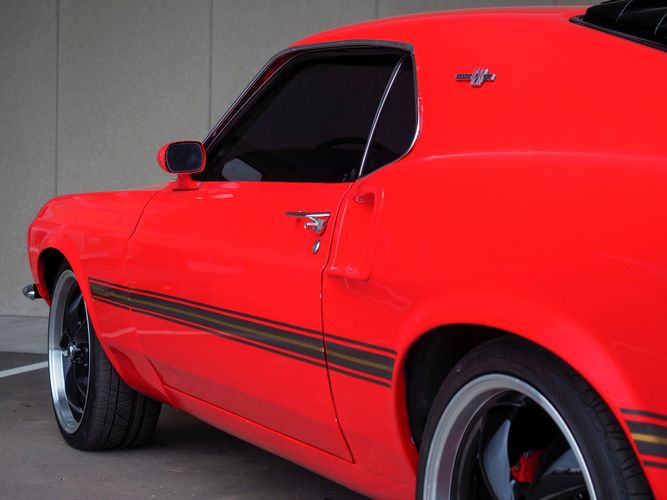 This is an excellent pro-touring 1969 Mustang Mach 1 owned by a current NFL Bronco player. No expense was spared when building the drivetrain and suspension of this Mach 1. The suspension is buttoned up nicely and feels like a modern car. It is equipped with 4-wheel Wilwood disc brakes, coil overs, 5-link rear suspension, power rack and pinion steering, tubular front A arms and a tubular K arm just to name a few of the top quality parts. Under the hood is a 428 Cobra Jet V8 engine that can put down some serious power. It is equipped with headers and a Holley Sniper fuel injection system to give it an unmatched throttle response and "throw you back" feel. The pro-touring suspension does a great job of harnessing the raw power and putting it on the ground. With the 5-speed Tremec manual transmission this car will cruise on the highway without missing a beat. The Wilwood brakes were much needed and have no problem bringing this Mustang to a halt quickly and safety. The suspension build has about 5,000 miles on it and the entire car is believed to have 81,000 miles.