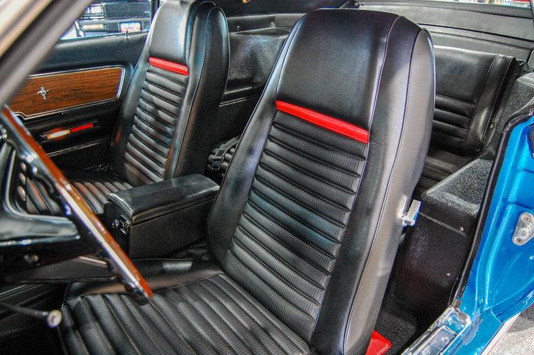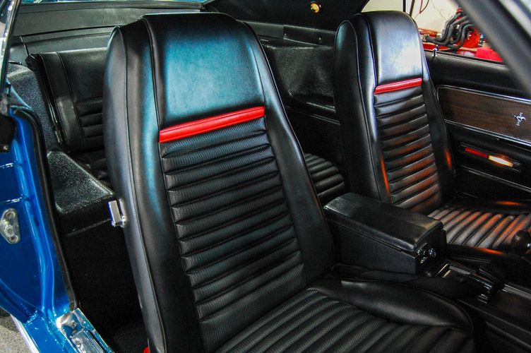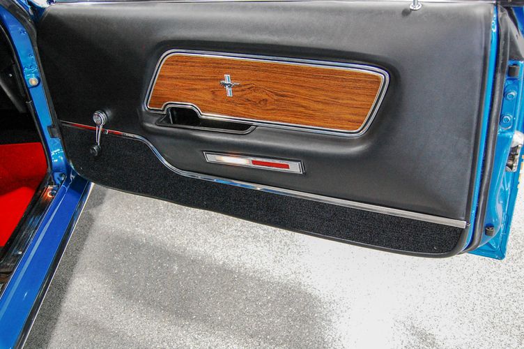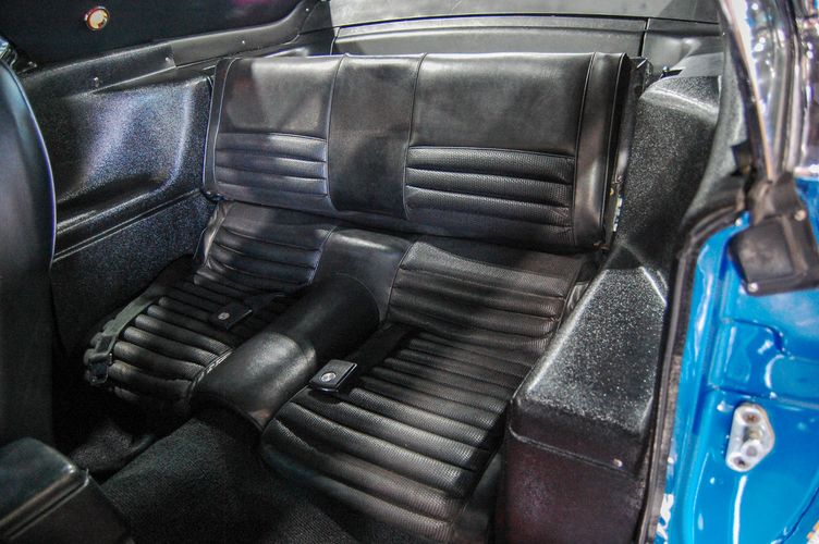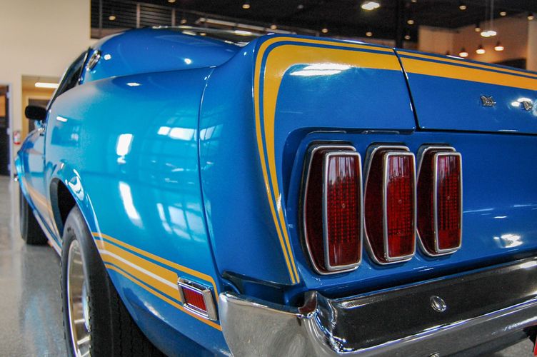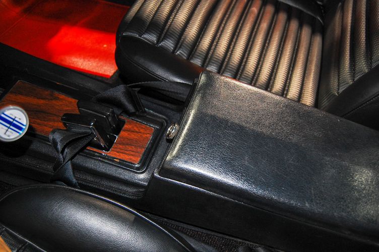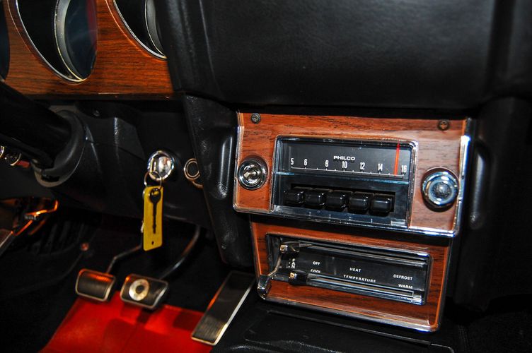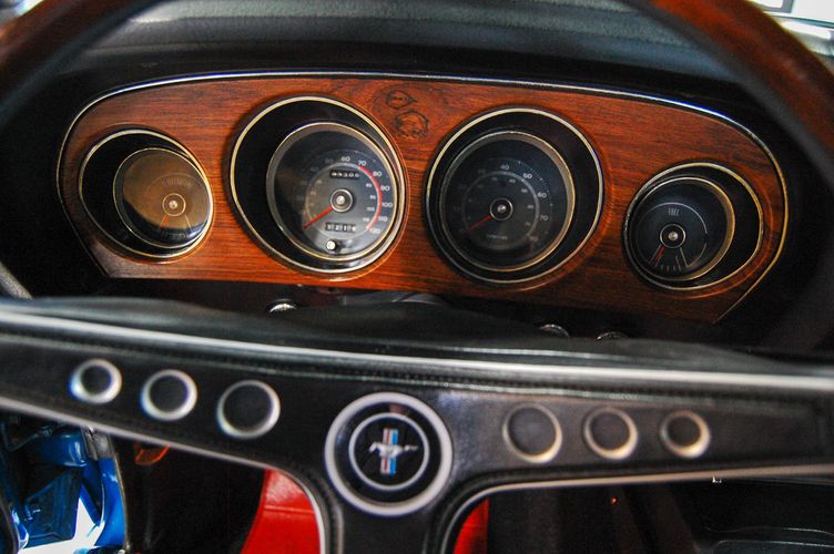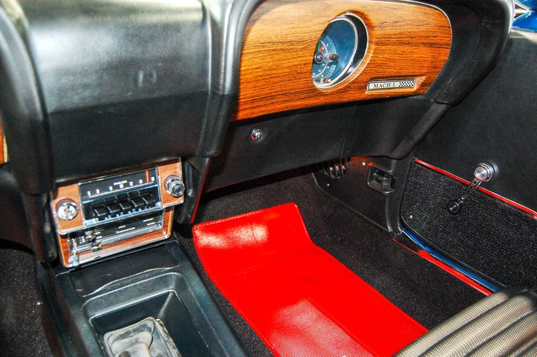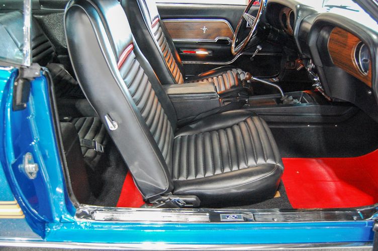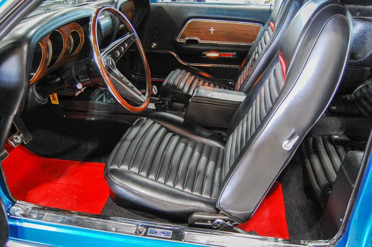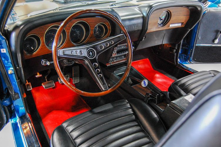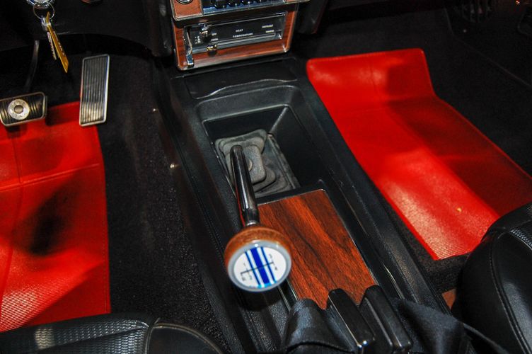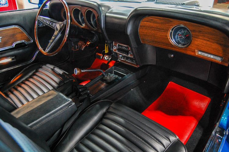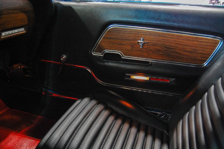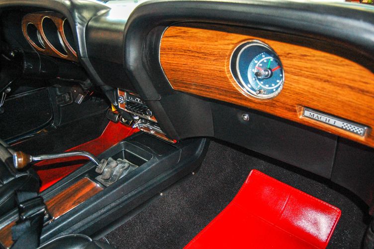 The 1969 Mach 1 added low-gloss hood paint on the cowl and hood, a sporting touch to prevent sun reflections; reflective side stripes and tail stripe; specific rocker moldings; pin-type hood lock latches; a pop-open gas cap; swing-out rear quarter windows; dual color-keyed sport mirrors; and tinted rear glass. Window louvers and front and rear spoilers were popular dealer add-ons that were unavailable until the Boss 302 came out mid-1969. They were not factory-installed. Mach 1 interiors consisted of high-back buckets with knitted vinyl, carpeting with integral red vinyl heel pads, console, wood-finish Rim-Blow steering wheel, clock, bright pedal pads, molded door panels with integral arm rests and safety/courtesy lights, Mach 1-specific teak-toned highlights on dash, console and door panels, and a special insulation package that added a whopping 55 pounds to the car. A tachometer was optional with all available engines. The 1969 Mustang interior color palette included an even dozen shades: white, two shades of black, four shades of blue, three shades of gold, plus dark red and a dark green.