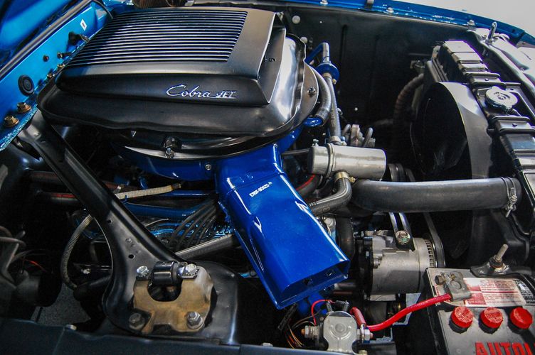 Ford officially offered a pair of 428 Cobra Jets: the Q-code standard-issue (non-ram-air) and the Ram Air R-code. Both had 10.6:1 compression. Both were rated at 335 horsepower. Other than the notion that the Q-code retained the dummy scoop and the R-code used a genuine Shaker, these engines were essentially the same. The 428CJ was treated to a set of deep-breathing heads from the 427 (2.09/1.65-inch valves, combustion chamber volumes between 73 and 75 cc, larger intake and exhaust ports, 427 valve springs and dampers), a 735-cfm Holley four-barrel carb, and freer-breathing exhaust manifolds, along with beefier connecting rods. The 428CJ's actual power output is reputed to be well north of 400 hp, with its advertised numbers artificially lowered to help keep the insurance companies from jacking up its rates. Car and Driver tested a 1969 428CJ-powered Mach 1, and by doing back-to-back runs with the scoop both taped shut and unimpeded, they discovered that the extra rush of air was worth two-tenths and about 2 MPH in the quarter-mile.